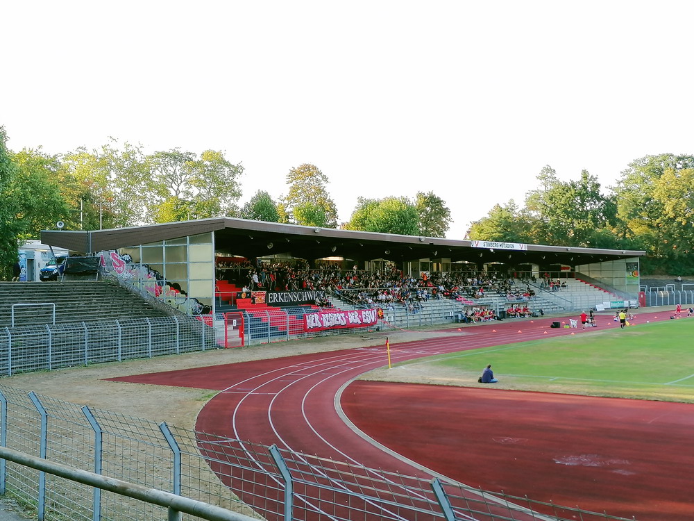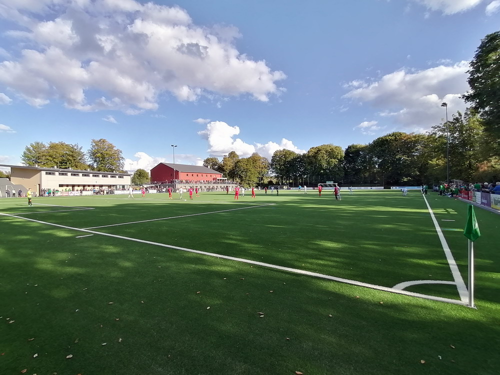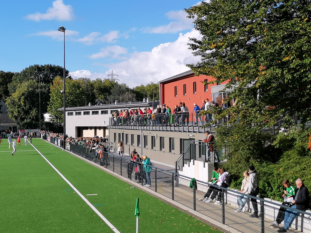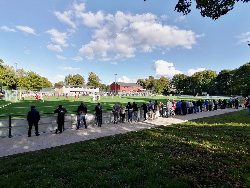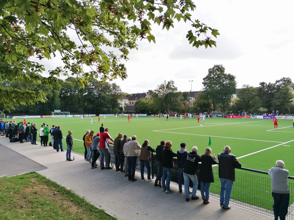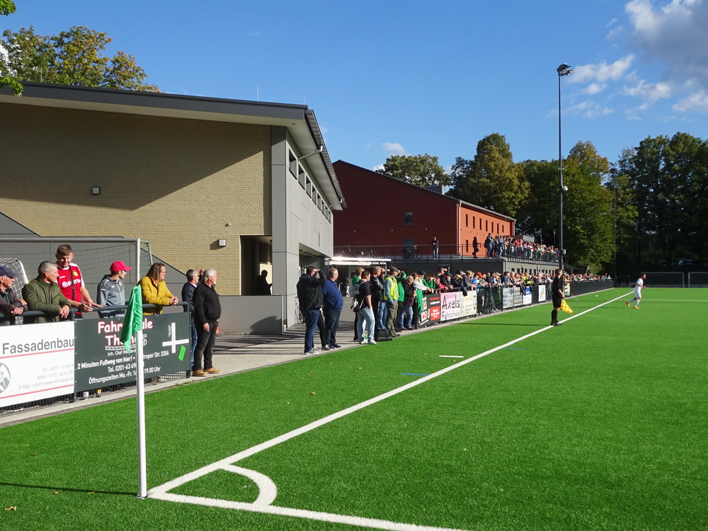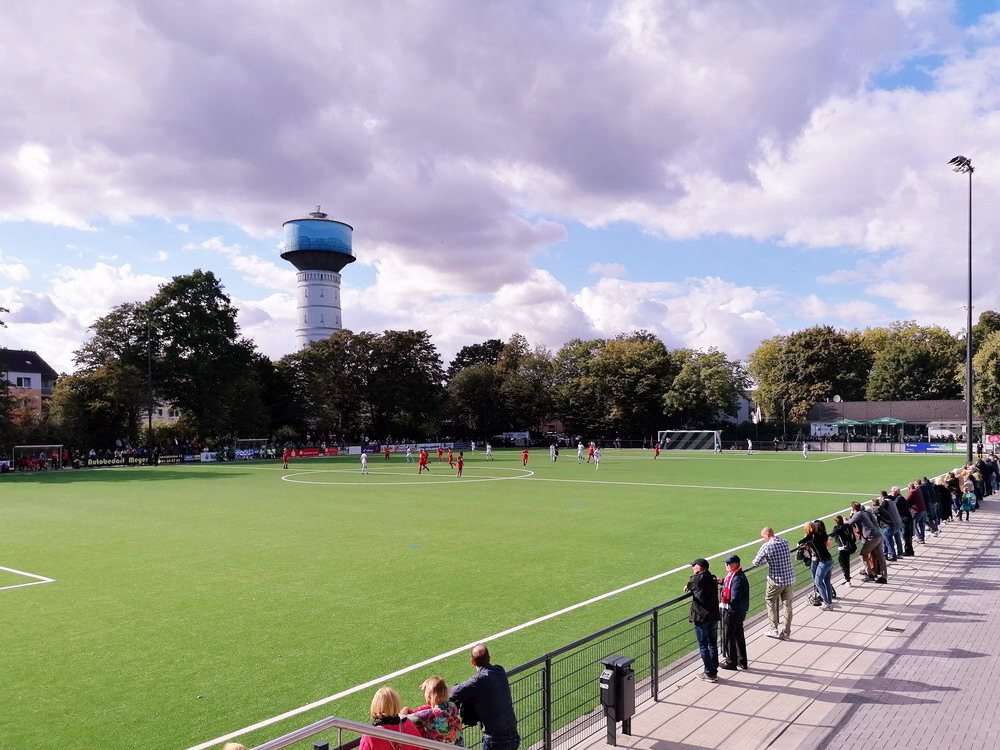 Die guten Leistungen locken nun auch deutlich mehr Zuschauer an. Beinahe 400 Augenpaare verfolgten die Partie gegen die Wülfrather, die in den frühen 90ern als Oberligist sogar drittklassig gespielt haben. Die aktuelle Lage ist eine andere, denn der Club ist punktlos mit vielen Gegentoren das Schlusslicht der Liga. Es war früh abzusehen, dass sich auch heute nicht viel daran ändern sollte, denn zu überlegen spielten die Gastgeber auf. Es macht wirklich Spaß zuzusehen, die Mannschaft bietet wirklich einen sehenswerten Offensiv-Fußball und darf dabei auf eine souveräne Defensiv-Reihe vertrauen. Bis die Nuss mit dem ersten Treffer geknackt war, dauerte es zwar beinahe bis zum Halbzeitpfiff, aber es war halt nur eine Frage der Zeit. Im zweiten Durchgang wurde die Partie dann früh entschieden, spannend war es natürlich nie. Der Hexenkessel am Wasserturm wurde in den letzten Jahren zu einem wahren Schmuckkästchen ausgebaut. Ausbau in Form von Traversen oder Tribünen sucht man zwar am Hauptplatz vergebens, aber dieser hat ja dennoch Charme und ich habe dort selbst auch immer gern gekickt. Der alte Container-Kabinentrakt ist einem schicken zweigeschossigen Sozialbau gewichen und die alte Turnhalle mitsamt den Katakomben wurde aufgehübscht. Der Hauptplatz hat im vergangenen Jahr eine neue Plastikwiese erhalten, nachdem der alte Belag kaputtgelaufen war und der ehemalige Ascheplatz ist ebenfalls einem Kunstrasen gewichen. Auch der kleine Jugendplatz hat einen Kunstrasen erhalten. Es ist nun sicherlich eine der schönsten Anlagen auf Essener Boden.