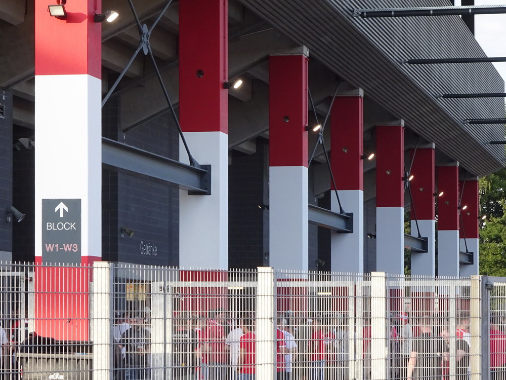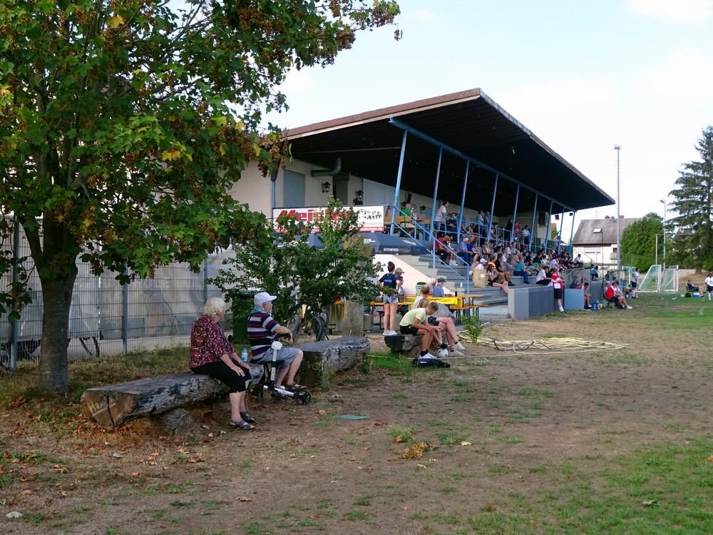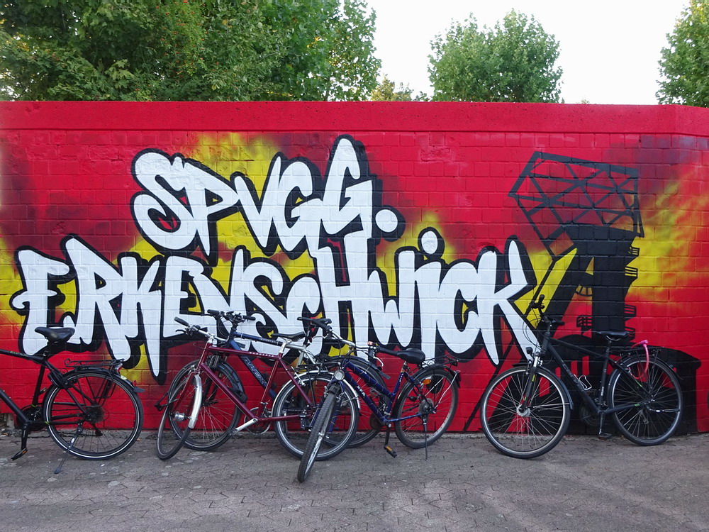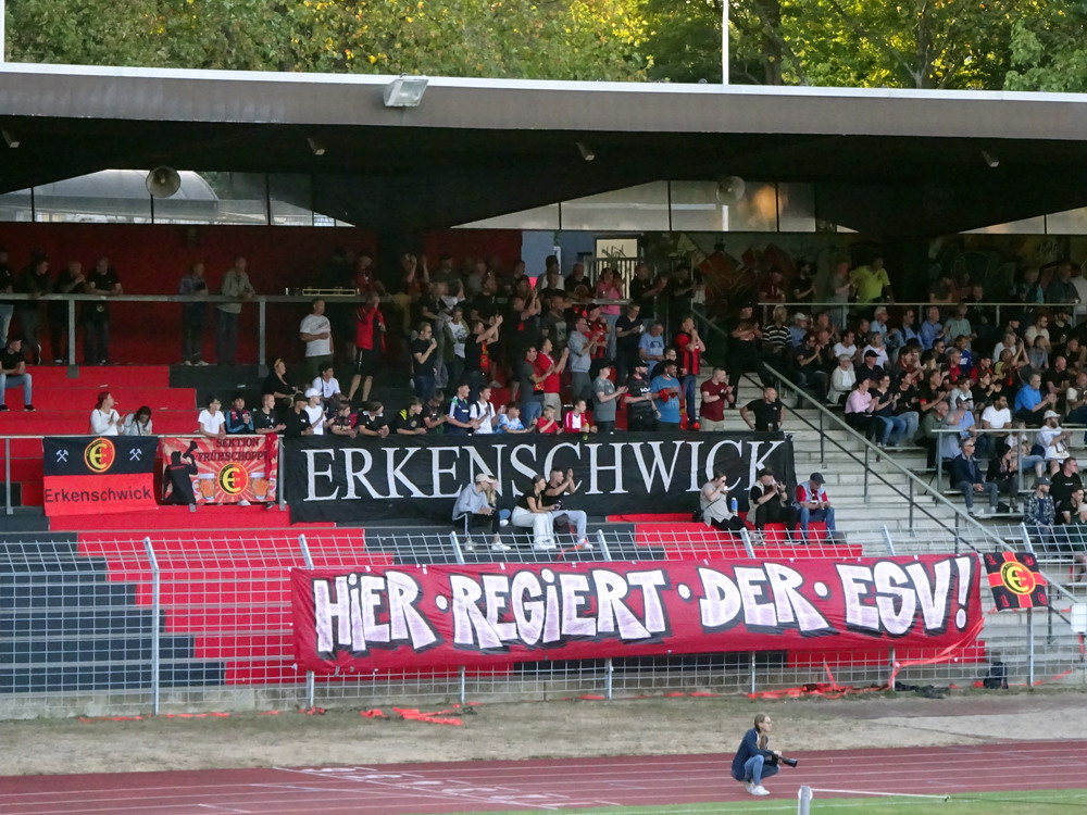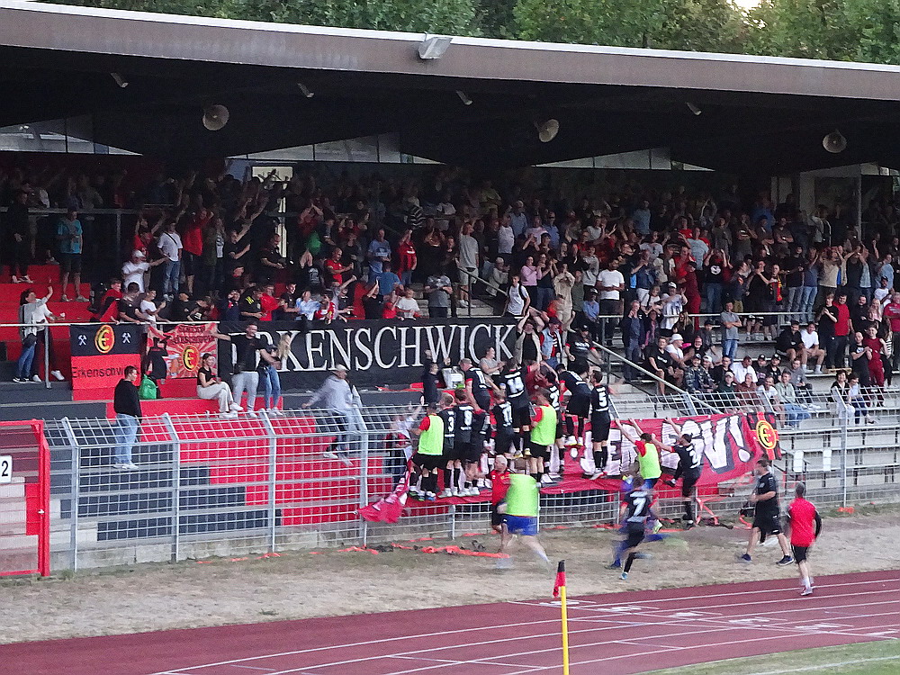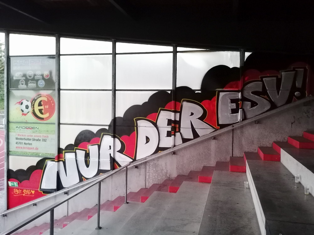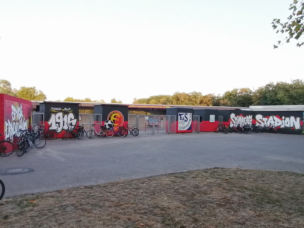 Die guten Leistungen locken nun auch deutlich mehr Zuschauer an. Beinahe 400 Augenpaare verfolgten die Partie gegen die Wülfrather, die in den frühen 90ern als Oberligist sogar drittklassig gespielt haben. Die aktuelle Lage ist eine andere, denn der Club ist punktlos mit vielen Gegentoren das Schlusslicht der Liga. Es war früh abzusehen, dass sich auch heute nicht viel daran ändern sollte, denn zu überlegen spielten die Gastgeber auf. Es macht wirklich Spaß zuzusehen, die Mannschaft bietet wirklich einen sehenswerten Offensiv-Fußball und darf dabei auf eine souveräne Defensiv-Reihe vertrauen. Bis die Nuss mit dem ersten Treffer geknackt war, dauerte es zwar beinahe bis zum Halbzeitpfiff, aber es war halt nur eine Frage der Zeit. Im zweiten Durchgang wurde die Partie dann früh entschieden, spannend war es natürlich nie. Der Hexenkessel am Wasserturm wurde in den letzten Jahren zu einem wahren Schmuckkästchen ausgebaut. Ausbau in Form von Traversen oder Tribünen sucht man zwar am Hauptplatz vergebens, aber dieser hat ja dennoch Charme und ich habe dort selbst auch immer gern gekickt. Der alte Container-Kabinentrakt ist einem schicken zweigeschossigen Sozialbau gewichen und die alte Turnhalle mitsamt den Katakomben wurde aufgehübscht. Der Hauptplatz hat im vergangenen Jahr eine neue Plastikwiese erhalten, nachdem der alte Belag kaputtgelaufen war und der ehemalige Ascheplatz ist ebenfalls einem Kunstrasen gewichen. Auch der kleine Jugendplatz hat einen Kunstrasen erhalten. Es ist nun sicherlich eine der schönsten Anlagen auf Essener Boden.