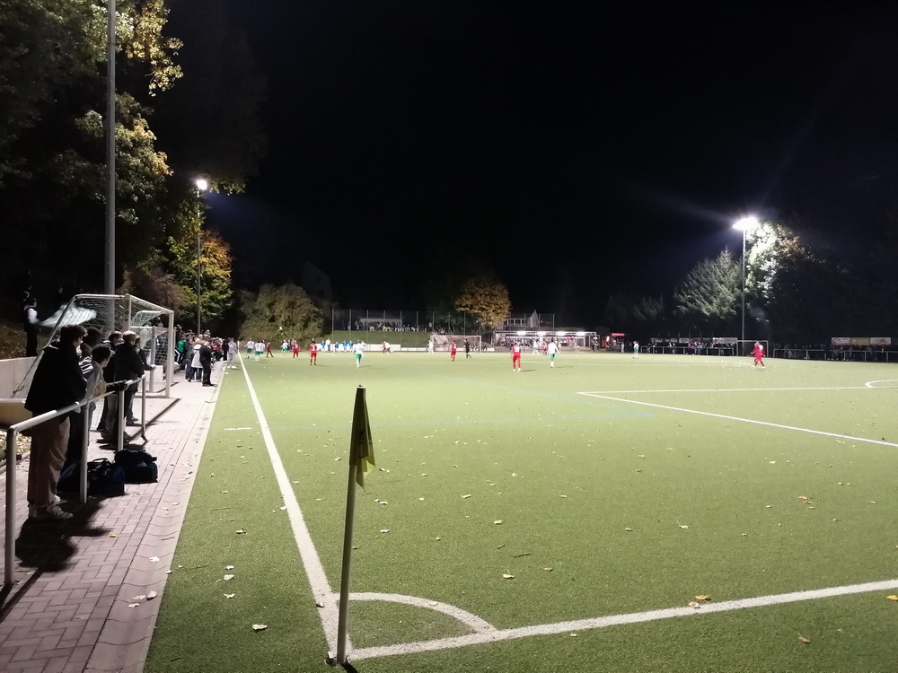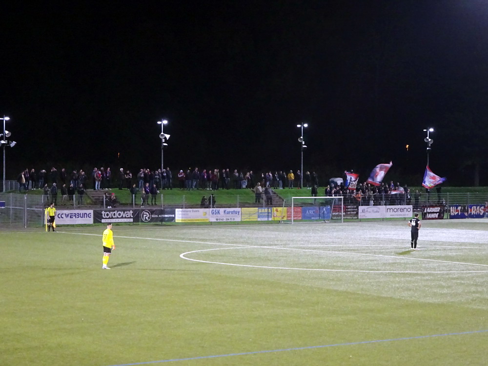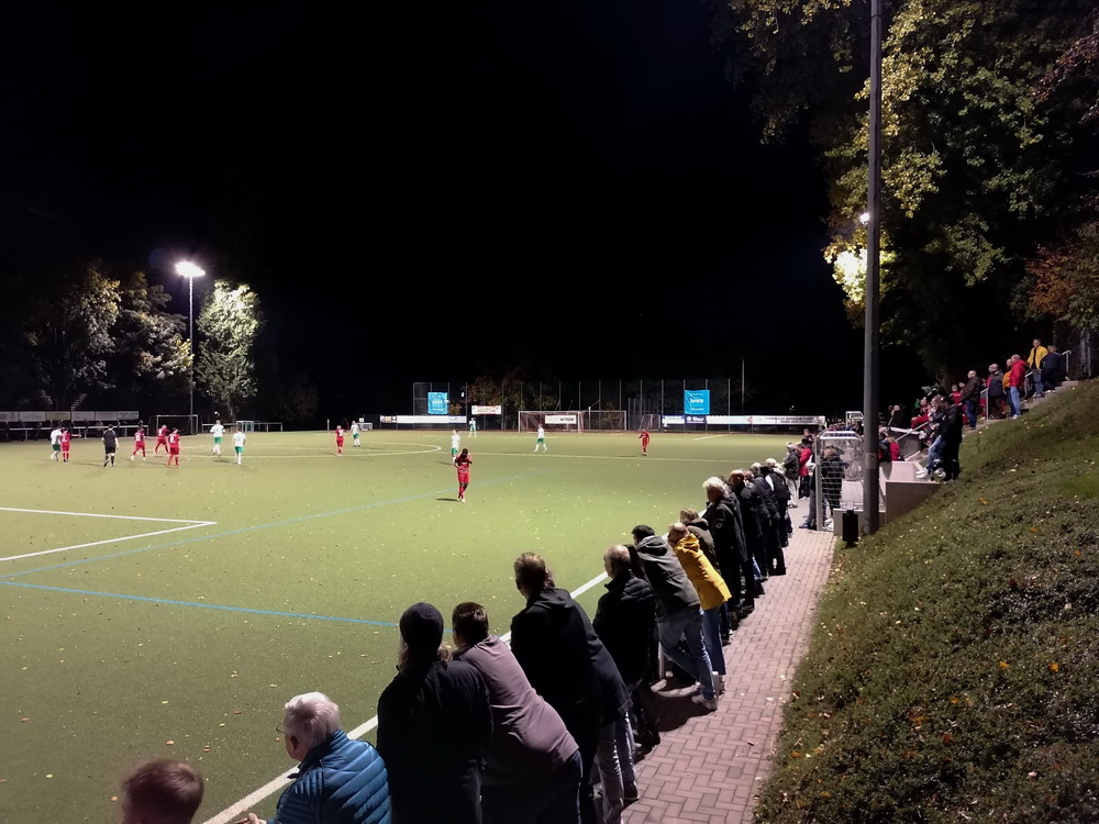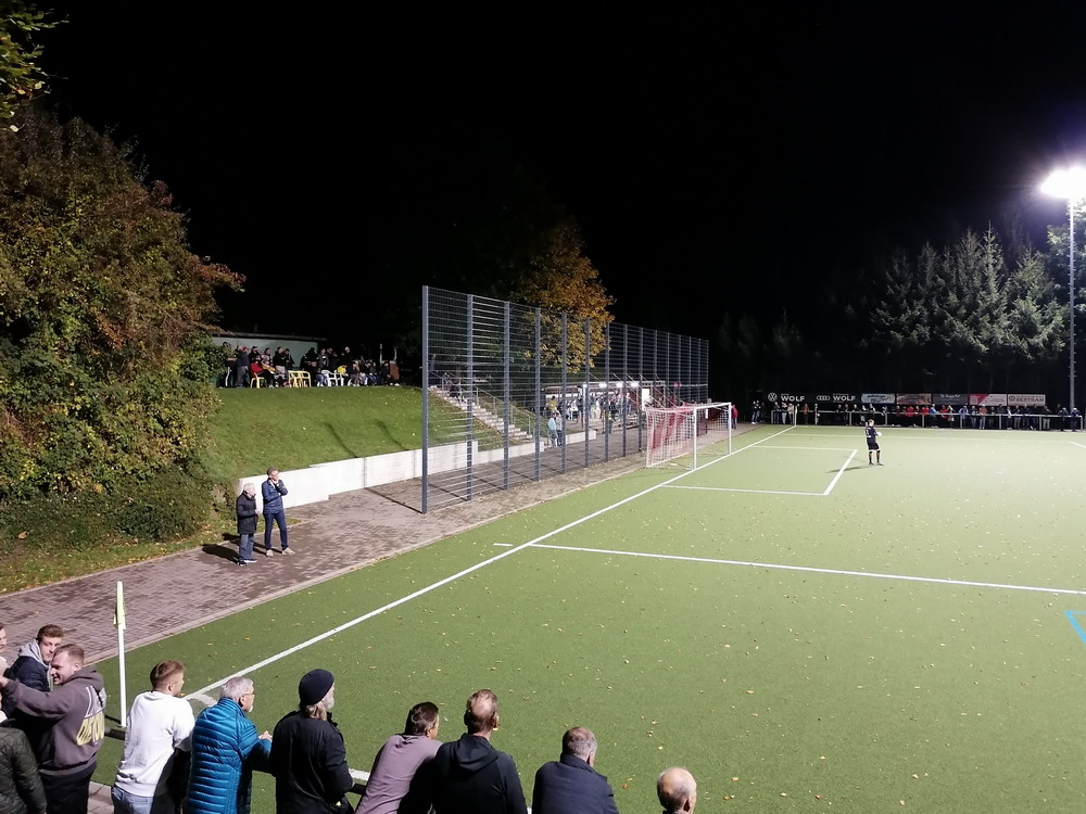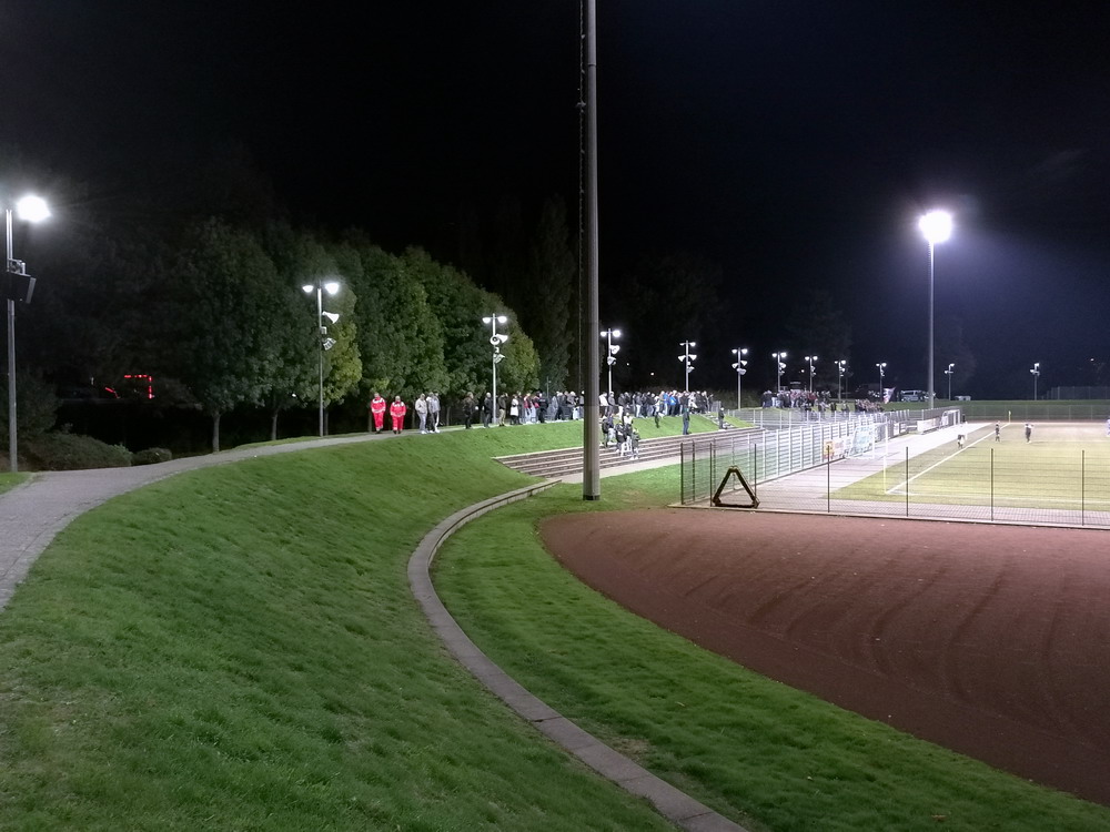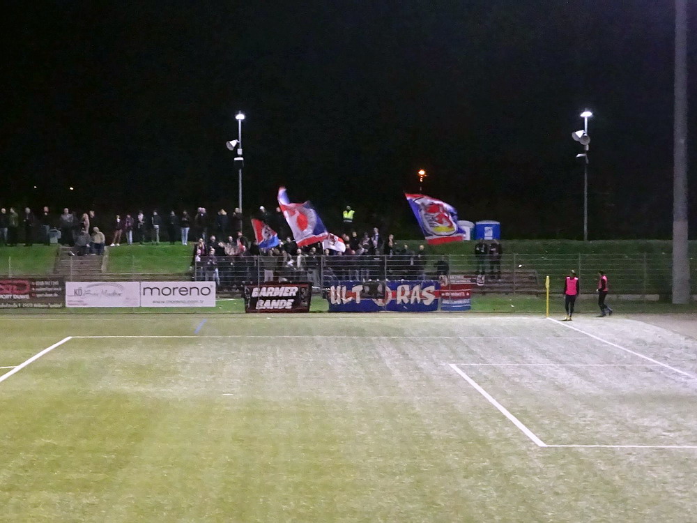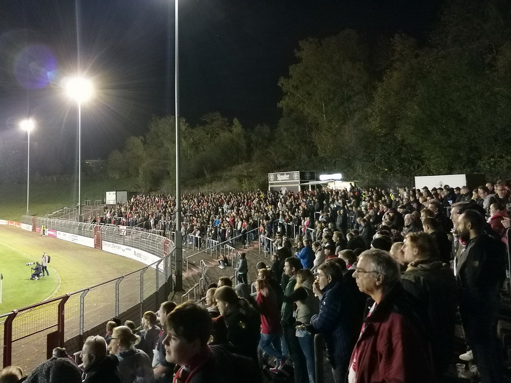 Der zweite Treffer für die Gastgeber ließ mich schon mal die Augenbrauen heben und die Turner blieben weiter am Drücker. Belohnt wurde der engagierte Auftritt des Underdogs mit dem Ausgleich in der Schlussminute. Bei dieser Kopfball-Bogenlampe sah Ersatzschnapper Wienand auch nicht gerade gut aus und der gesamte Kader des ETB begrub den Torschützen unter sich. Im guten Glauben hatte ich mich sogar schon Richtung Ausgang begeben, um schnell nach Hause zu kommen, stattdessen konnte nun zu meinen Leuten zurückkehren. Auch in der Verlängerung waren die Gastgeber das agilere Team, auch wenn es nun wieder ausgeglichener aussah. Allerdings fielen die Schwarz-Weißen auch durch erstaunlich viele Krämpfe und sich ewig ziehende Auswechslungen auf, das verwässerte den guten Eindruck etwas. Keine Treffer fielen mehr in der Extra-Time, es ging ins Penalty-Schießen, womit sich mein individuelles Gefühl von ‚sicher weiter‘ vor der Halbzeit zu ‚ausgeschieden‘ vor dem Elfer-Kicken wandelte, denn zuletzt konnte kein Rot-Weisser großartig glänzen, wenn vom Punkt geschossen wurde. Aber jede Serie reißt irgendwann und während ein ETB-Recke den Ball Uli Hoeneß-like in den Nachthimmel jagte und ein anderer am RWE-Keeper scheiterte, verwandelten alle Roten vom Punkt und der RWE kam mit einem ganz dicken blauen Auge davon und sprang der Blamage noch soeben von der Schippe.