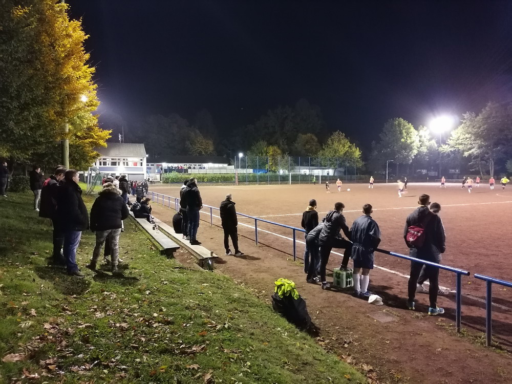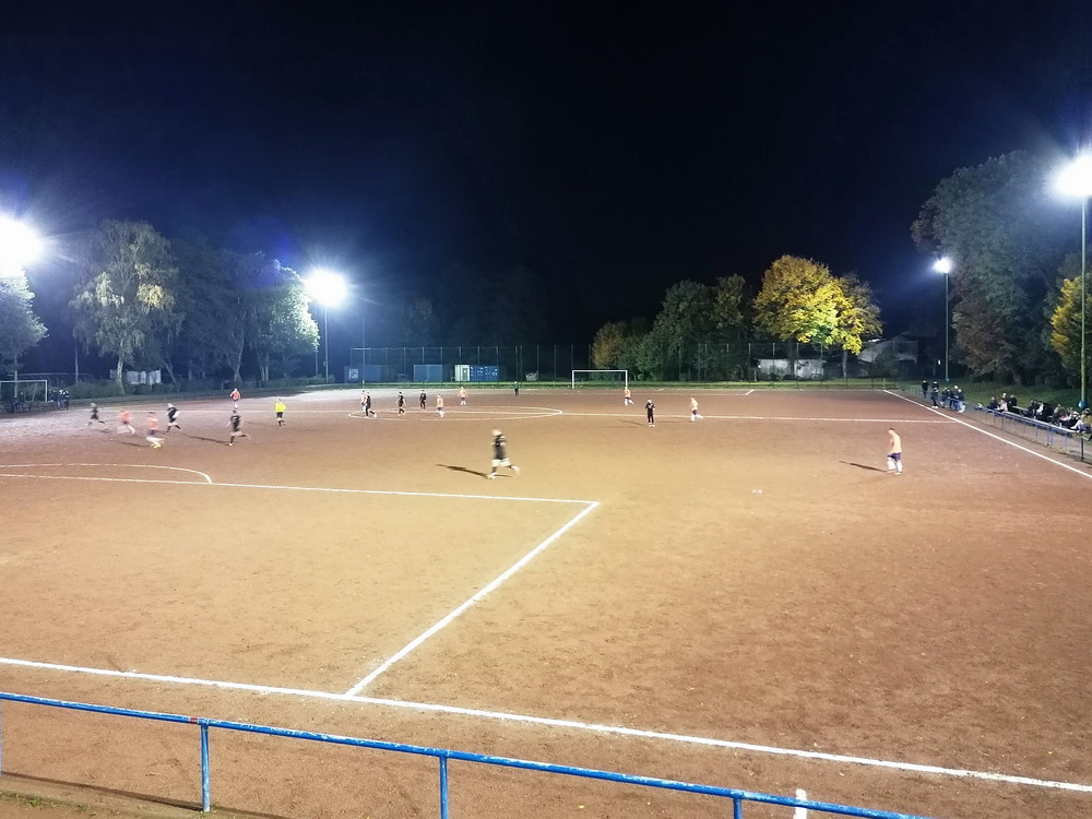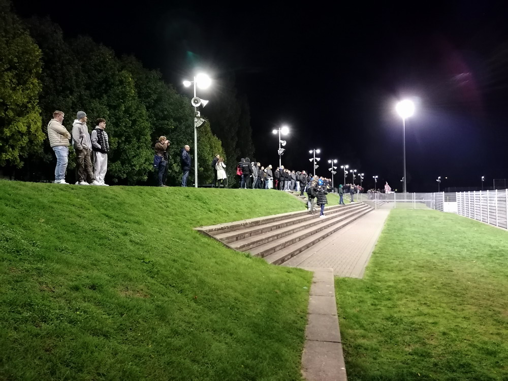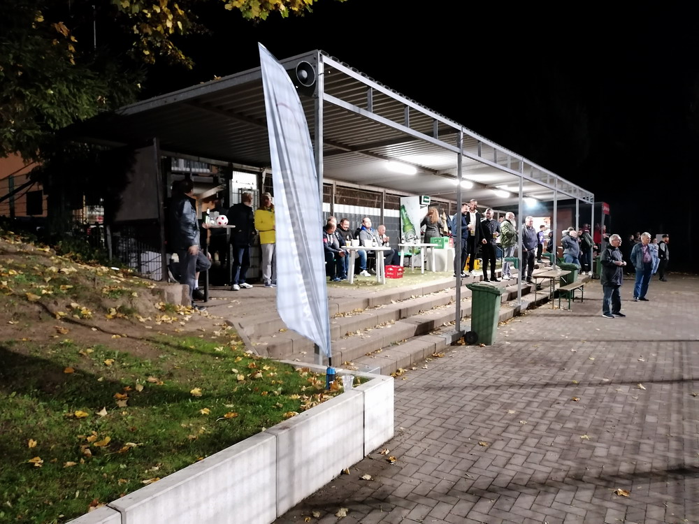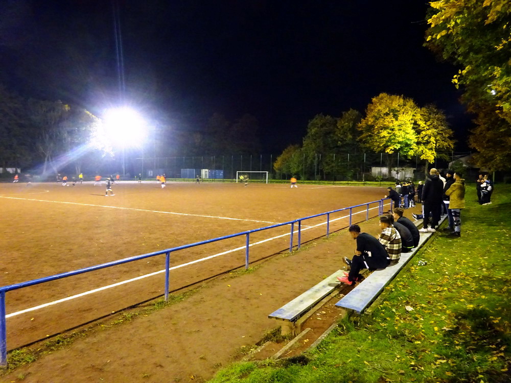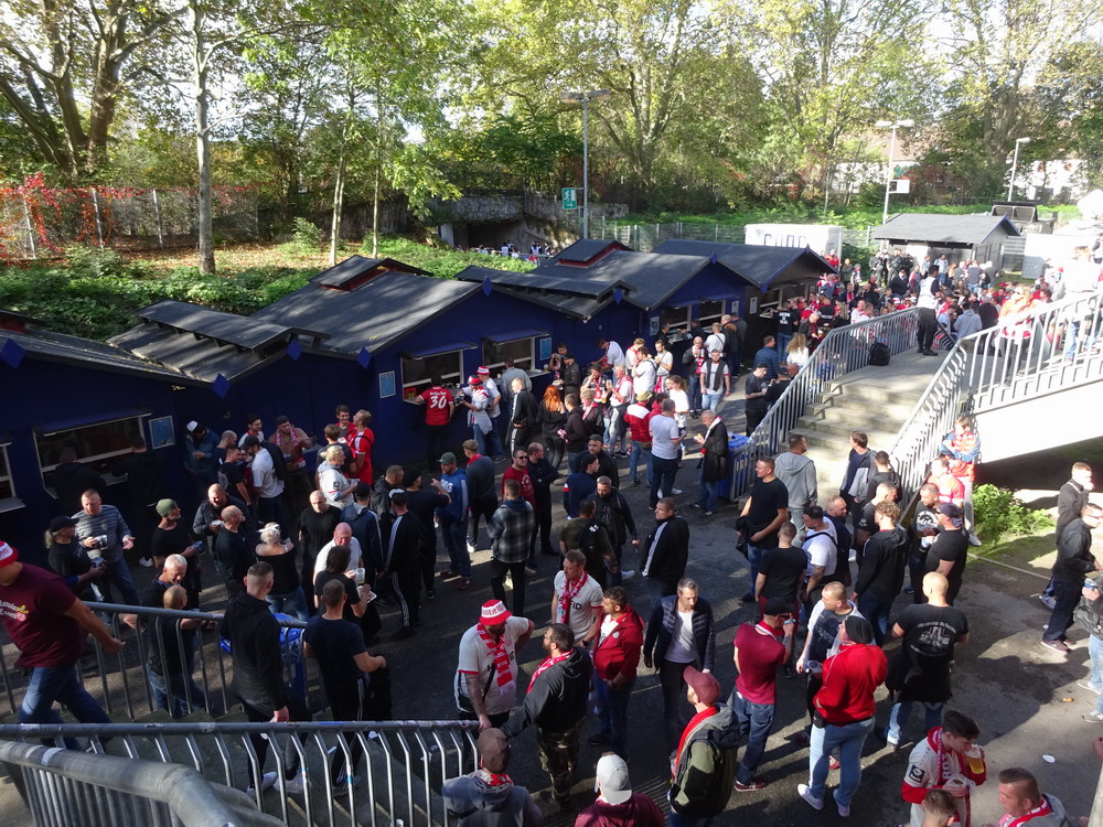Der zweite Treffer für die Gastgeber ließ mich schon mal die Augenbrauen heben und die Turner blieben weiter am Drücker. Belohnt wurde der engagierte Auftritt des Underdogs mit dem Ausgleich in der Schlussminute. Bei dieser Kopfball-Bogenlampe sah Ersatzschnapper Wienand auch nicht gerade gut aus und der gesamte Kader des ETB begrub den Torschützen unter sich. Im guten Glauben hatte ich mich sogar schon Richtung Ausgang begeben, um schnell nach Hause zu kommen, stattdessen konnte nun zu meinen Leuten zurückkehren. Auch in der Verlängerung waren die Gastgeber das agilere Team, auch wenn es nun wieder ausgeglichener aussah. Allerdings fielen die Schwarz-Weißen auch durch erstaunlich viele Krämpfe und sich ewig ziehende Auswechslungen auf, das verwässerte den guten Eindruck etwas. Keine Treffer fielen mehr in der Extra-Time, es ging ins Penalty-Schießen, womit sich mein individuelles Gefühl von ‚sicher weiter‘ vor der Halbzeit zu ‚ausgeschieden‘ vor dem Elfer-Kicken wandelte, denn zuletzt konnte kein Rot-Weisser großartig glänzen, wenn vom Punkt geschossen wurde. Aber jede Serie reißt irgendwann und während ein ETB-Recke den Ball Uli Hoeneß-like in den Nachthimmel jagte und ein anderer am RWE-Keeper scheiterte, verwandelten alle Roten vom Punkt und der RWE kam mit einem ganz dicken blauen Auge davon und sprang der Blamage noch soeben von der Schippe.