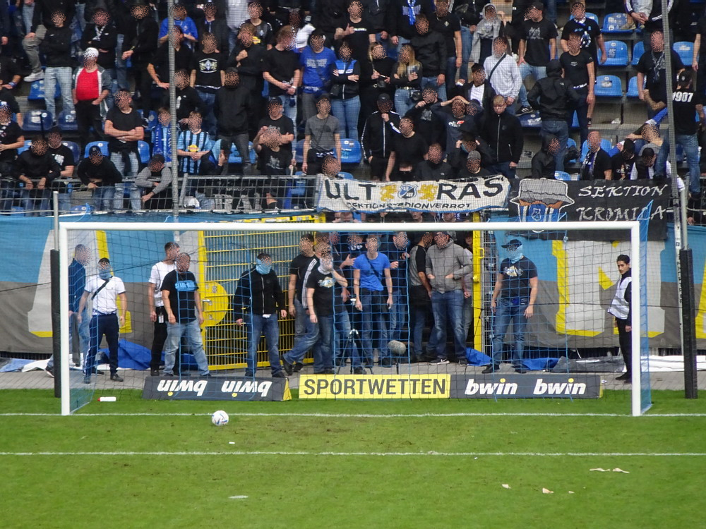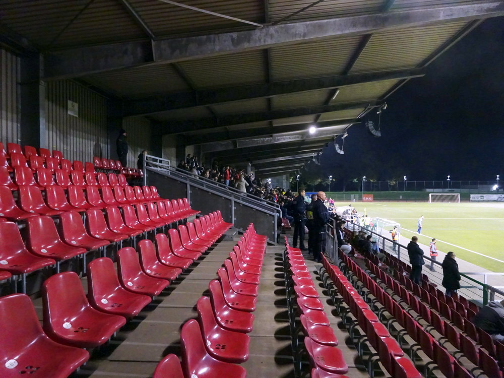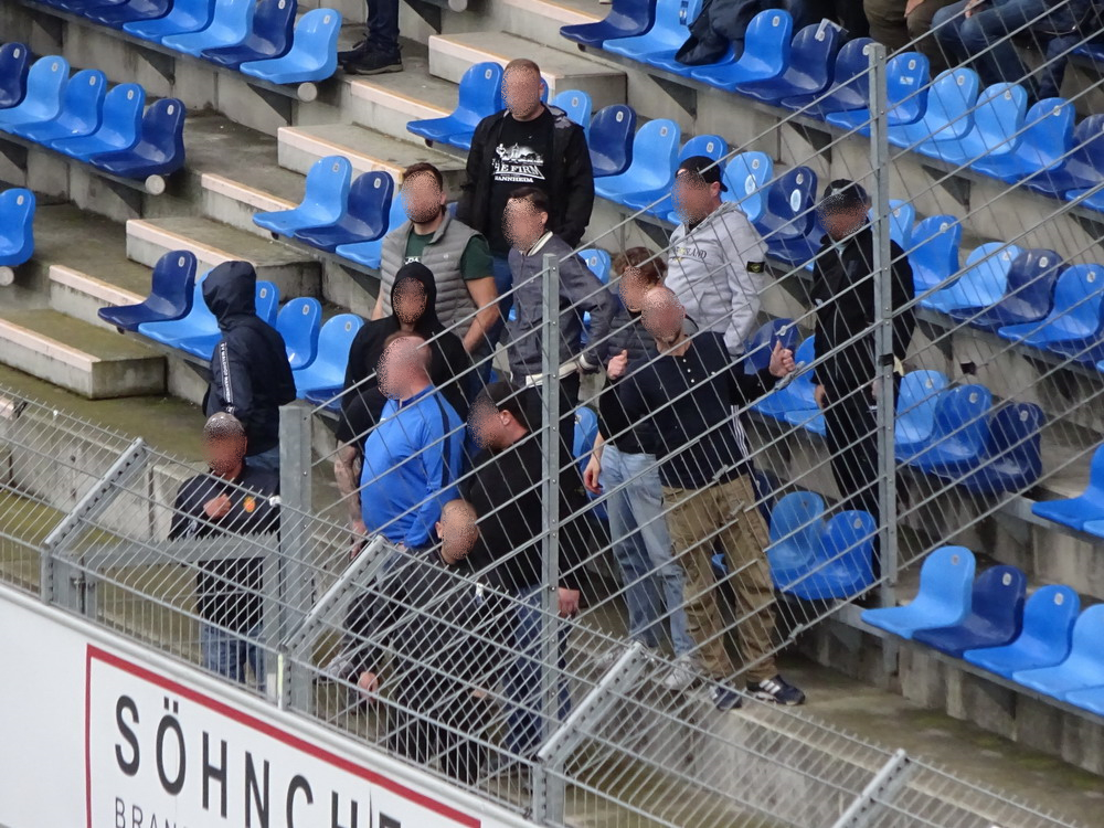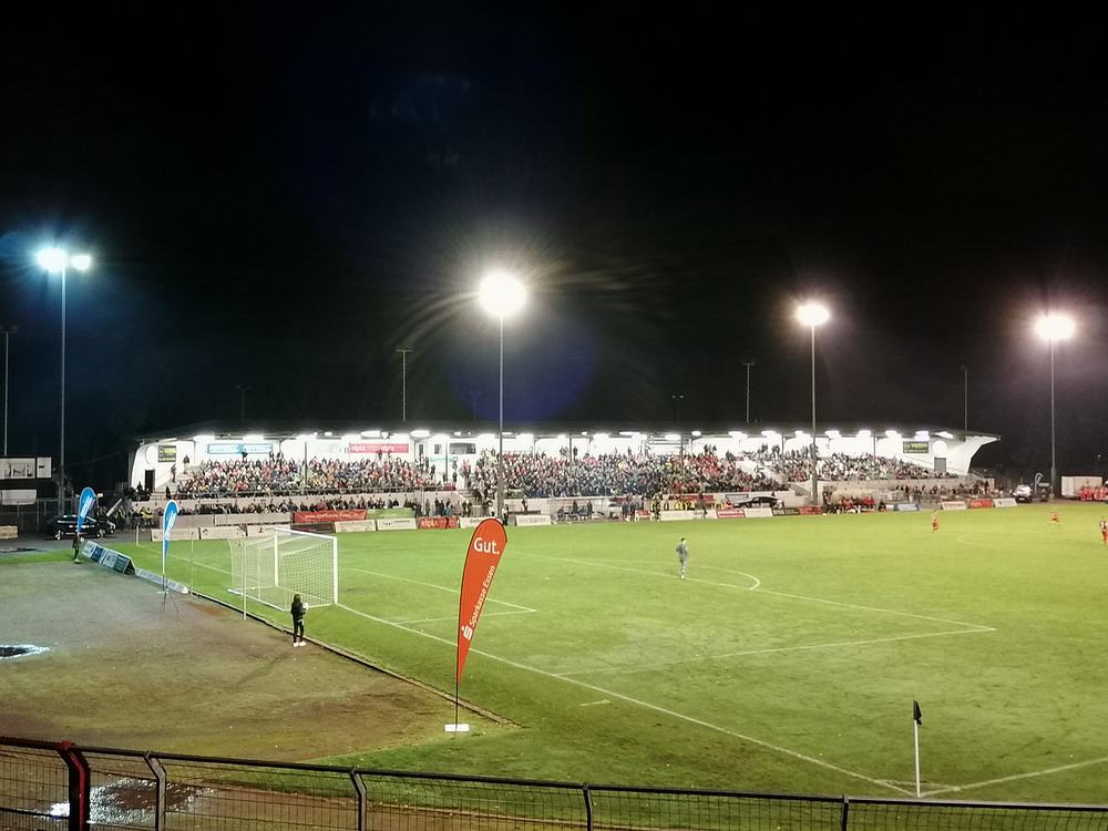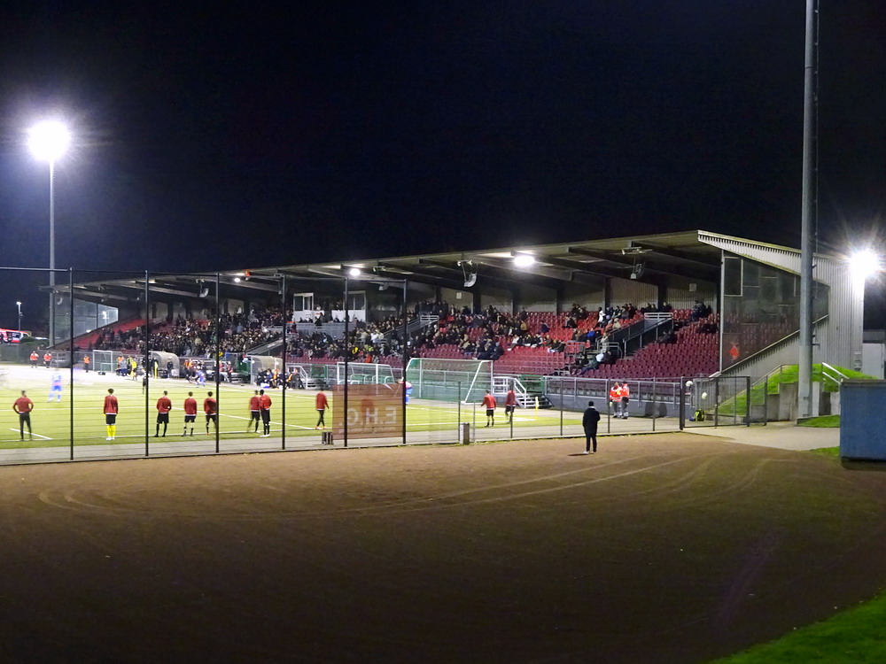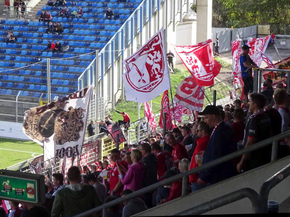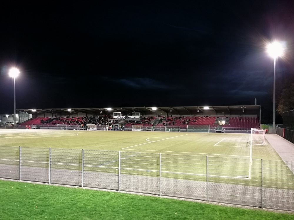 Der zweite Treffer für die Gastgeber ließ mich schon mal die Augenbrauen heben und die Turner blieben weiter am Drücker. Belohnt wurde der engagierte Auftritt des Underdogs mit dem Ausgleich in der Schlussminute. Bei dieser Kopfball-Bogenlampe sah Ersatzschnapper Wienand auch nicht gerade gut aus und der gesamte Kader des ETB begrub den Torschützen unter sich. Im guten Glauben hatte ich mich sogar schon Richtung Ausgang begeben, um schnell nach Hause zu kommen, stattdessen konnte nun zu meinen Leuten zurückkehren. Auch in der Verlängerung waren die Gastgeber das agilere Team, auch wenn es nun wieder ausgeglichener aussah. Allerdings fielen die Schwarz-Weißen auch durch erstaunlich viele Krämpfe und sich ewig ziehende Auswechslungen auf, das verwässerte den guten Eindruck etwas. Keine Treffer fielen mehr in der Extra-Time, es ging ins Penalty-Schießen, womit sich mein individuelles Gefühl von ‚sicher weiter‘ vor der Halbzeit zu ‚ausgeschieden‘ vor dem Elfer-Kicken wandelte, denn zuletzt konnte kein Rot-Weisser großartig glänzen, wenn vom Punkt geschossen wurde. Aber jede Serie reißt irgendwann und während ein ETB-Recke den Ball Uli Hoeneß-like in den Nachthimmel jagte und ein anderer am RWE-Keeper scheiterte, verwandelten alle Roten vom Punkt und der RWE kam mit einem ganz dicken blauen Auge davon und sprang der Blamage noch soeben von der Schippe.