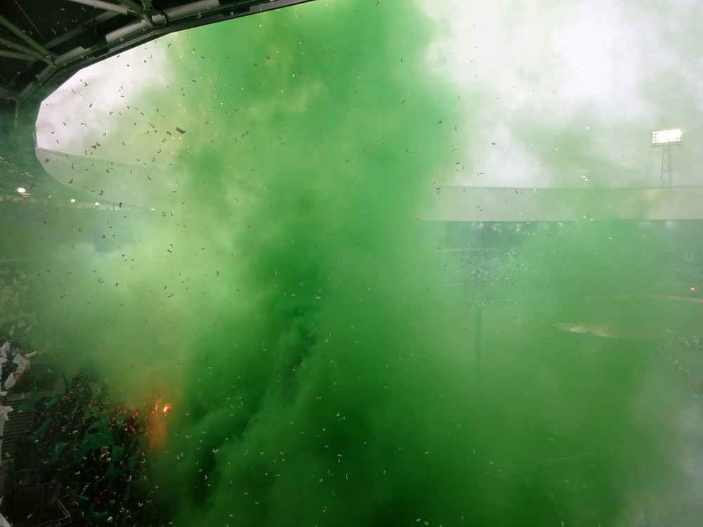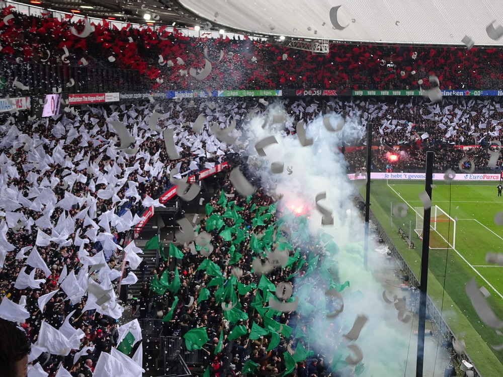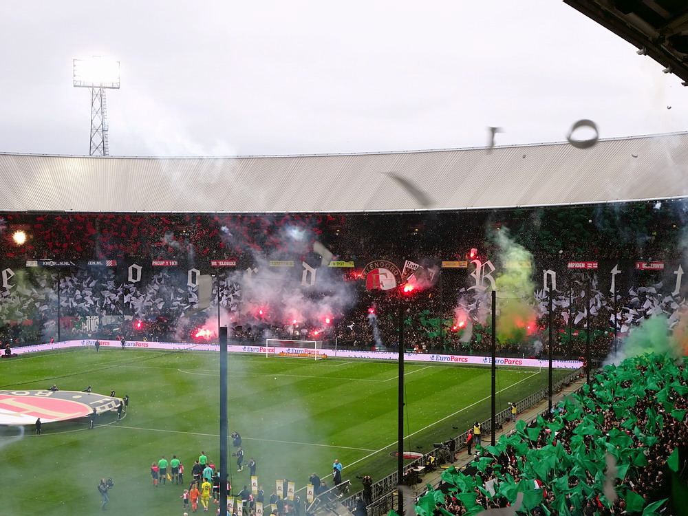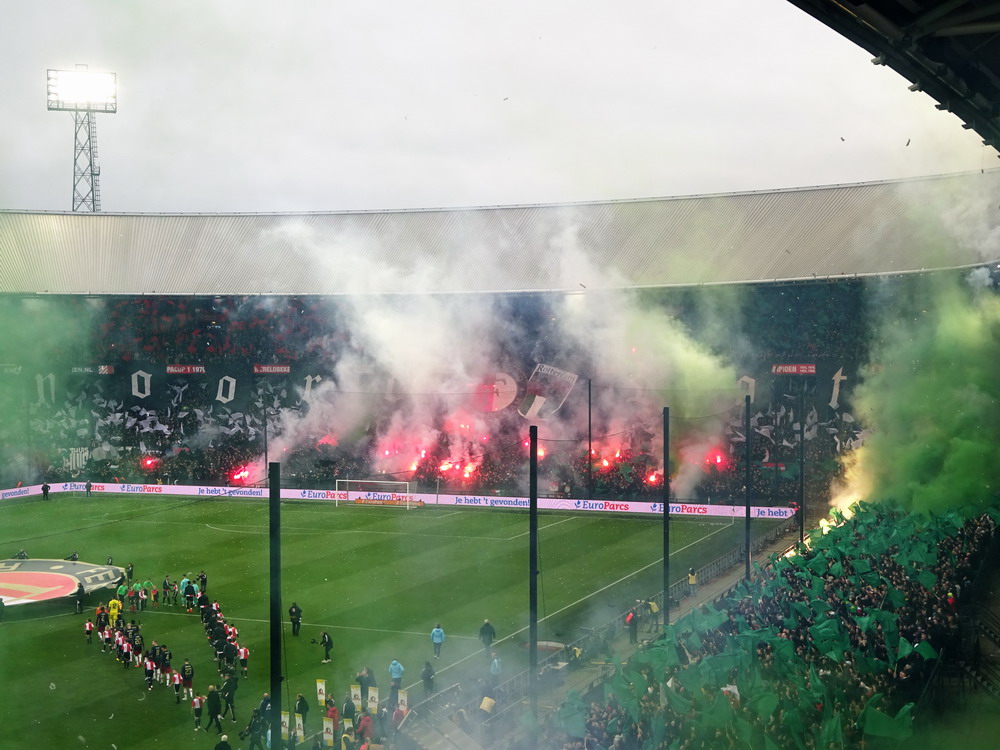 Eigentlich war ich mit dem Gedanken an den Besuch dieser Partie durch als ich hörte, dass rund um das Spielfeld Netze aufgehängt werden. Als ich dann aber kurzfristig die Chance auf ein Ticket bekam, schnappte ich zu. In der Gesamtbilanz der bisherigen 199 Partien – von denen übrigens nur eine einzige torlos endete – hat Ajax deutlich die Nase vorn, heute gingen die Gastgeber allerdings leicht favorisiert in die Partie. Feyenoord schielt als Tabellenführer in Richtung Titelgewinn, während Ajax keines der letzten fünf Meisterschaftsspiele gewinnen konnte. Ich hatte es eigentlich gar nicht so extrem erwartet, aber die Abneigung gegen Ajax war überdeutlich zu spüren und da das Feyenoord-Publikum mit seinem Hafenarbeiter-Image ja durchaus einige hemmungslose Gestalten zu bieten hat, war die Idee mit dem Netz vielleicht gar nicht so dumm. Das Intro konnte sich dann sehen und hören lassen. Im ganzen Stadion waren Fähnchen in den Stadt- und Vereinsfarben ausgelegt worden, Fackeln wurden gezündet und eine stattliche grüne Rauchwolke setzte sich unter dem Stadiondach fest. Dazu wurden innerhalb und außerhalb des Stadions reichlich Silvesterraketen gezündet und auch die unsäglichen Böller krachten durch das Rund. Leider war der Rauch so dicht, dass man den Rest der Show kaum erkennen konnte.