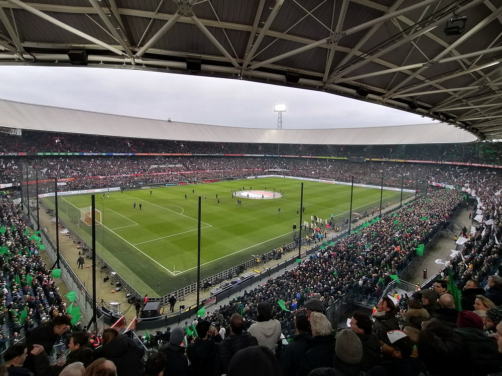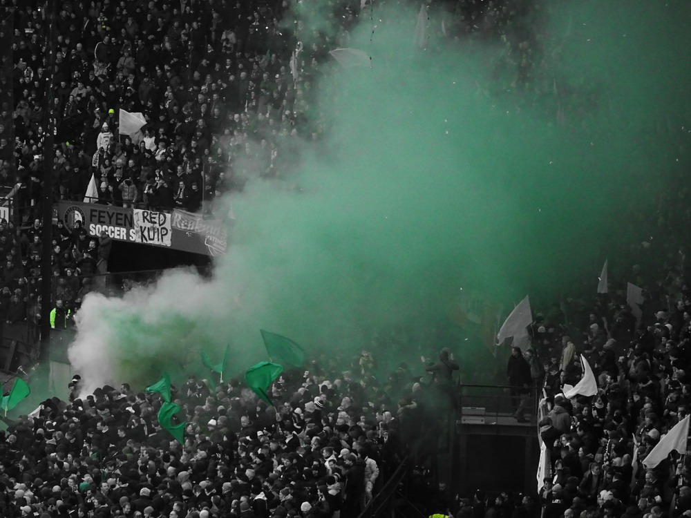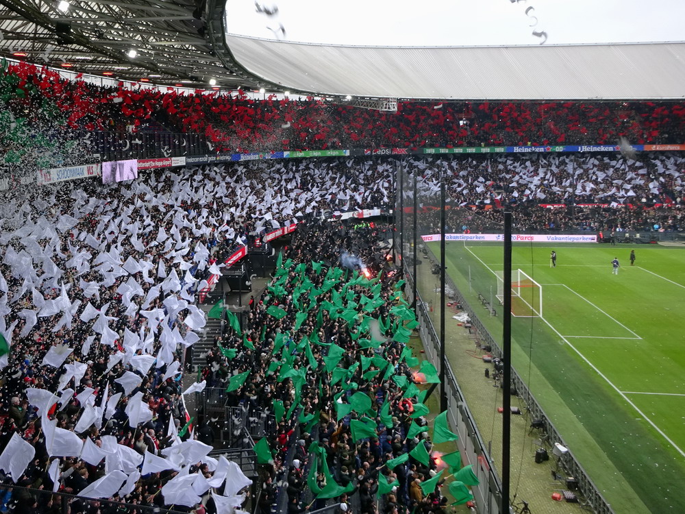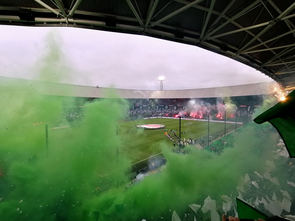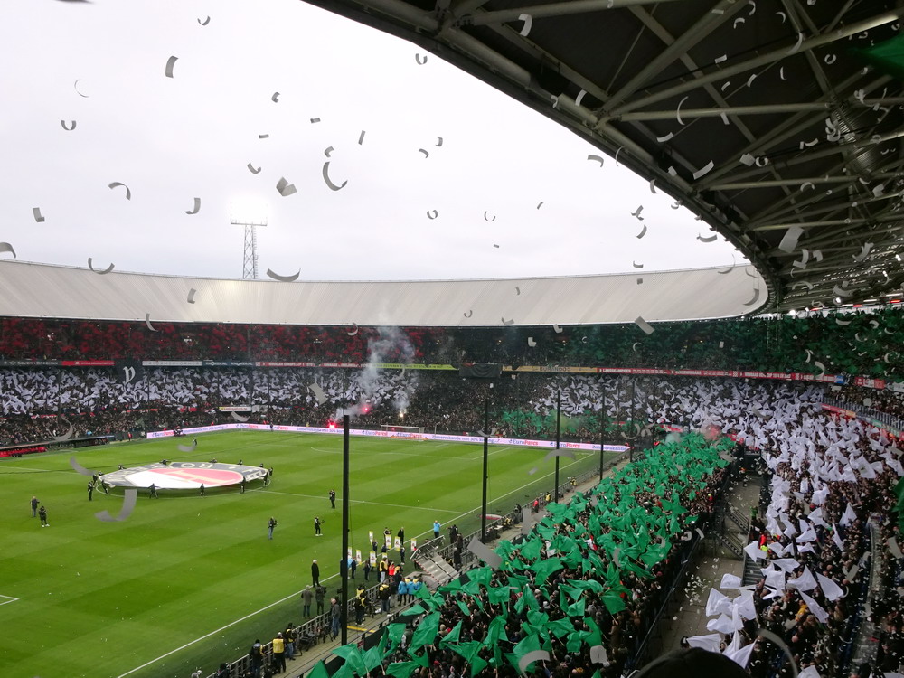 Eigentlich war ich mit dem Gedanken an den Besuch dieser Partie durch als ich hörte, dass rund um das Spielfeld Netze aufgehängt werden. Als ich dann aber kurzfristig die Chance auf ein Ticket bekam, schnappte ich zu. In der Gesamtbilanz der bisherigen 199 Partien – von denen übrigens nur eine einzige torlos endete – hat Ajax deutlich die Nase vorn, heute gingen die Gastgeber allerdings leicht favorisiert in die Partie. Feyenoord schielt als Tabellenführer in Richtung Titelgewinn, während Ajax keines der letzten fünf Meisterschaftsspiele gewinnen konnte. Ich hatte es eigentlich gar nicht so extrem erwartet, aber die Abneigung gegen Ajax war überdeutlich zu spüren und da das Feyenoord-Publikum mit seinem Hafenarbeiter-Image ja durchaus einige hemmungslose Gestalten zu bieten hat, war die Idee mit dem Netz vielleicht gar nicht so dumm. Das Intro konnte sich dann sehen und hören lassen. Im ganzen Stadion waren Fähnchen in den Stadt- und Vereinsfarben ausgelegt worden, Fackeln wurden gezündet und eine stattliche grüne Rauchwolke setzte sich unter dem Stadiondach fest. Dazu wurden innerhalb und außerhalb des Stadions reichlich Silvesterraketen gezündet und auch die unsäglichen Böller krachten durch das Rund. Leider war der Rauch so dicht, dass man den Rest der Show kaum erkennen konnte.