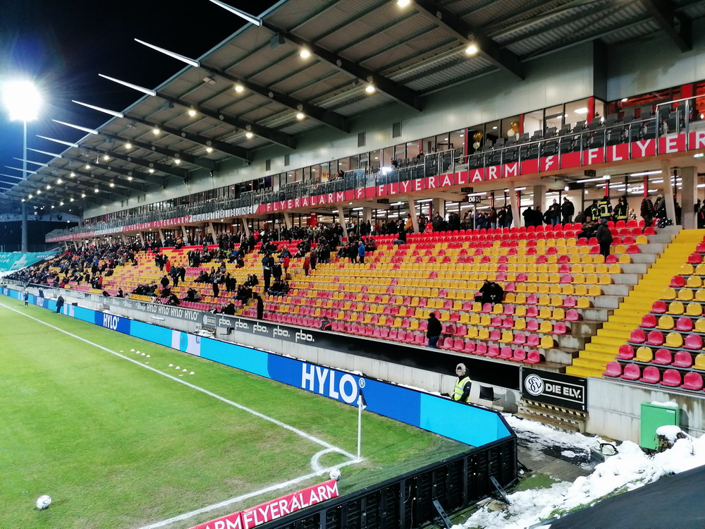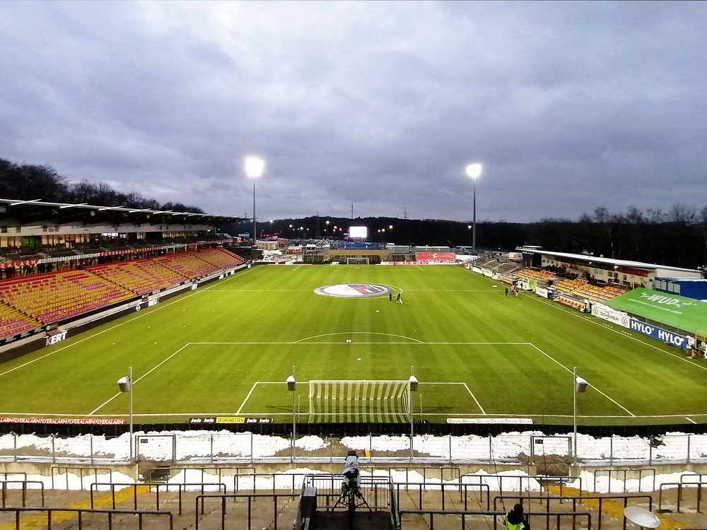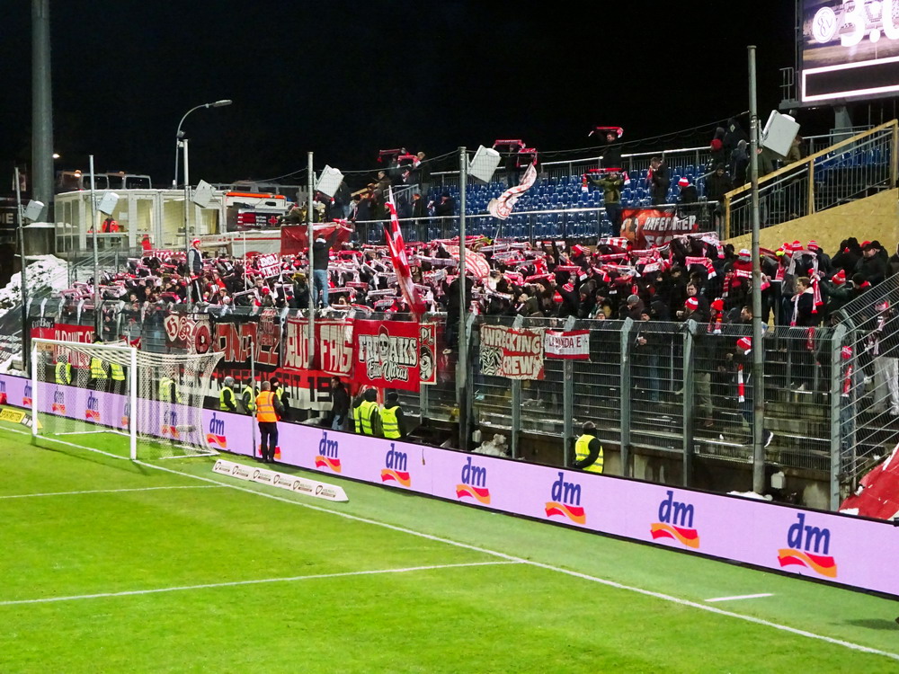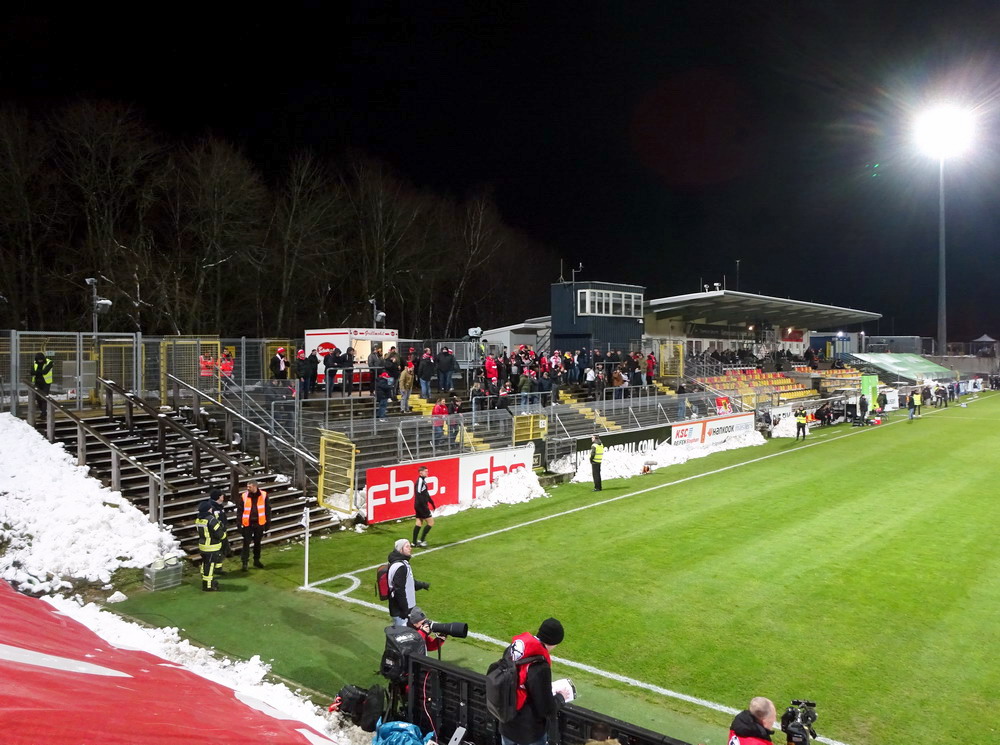 Beinahe fünfeinhalbtausend Leute wollten diese Partie sehen, ein guter Wert für einen ‚Dorfverein‘. Knapp eintausend davon waren aus der Ruhrmetropole angereist und ließen sich vom Spielverlauf nicht irritieren. Warum auch – es war die erste Niederlage nach neun Spielen. Aus anderer Perspektive sind es aber nun schon fünf Spiele ohne Sieg, da zuvor vier Mal die Punkte geteilt wurden. Noch ist der Vorsprung auf die Abstiegsplätze einigermaßen komfortabel, aber das kann schnell vorbei sein, daher ist ein Dreier nun langsam wieder dringend erforderlich. Das ‚Waldstadion an der Kaiserlinde‘, das ja – wenn es mittlerweile nicht eh einen schäbigen Sponsorennamen verliehen bekommen hätte – eigentlich nur noch ‚Waldstadion an der‘ heißen darf, da der namensgebende Baum vor einigen Jahren einem Sturmtief zum Opfer gefallen ist, wird nach und nach zu einer schmucken Spielstätte ausgebaut. Die einstige ungedeckte Gegengerade bietet mittlerweile eine stattliche Tribüne mit großem Business-Bereich. In den nächsten Monaten soll die alte Haupttribüne durch einen modernen Neubau ersetzt werden. Der kleine Verein rüstet sich unterstützt von einem finanzstarken Pharma-Hersteller für höhere Ziele.