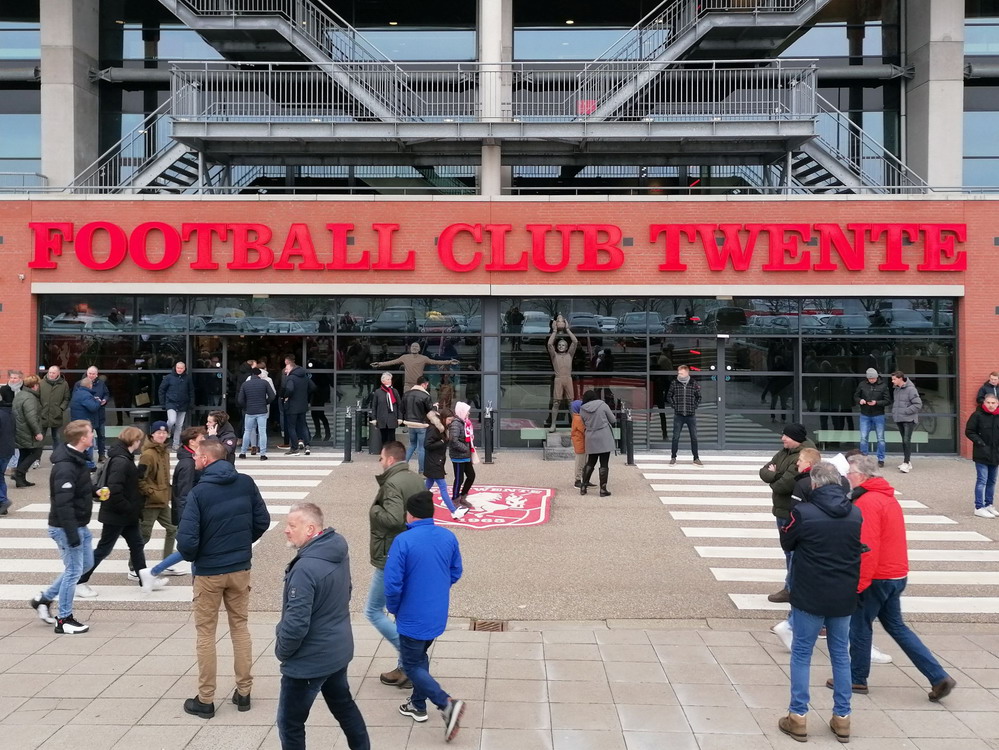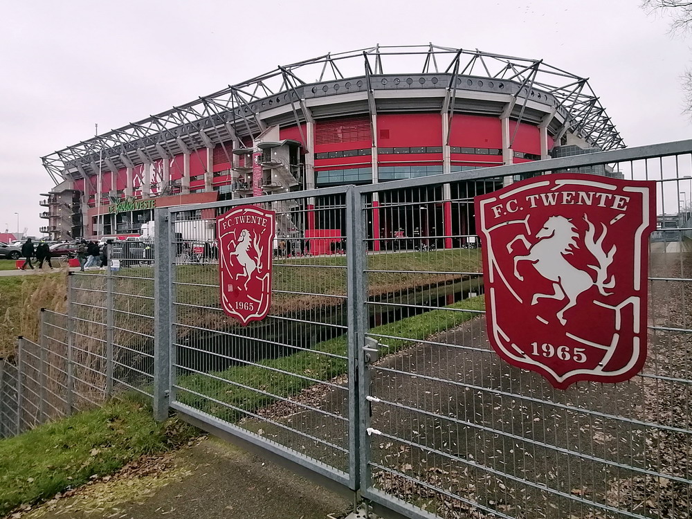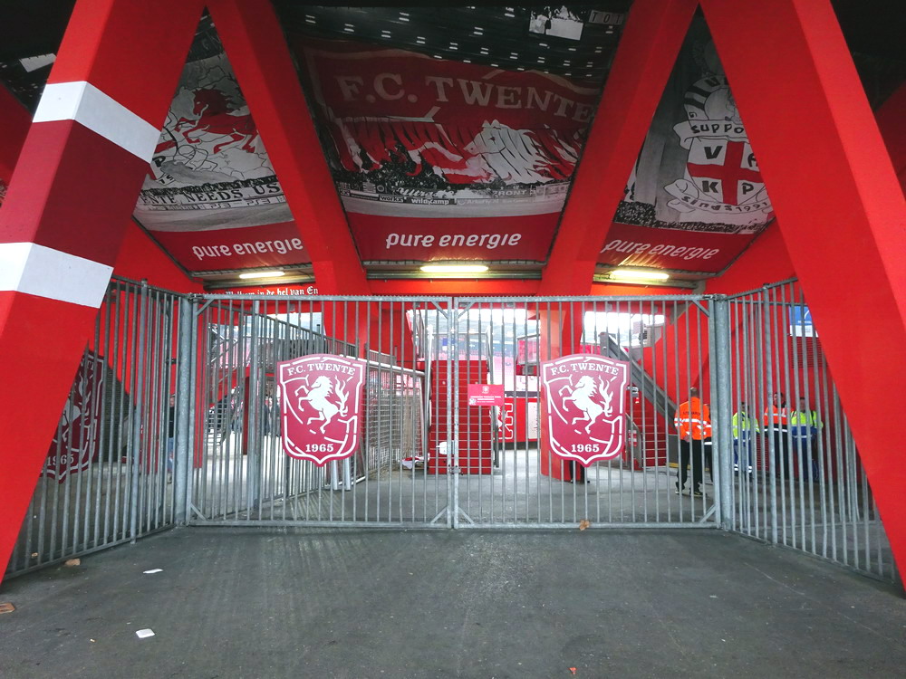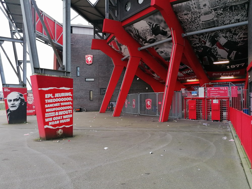 Bevor der globale Virus zuschlug, hatte ich damit begonnen, den etwas interessanteren holländischen Stadien und Szenen nach und nach mal wieder einen Besuch abzustatten. Als die Pest dann um sich griff, wurde dieser Lauf dann natürlich jäh unterbrochen. Ohne wirklich Zeitplan nehme ich dieses Vorhaben nun wieder auf und nachdem ich vergangenen Wochenende im ‚Kuip‘ dem ‚Klassieker‘ beiwohnte, ging es heute in die größte Stadt der Provinz Overijssel. ‚De Grolsch Veste‘ heißt das schmucke, für holländische Verhältnisse schon sehr beachtliche Stadion und die Namensrechte liegen damit natürlich beim lokalen Bier-Brauer. Auf drei Seiten ist das Stadion doppelstöckig gebaut, lediglich die Haupttribüne muss mit einem Rang auskommen. Die farbliche Gestaltung rund um das Stadion gefällt mir gut. Viele Malereien sind zu sehen und identitätsgebende Banner unter den Decken der Zugänge sind zu finden. Das hat was und damit wird auch deutlich gemacht, wer dort zu Hause ist. Die Vereinsfarben passen ja auch, prinzipiell könnte man den Verein echt sympathisch finden, wenn da nicht die Fanfreundschaft zu den fehlgeleiteten Anhängern vom FC Meineid aus der verbotenen Stadt bestehen würde. Der FC Twente ist übrigens einer der wenigen Clubs, welche die Phalanx der drei großen Vereine durchbrechen und einen Meistertitel in der Eredivisie feiern durfte.