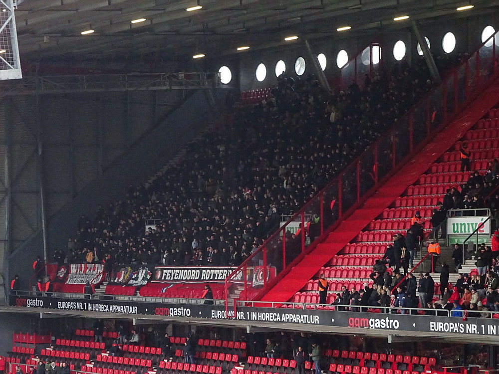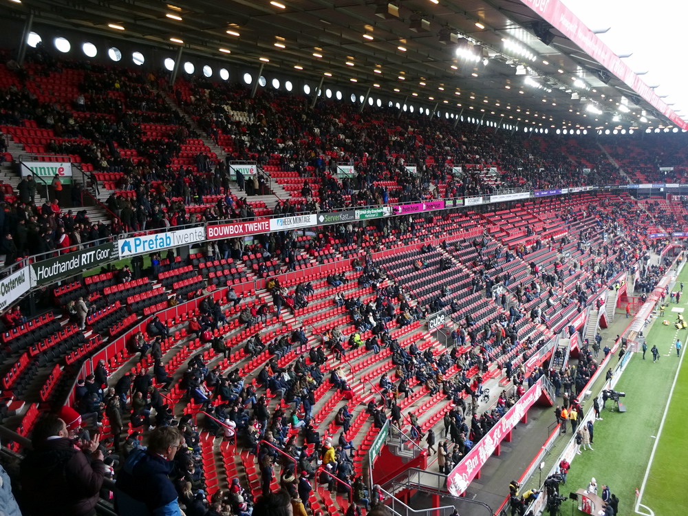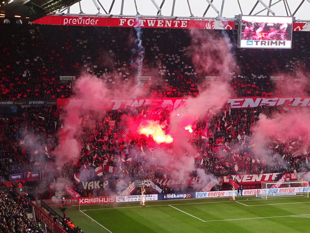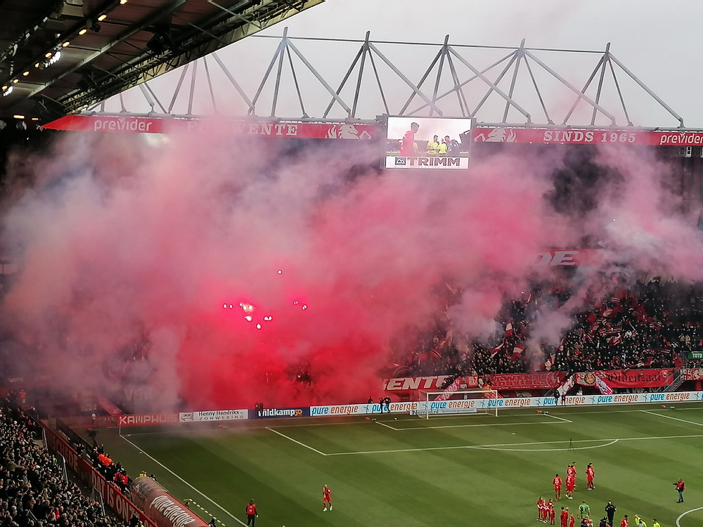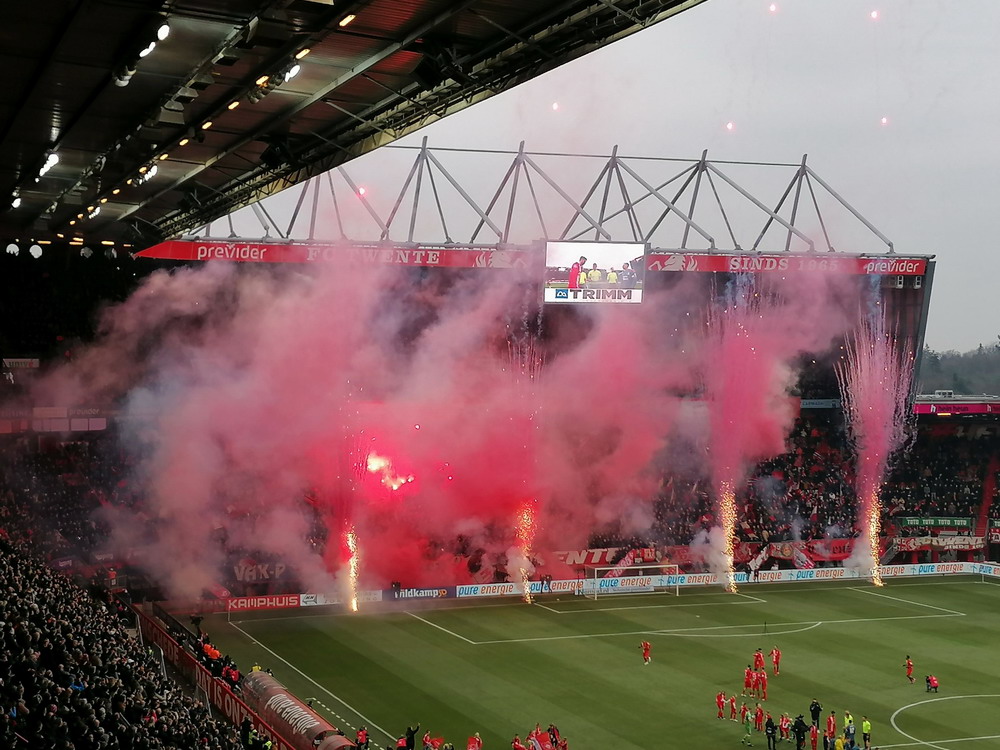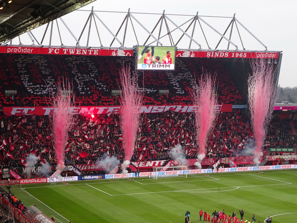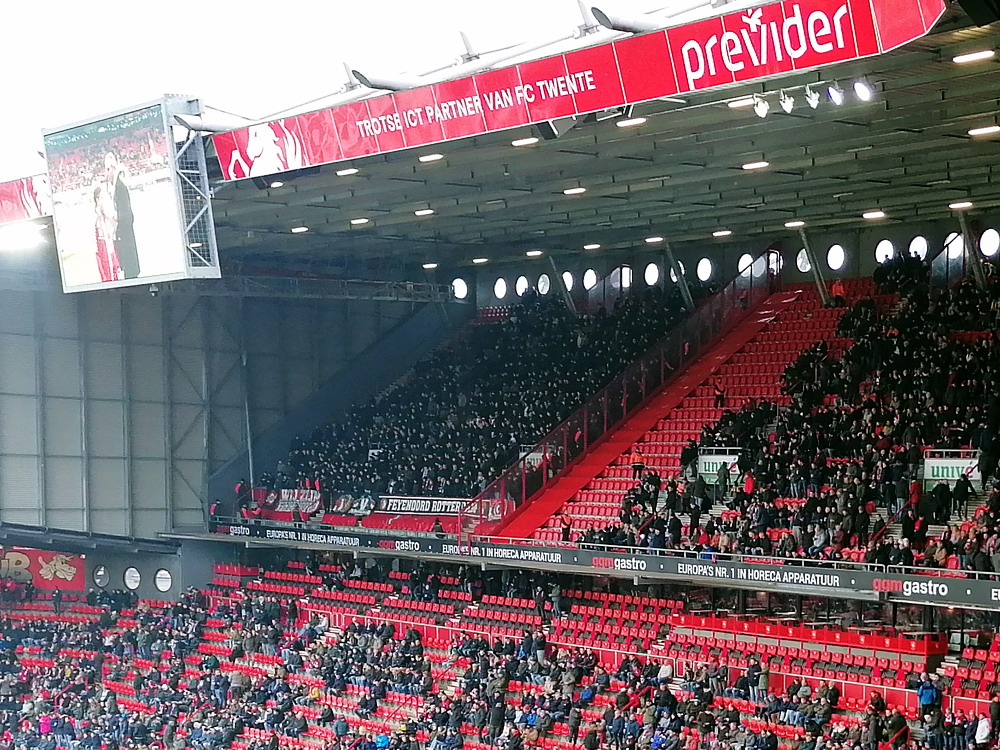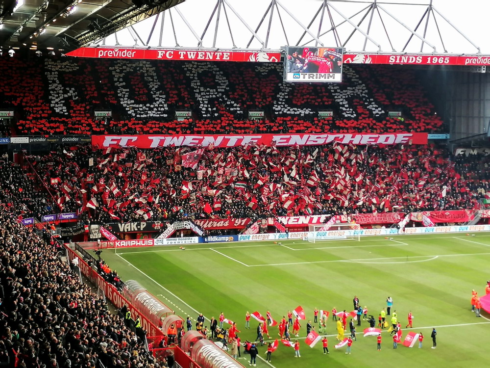 Die Hütte war gegen den Tabellenführer natürlich ausverkauft. Twente spielt eine starke Saison und lag vor dem Spiel als Tabellenvierter in Schlagdistanz zur Spitze des Tableaus. Das Spiel war dann richtig gut anzusehen. Die Gastgeber spielten eine ganz starke erste Hälfte, aber es zeigte sich mal wieder das im Fußball alles möglich ist und zur Pause lagen die Gäste nach einem wirklich sehenswert herausgespielten Treffer schmeichelhaft in Front. Nach dem Seitenwechsel sah es ausgeglichener aus, aber Twente blieb gefährlich und kam zum verdienten Ausgleich. Bei dieser Punkteteilung blieb es, aber es wären auch acht oder zehn Treffer in diesem Spiel möglich geblieben. Der holländische Fußball ist ja grundsätzlich offensiv ausgerichtet, da gibt es kein Rumgeeier aus zwanzig Querpässen an der Mittellinie, das gefällt dem neutralen Beobachter natürlich. Zwei sehr gut aufgelegte Torhüter vereitelten aber ein Torfestival. Die Stimmung war auch ganz brauchbar. Zwar blieben die etwa 1.000 Gäste weitestgehend stumm, dafür war die Heimseite gut in Form. Man muss das natürlich in Relation setzen, denn dauerhaft durchziehen können unsere Nachbarn ja (noch) nicht, es gab natürlich auch ruhige Phasen. Aber ich bin der Meinung, dass sich die niederländischen Szenen konsequent entwickeln und sich die Atmosphäre immer weiter verbessert. Zwischendurch wurde es dann auch mal richtig laut und die Choreo zu Spielbeginn war durchaus sehenswert.
