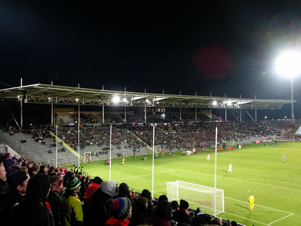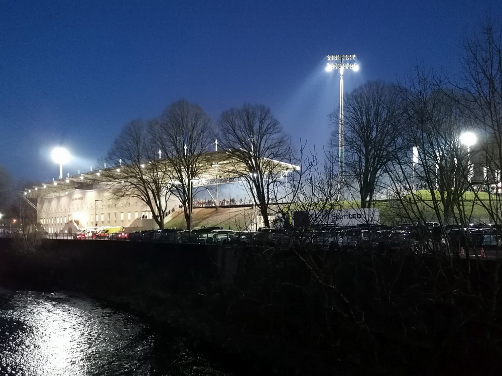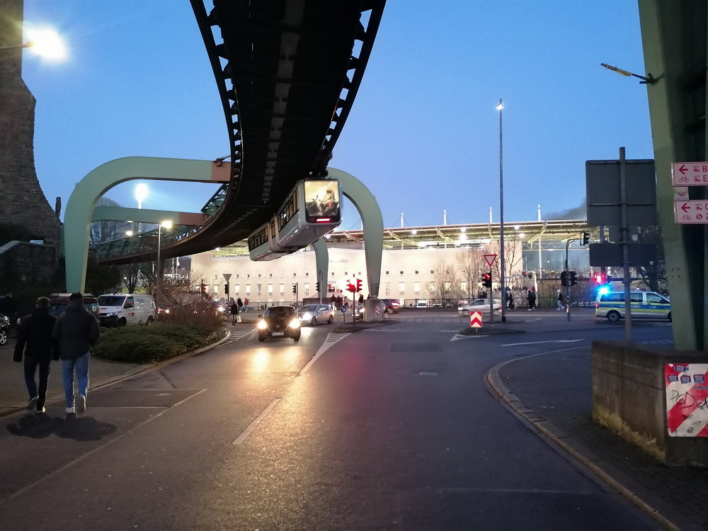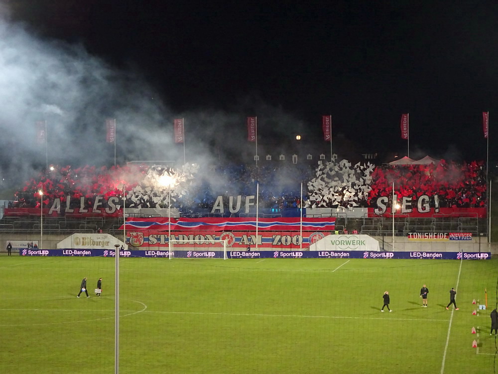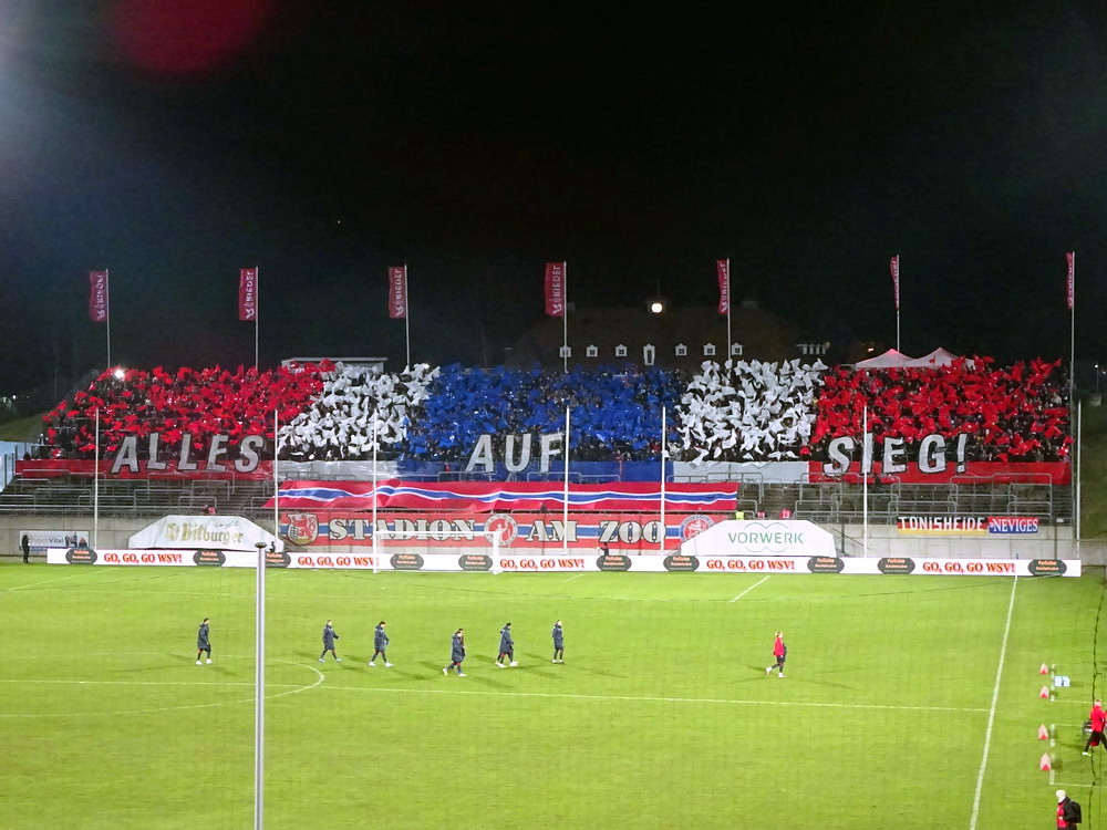 Verbandspokal-Halbfinale in Wuppertal. Hört sich nach nem guten Spiel an und ist es ja eigentlich auch. Bis zum Sommer letzten Jahres wäre diese Paarung für mich auch noch etwas Besonderes gewesen. Ich bin Mitte der 80er Jahre zum glorreichen RWE gekommen, als sich der Deutsche Meister von 1955 mehrere Jahre auf Augenhöhe mit dem WSV bewegte. Damals waren die Wuppis neben dem FC Meineid aus der verbotenen Stadt auf jeden Fall der größte Rivale und diesen Status hat der WSV bei mir persönlich auch bis heute gehalten. Bedingt durch den lang ersehnten Aufstieg im letzten Sommer verspüre ich aber immer noch eine derartige Zufriedenheit und Freude über neue, teils ja auch hochattraktive Gegner, dass der Niederrheinpokal und der WSV als Gegner etwas verblassen. Klingt komisch, is aber so. Ergo fühlte es sich auch eher wie eine Teilnahmeverpflichtung als ein Highlight und eine Art Derby-Stimmung kam bei mir nicht auf. Zudem wurden die Klingen mit den Talbewohnern in den letzten Jahren ja auch regelmäßig gekreuzt, so dass es kein sonderlich selektives Erlebnis war. Das sah man im Tal der Ahnungslosen ganz anders. Verständlicherweise, muss man sagen, denn der Aufstiegszug ist abgefahren, der Pokal also das letzte Eisen im Feuer. So waren da unten im Loch auch alle heiß auf uns und es wurde eine fünfstellige Kulisse angestrebt, die letztlich nur knapp verfehlt wurde. Als Intro gab es eine ganz ordentliche Fähnchen-Choreo mit Motivations-Spruch „Alles auf Sieg“ untermalt von einigen Blinkern.