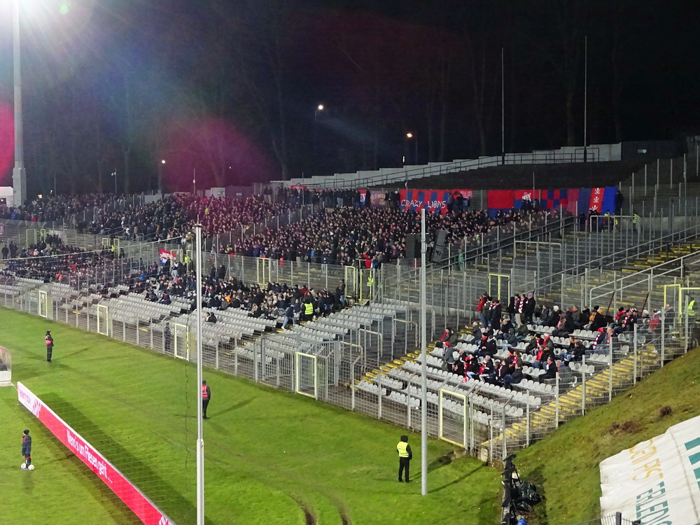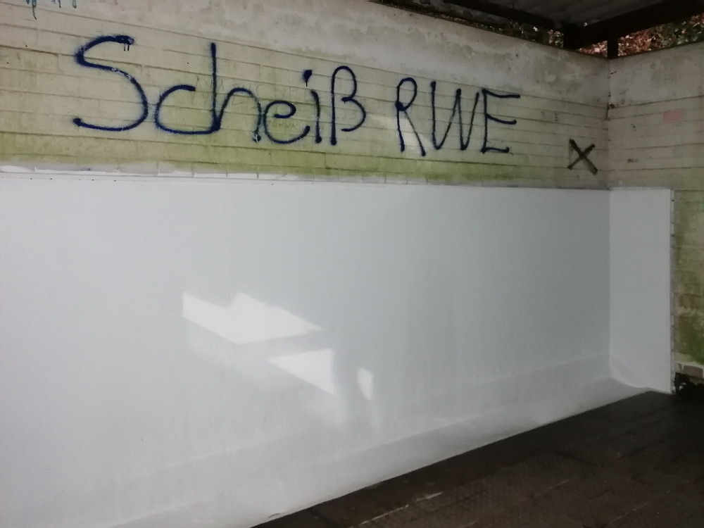 Der WSV-Support war insgesamt solide, zwischendurch etwas langatmig beim sturen W-S-V-Stakkato, der eher klang als wäre ein Sprung in der Schallplatte. Auf jeden Fall war der Heim-Support deutlich besser als der aus der Gästekurve – es gab nämlich keinen. Die aktive RWE-Szene supportet im Verbandspokal erst ab dem Halbfinale. Das war in den vergangenen Jahren immer der Fall und dabei wird offensichtlich auch keine Rücksicht auf den Gegner genommen. So war unter den knapp 1.500 Gäste-Fans völlig tote Hose. Zaghafte Anfeuerungen einzelner Kleingruppen fanden keine Nachahmer. Ich finde es zugegeben etwas befremdlich, dass die Ultra-Gruppen ihre Haltung so konsequent durchziehen. Dass auf aktive Gestaltung bei einem begrenzt reizvollen Pokalspiel gegen einen Bezirksligisten verzichtet wird, finde ich nachvollziehbar. Im Gegensatz dazu zieht aber ein Spiel gegen einen Erzrivalen die Aufmerksamkeit ja nicht aus der Runde in der es stattfindet, sondern aus der eigenen Brisanz. Ich betrachte den Ultra-Gedanken ja durchaus kritisch, erkenne viel Positives, sehe genauso auch negative Verhaltensweisen, aber ich muss zugeben, dass ich den Spielen, in denen die Jungs und Mädels passiv bleiben, wenig abgewinnen kann. Natürlich steht den Ultras die Entscheidung frei, wann sie aktiv werden und wann nicht und wie angedeutet kann ja auch jeder Einzelne dann selber die Initiative ergreifen. Aber genau das funktioniert eben nicht mehr. Die ‚normalen‘ Fans haben verlernt, Stimmung in die Kurve zu bringen, daran weiter zu glauben ist nichts anderes als verklärte Romantik aus der Vor-Ultra-Epoche. Aber eben genau weil sich die Ultras als Herrscher über die Kurve sehen, sehe ich auch eine gewisse Verantwortung bei den Gruppen, generell für die Initiative zu sorgen und nicht nur, wenn es ihnen passt. Schwieriges Thema, das sicherlich auch genug Potential für ein ausgedehntes Seminar bietet.