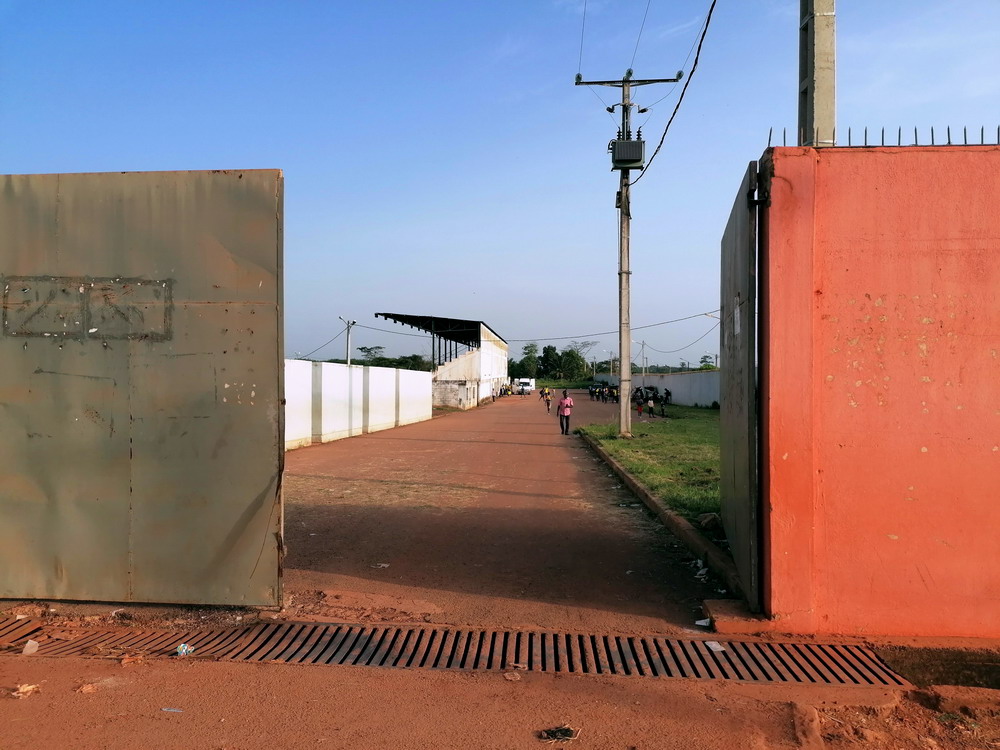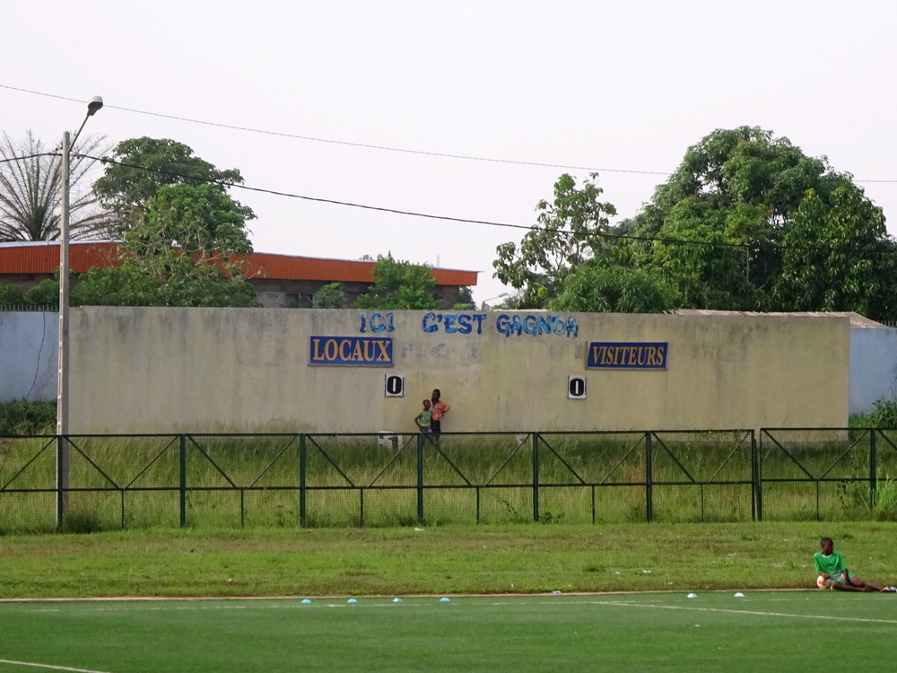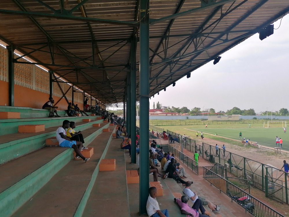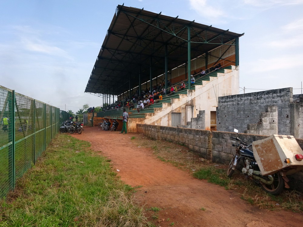 Wir hatten eh Termine und fuhren per Taxi zum anderen Ende der Stadt, wo sich das ‚Stade Biaka Boda‘ befindet, denn dort fand der für heute ausgewählte Zweitliga-Tanz statt. Weiße Nasen verirren sich bestimmt selten hier in die Provinz und so wurden wir teils offen, teils verstohlen angestaunt, blieben aber auch hier unbelästigt. Das Stadion, auch Spielstätte des hiesigen Erstligisten, verfügt über zwei Tribünen, von denen eine ziemlich verranzt daherkommt und kaum zugänglich ist, es sei denn man trägt eine lange Hose. Da wir kurzbehosten Weißmenschen uns im hohen Gras nicht dem ganzen blutsaugenden Viechzeugs zum Festmahl hingeben wollten, konnten wir uns nur bedingt annähern. Man darf letztlich auch nicht das am gesamten Golf von Guinea recht hohe Malaria-Risiko außer Acht lassen, zumal es sich um die gefährliche Variante der ‚Malaria Tropica‘ handelt. Die Gäste waren das überlegene Team auf überschaubarem Niveau, aber die Lokalmatadore siegten durch einen ganz späten Treffer, der entsprechend gefeiert wurde. Die verbleibenden Tagesaufgaben waren nun Essen, Bier trinken und einigermaßen früh zu Bett gehen, was in genau der Reihenfolge erfolgreich abgearbeitet wurde.