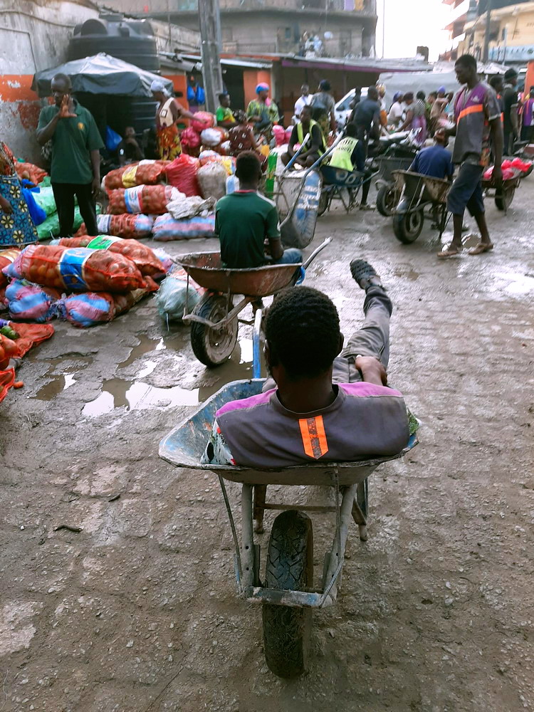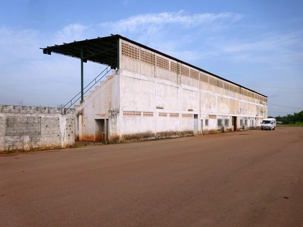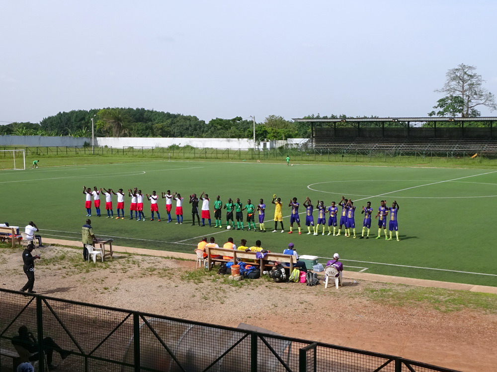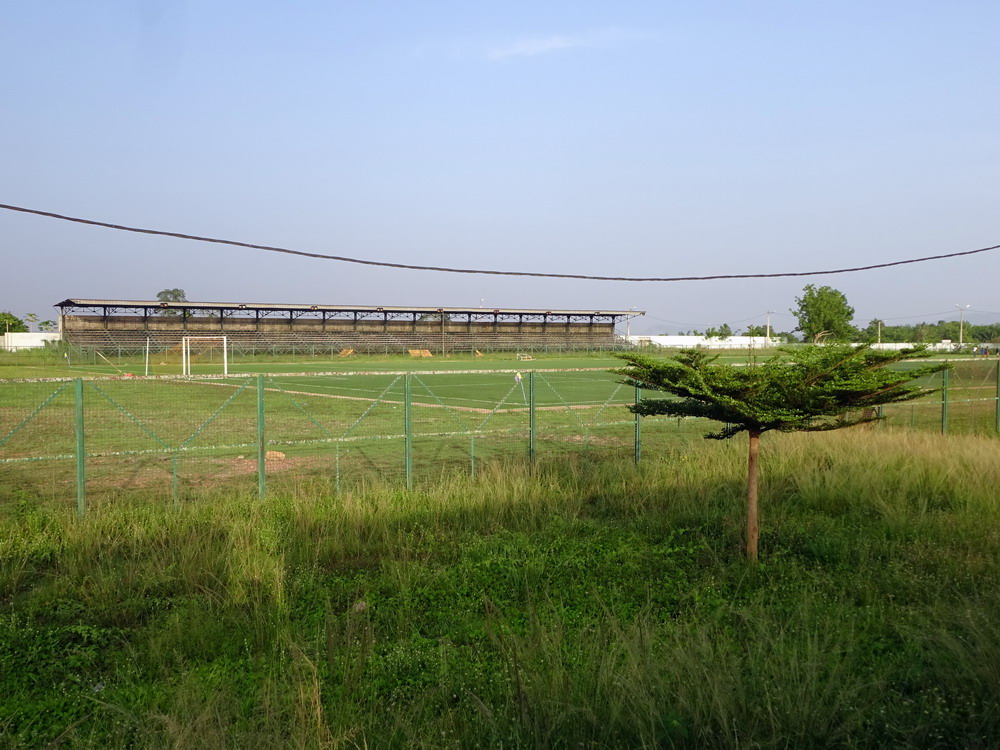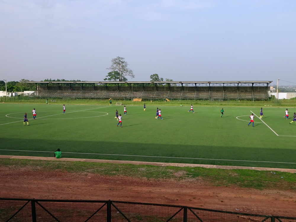 Wir hatten eh Termine und fuhren per Taxi zum anderen Ende der Stadt, wo sich das ‚Stade Biaka Boda‘ befindet, denn dort fand der für heute ausgewählte Zweitliga-Tanz statt. Weiße Nasen verirren sich bestimmt selten hier in die Provinz und so wurden wir teils offen, teils verstohlen angestaunt, blieben aber auch hier unbelästigt. Das Stadion, auch Spielstätte des hiesigen Erstligisten, verfügt über zwei Tribünen, von denen eine ziemlich verranzt daherkommt und kaum zugänglich ist, es sei denn man trägt eine lange Hose. Da wir kurzbehosten Weißmenschen uns im hohen Gras nicht dem ganzen blutsaugenden Viechzeugs zum Festmahl hingeben wollten, konnten wir uns nur bedingt annähern. Man darf letztlich auch nicht das am gesamten Golf von Guinea recht hohe Malaria-Risiko außer Acht lassen, zumal es sich um die gefährliche Variante der ‚Malaria Tropica‘ handelt. Die Gäste waren das überlegene Team auf überschaubarem Niveau, aber die Lokalmatadore siegten durch einen ganz späten Treffer, der entsprechend gefeiert wurde. Die verbleibenden Tagesaufgaben waren nun Essen, Bier trinken und einigermaßen früh zu Bett gehen, was in genau der Reihenfolge erfolgreich abgearbeitet wurde.