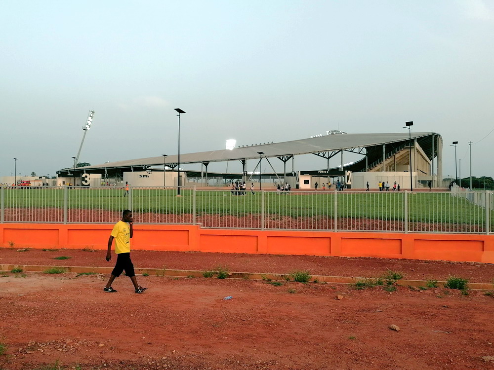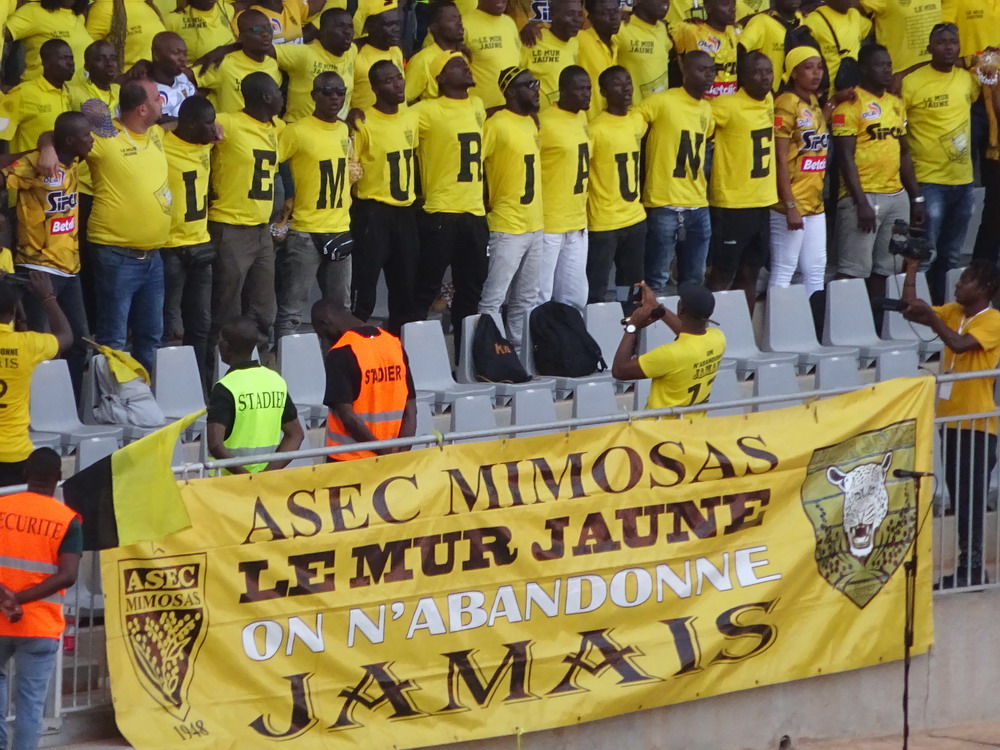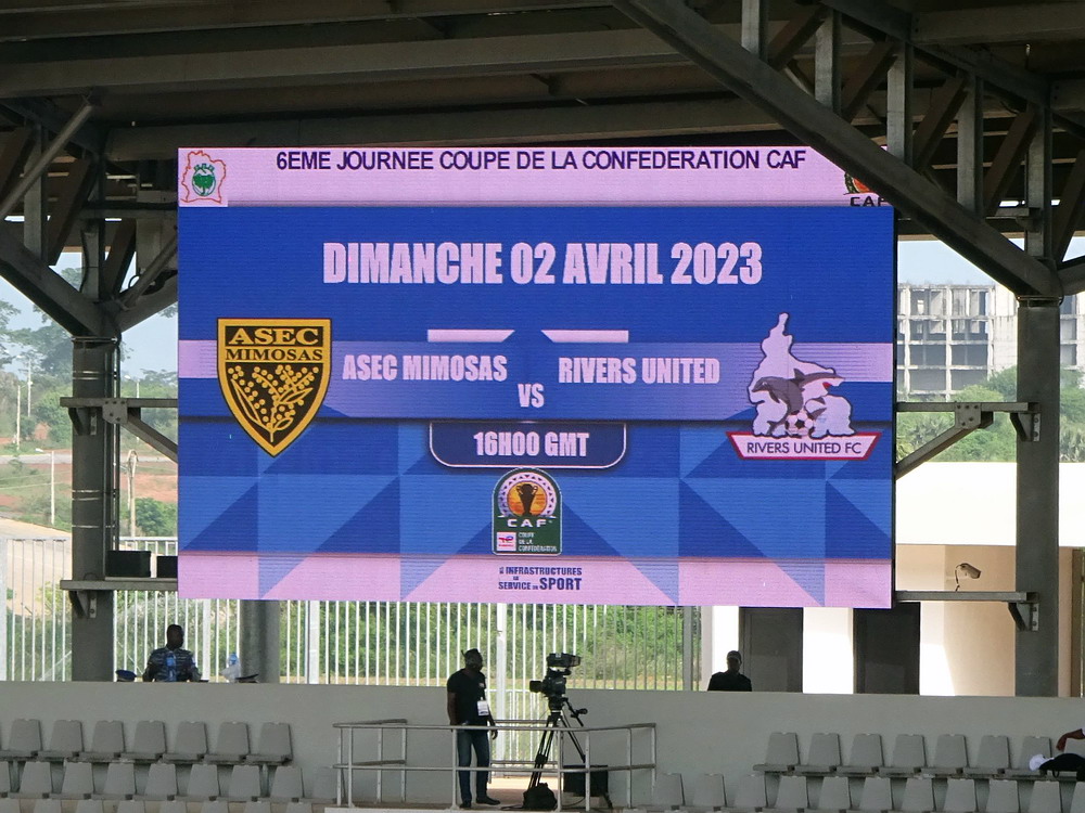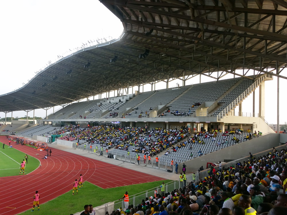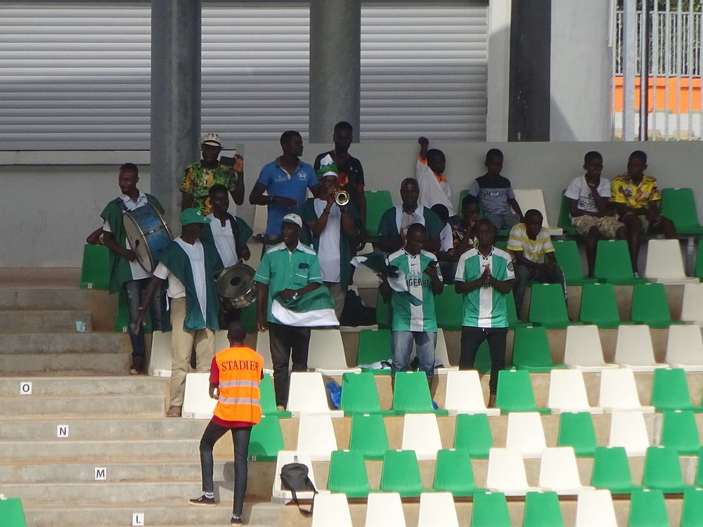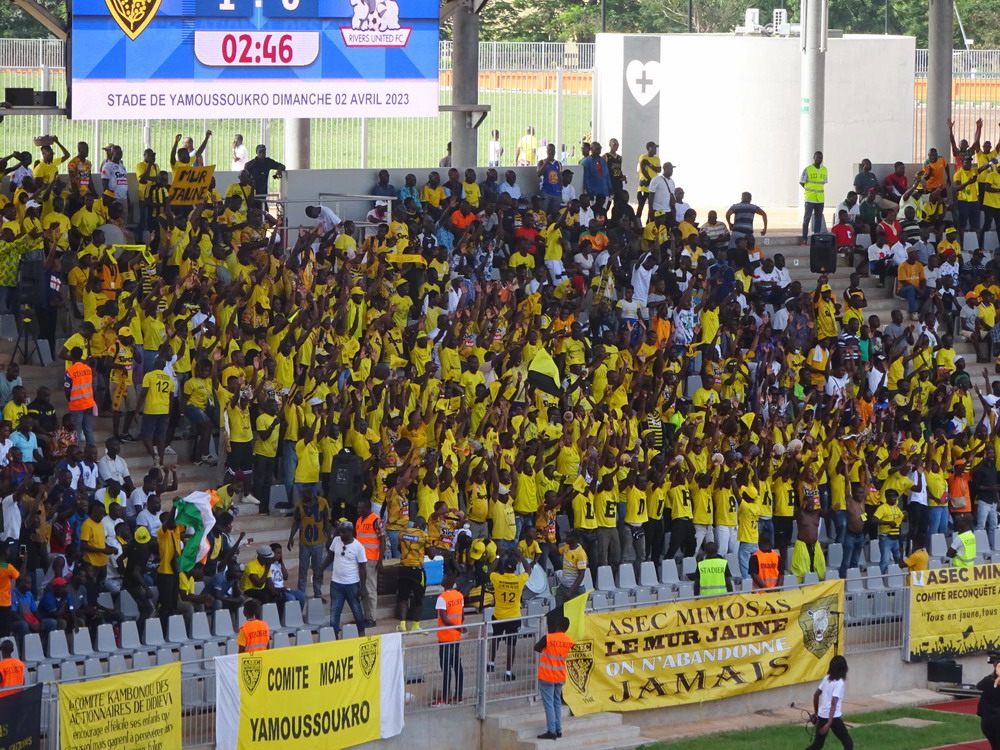 Wir schnappten uns ein Taxi und ein Polizist stieg einfach mit ein, da sein Ziel am Wege lag. Unnötig zu erwähnen, dass er sich nicht an den Fahrtkosten beteiligte. Das ‚Stade de Yamoussoukro‘ war das Fahrtziel, wo das Confederation Cup-Spiel zwischen den ASEC Mimosas und den nigerianischen Gästen von Rivers United stattfand. Amicale Sportive des Employés de Commerce bedeutet das Club-Kürzel – Sportverein für kaufmännische Angestellte. Vor diesem letzten Gruppenspiel waren beide Teams bereits für das Viertelfinale qualifiziert, es ging nur noch um den Gruppensieg. Das 20.000 Zuschauer fassende Stadion wurde erst vor wenigen Jahren fertiggestellt und wird einer der Spielorte des Afrika-Cup im kommenden Januar sein. Es liegt am Stadtrand, wobei dieser eigentlich schwer zu definieren ist, denn die gesamte Stadt wurde sehr großzügig geplant und erscheint vom Grundmuster her mit breiten, teils sechsspurigen Straßen fast wie eine sozialistische Metropole. Meine Erwartung von überschaubaren etwa 4.000 Zuschauern wurde erfüllt. Da das ‚Stade Robert Champroux‘ in Abidjan für internationale Spiele nicht ausreicht, muss ASEC die internationalen Spiele hier im Exil absolvieren, aber der Verein hat im ganzen Land seine Fans.
