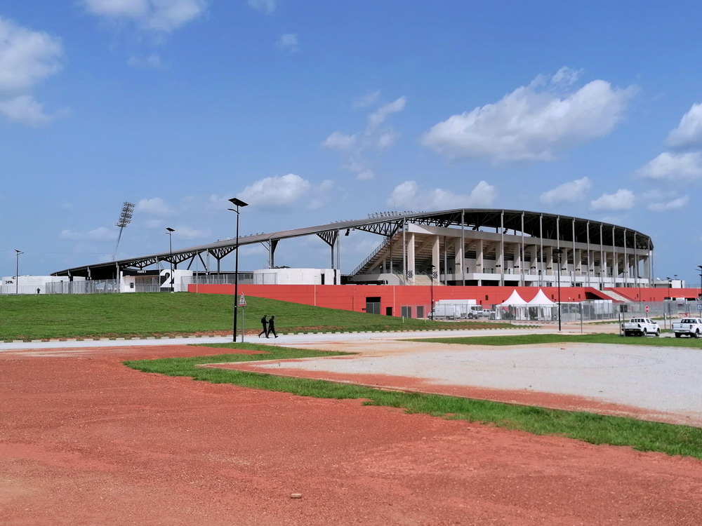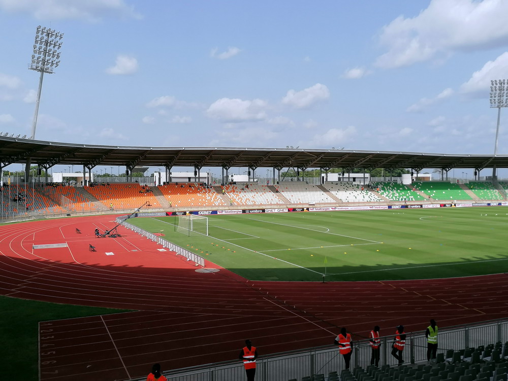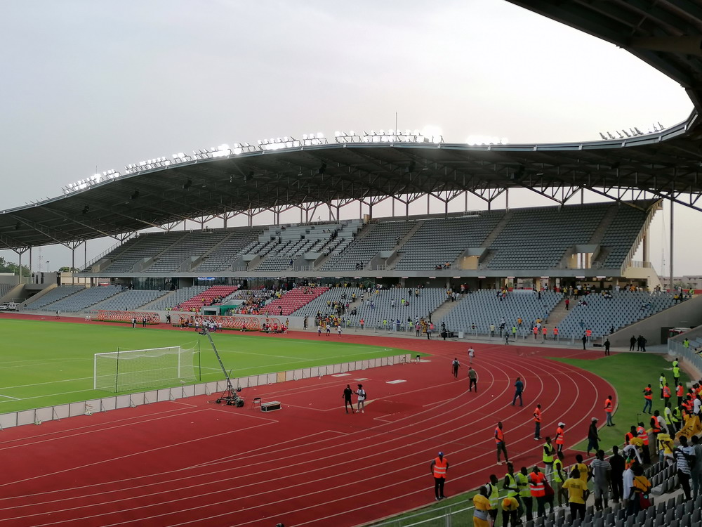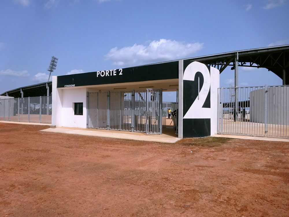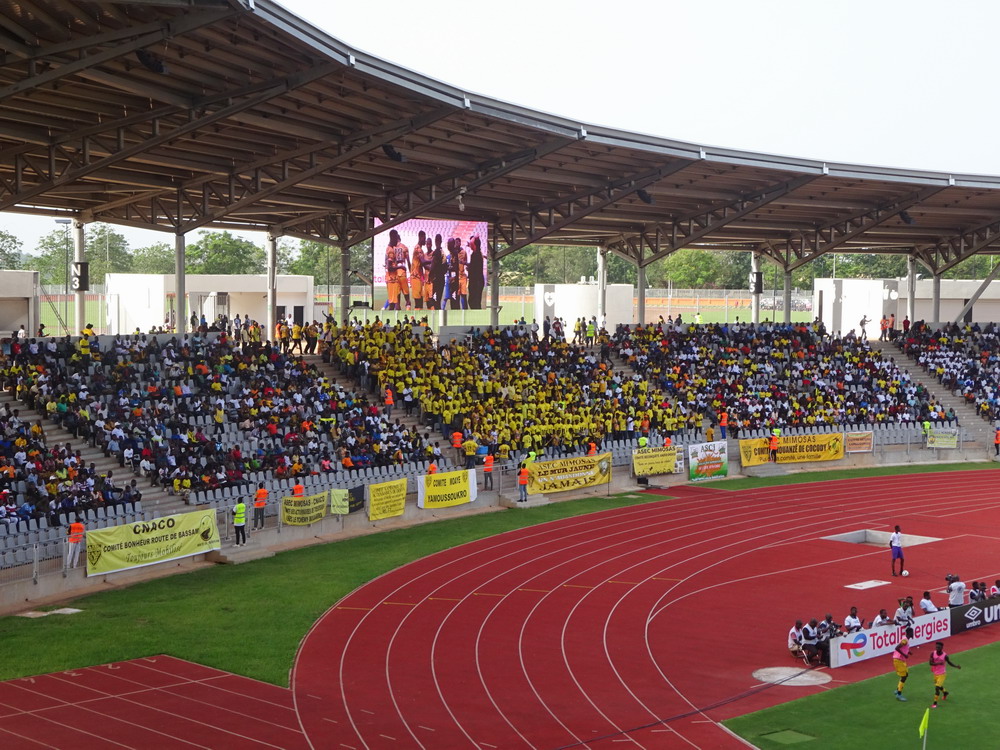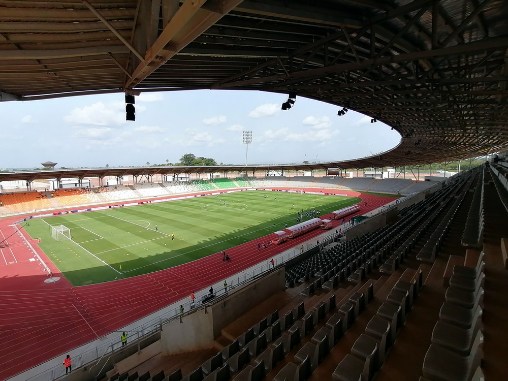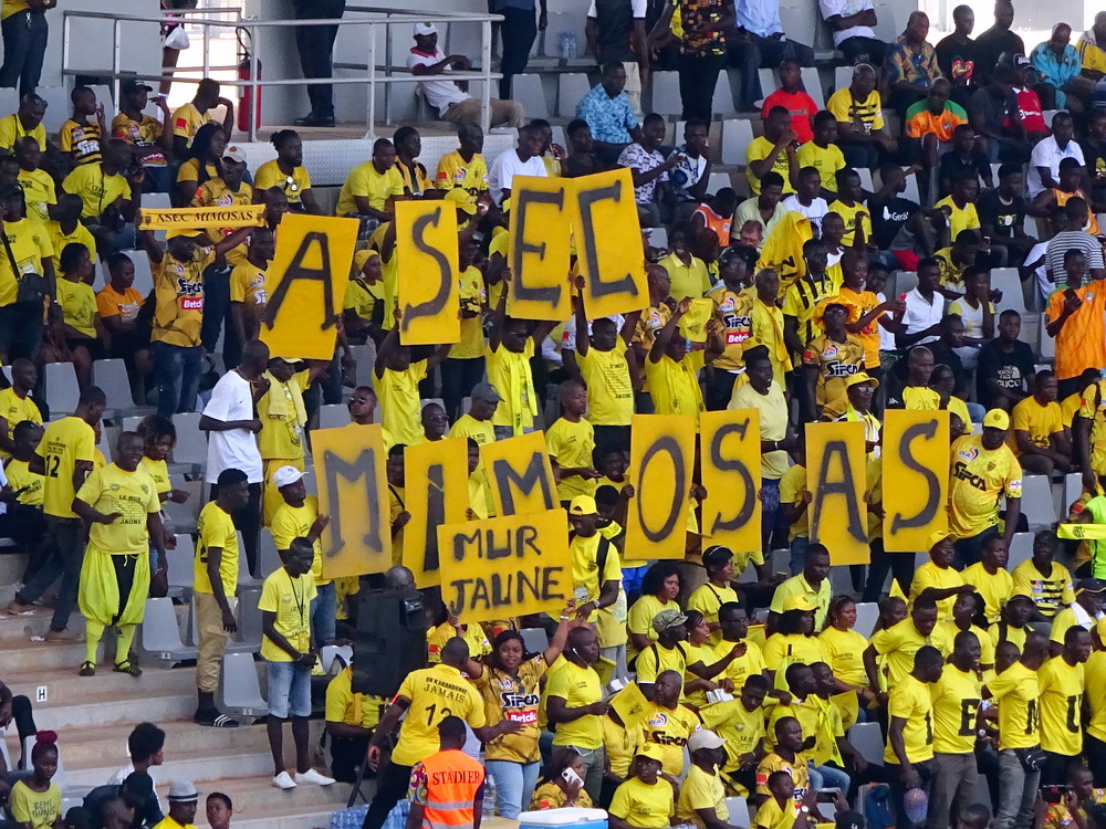 Wir schnappten uns ein Taxi und ein Polizist stieg einfach mit ein, da sein Ziel am Wege lag. Unnötig zu erwähnen, dass er sich nicht an den Fahrtkosten beteiligte. Das ‚Stade de Yamoussoukro‘ war das Fahrtziel, wo das Confederation Cup-Spiel zwischen den ASEC Mimosas und den nigerianischen Gästen von Rivers United stattfand. Amicale Sportive des Employés de Commerce bedeutet das Club-Kürzel – Sportverein für kaufmännische Angestellte. Vor diesem letzten Gruppenspiel waren beide Teams bereits für das Viertelfinale qualifiziert, es ging nur noch um den Gruppensieg. Das 20.000 Zuschauer fassende Stadion wurde erst vor wenigen Jahren fertiggestellt und wird einer der Spielorte des Afrika-Cup im kommenden Januar sein. Es liegt am Stadtrand, wobei dieser eigentlich schwer zu definieren ist, denn die gesamte Stadt wurde sehr großzügig geplant und erscheint vom Grundmuster her mit breiten, teils sechsspurigen Straßen fast wie eine sozialistische Metropole. Meine Erwartung von überschaubaren etwa 4.000 Zuschauern wurde erfüllt. Da das ‚Stade Robert Champroux‘ in Abidjan für internationale Spiele nicht ausreicht, muss ASEC die internationalen Spiele hier im Exil absolvieren, aber der Verein hat im ganzen Land seine Fans.