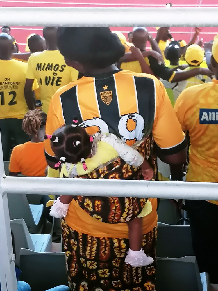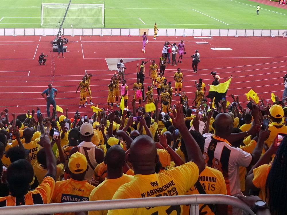 Ein Dutzend Gästefans machte trommelnd und trompetend auf sich aufmerksam. Die ASEC-Kurve sah da schon deutlich besser aus. Es bildete sich ein ganzer Block von Aktiven mit voller Kapelle und drei verteilt stehenden Megafon-Leuten. Die Rhythmen und Gesänge klangen natürlich ungewohnt, haben mir aber richtig gut gefallen. ‚Le mur jaune‘ nennt sich die Kurve – ‚die gelbe Wand‘. Von hier haben die Dortmunder also den Namen ihrer Tribüne geklaut! Die kaufmännischen Angestellten gingen schon in der zweiten Minute in Führung – der Treffer des Tages, was wir zu diesem Zeitpunkt noch nicht ahnten. Das Spiel war attraktiv und schnell und sogar die theatralische Schauspielerei hielt sich in Grenzen. Bis auf die letzten zehn Minuten war ASEC das bessere Team und landete einen verdienten Sieg. Für die Schlussphase begaben wir uns hinter den Stimmungsblock, aus nächster Nähe war das alles noch unterhaltsamer. Nach dem Schlusspfiff feierten wir noch die Mannschaft und begaben uns dann auf Schusters Rappen – natürlich wurde für die 4.000 Leute außer ein paar Taxen kein Transport angeboten – zusammen mit der ganzen Karawane zurück in die Stadt und verzehrten in einem Restaurant ein paar Fleischspieße. Unweit davon ließen wir uns dann in einer Bar nieder und schnallten uns am letzten Abend ganz ordentlich einen um.