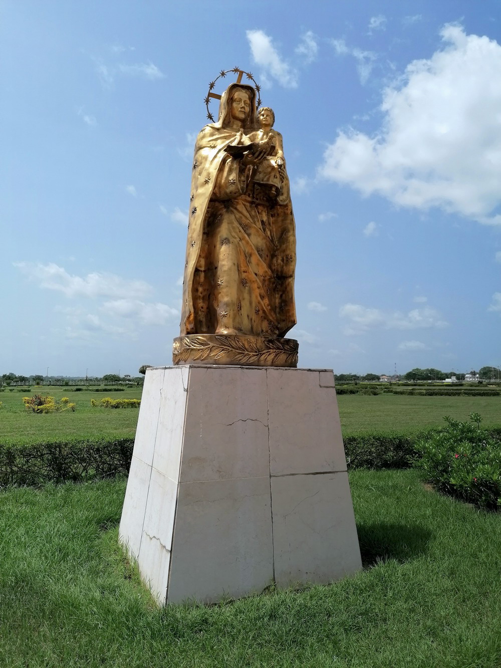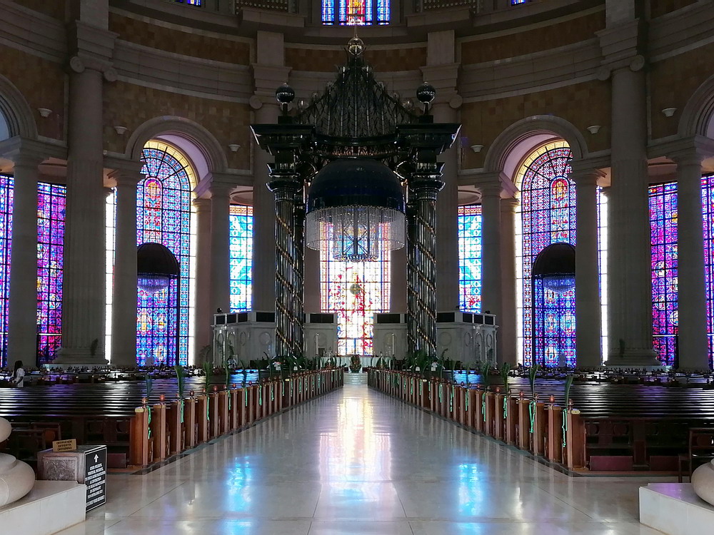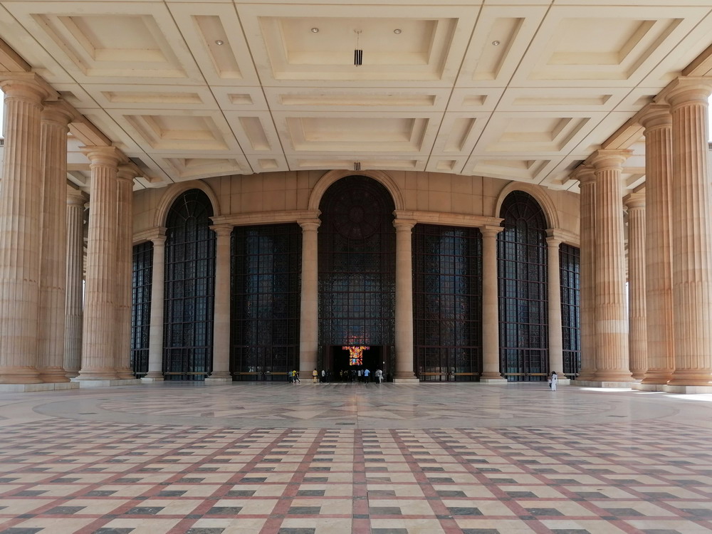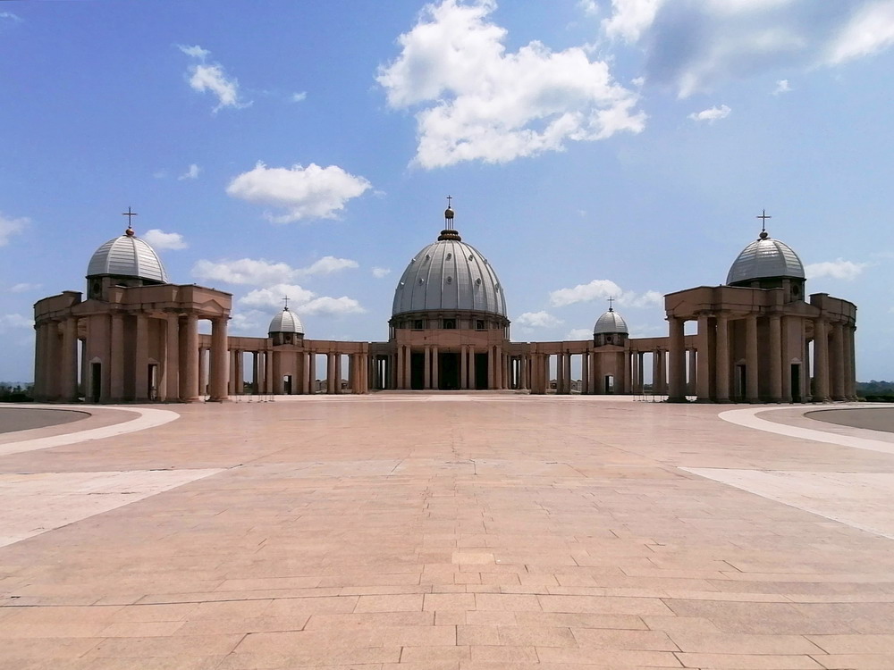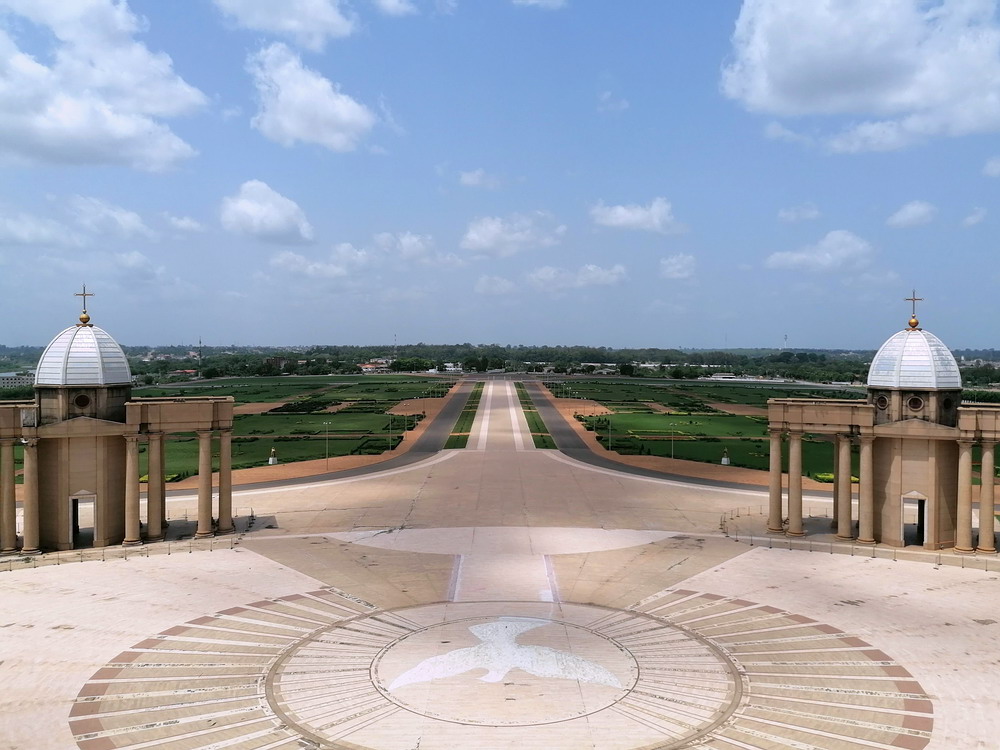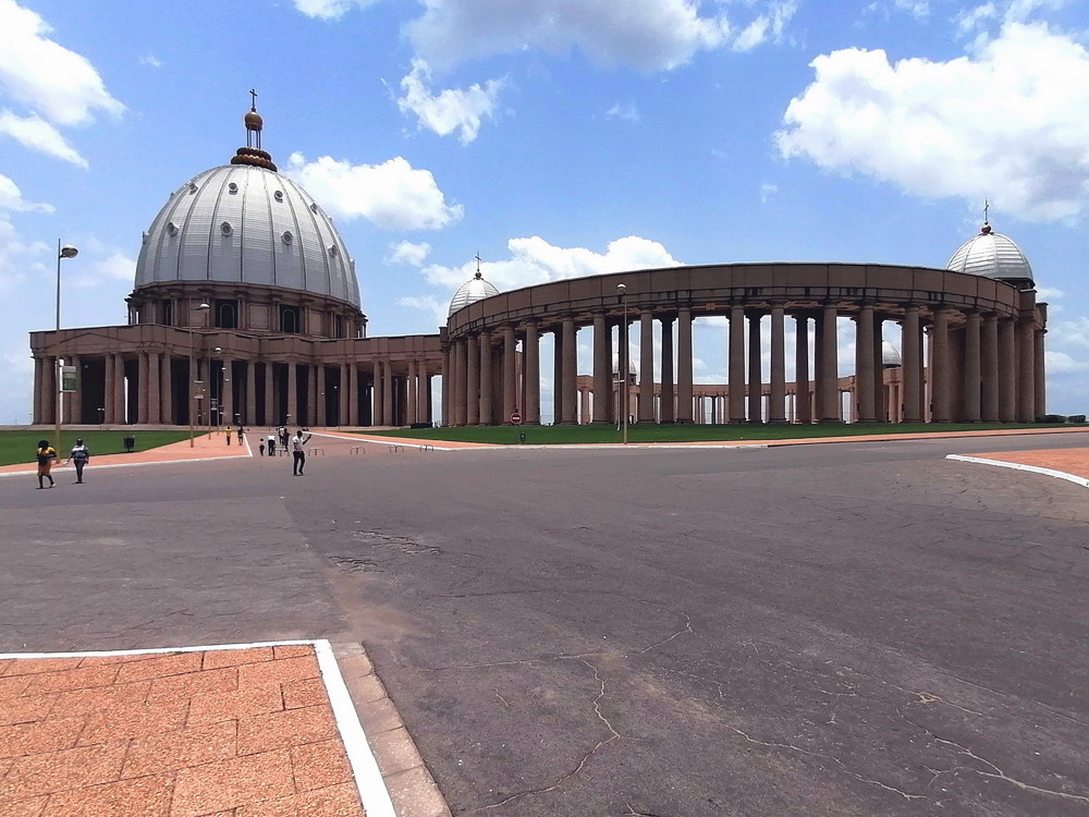 Yakro hatte in den 50er Jahren nur 500 Einwohner, ist bis heute auf 400.000 Menschen angeschwollen, wurde 1983 zur Hauptstadt und hat touristisch sogar einiges im Angebot. Da die Zeit etwas dahingegangen war, blieb für uns nur noch der Besuch der Pflicht-Attraktion. Die Basilika ‚Notre Dame de la Paix‘ ist dem Petersdom im Vatikan nachempfunden. Durch das aufgesetzte Kreuz erreicht die durch Papst Johannes Paul II. geweihte Kirche sogar etwas mehr Höhe als das Vorbild, hat allerdings deutlich weniger Fassungsvermögen. Dennoch wirkt das auf einem riesigen Gelände am Stadtrand in die Steppe gepflasterte Bauwerk einfach nur surreal. Italienischer Marmor und französisches Glasmosaik wurden verbaut. Präsident Houphouet-Boigny verweist stolz darauf, die Kosten von 200 Mio Euro aus dem eigenen Geldsäckel bezahlt zu haben, aber woher die Staatsoberhäupter Afrikas ihr Vermögen ziehen, ist ja auch ein offenes Geheimnis. Frecherweise erntete der Wohltäter völlig überraschend Kritik für diesen Protzbau, da viele Institutionen die Kohle im Sozialhaushalt besser angelegt sahen.