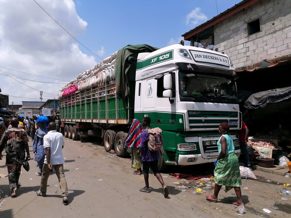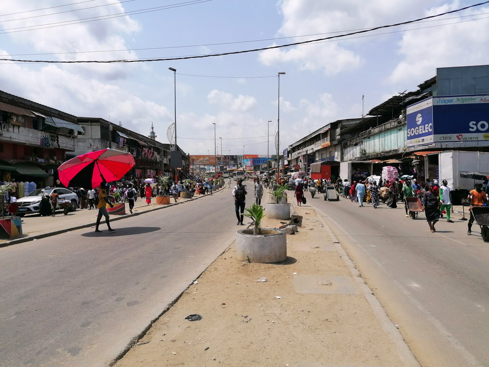 Erstaunlicherweise wurden wie, wie auch vorher in Benin und Togo, kaum behelligt. Der weiße Mann fällt auf, der weiße Mann wird bemerkt und angeschaut, aber nur in seltenen Fällen angesprochen oder gar belästigt. In den Abendstunden dürfte es in diesem Stadtteil allerdings anders zugehen. Adjamé scheint ein einziges riesiges Marktviertel zu sein. Viele Straßen sind unbefestigt. Überall stehen dicht an dicht Shops und Stände, Träger versuchen sich den Weg zu Bahnen und dazwischen stehen und fahren liefernde Lkw, zum Teil große Sattelschlepper. Die Szenerie kann man kaum in Worte fassen. Warum in aller Welt sich ausgerechnet dort ebenfalls auf einer unbefestigten Straße, wo alles durcheinander rennt und fährt, wo es viel zu eng für große Reisebusse ist, die Busunternehmen niedergelassen haben, kann man wohl nur mit Afrika erklären. Die Fahrer haben es aber drauf, rangieren sicher und geduldig. Wir kauften beim erwählten Anbieter UTB schon mal unsere Tickets für den kommenden Morgen bei einer pfiffigen jungen Dame, die etwas Englisch sprach und uns der Einfachheit halber in ihr Büro bat, statt uns am wuseligen, engen Schalter abzufertigen und sahen dann zu, dass wir da weg kamen.