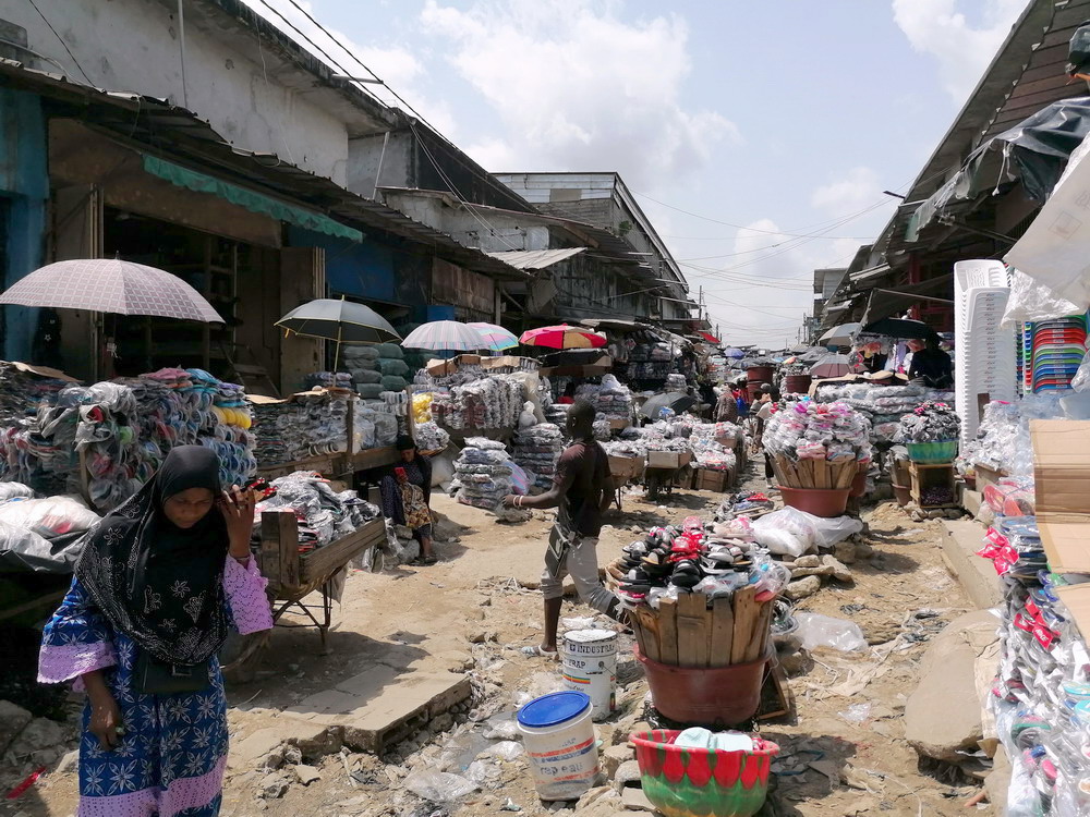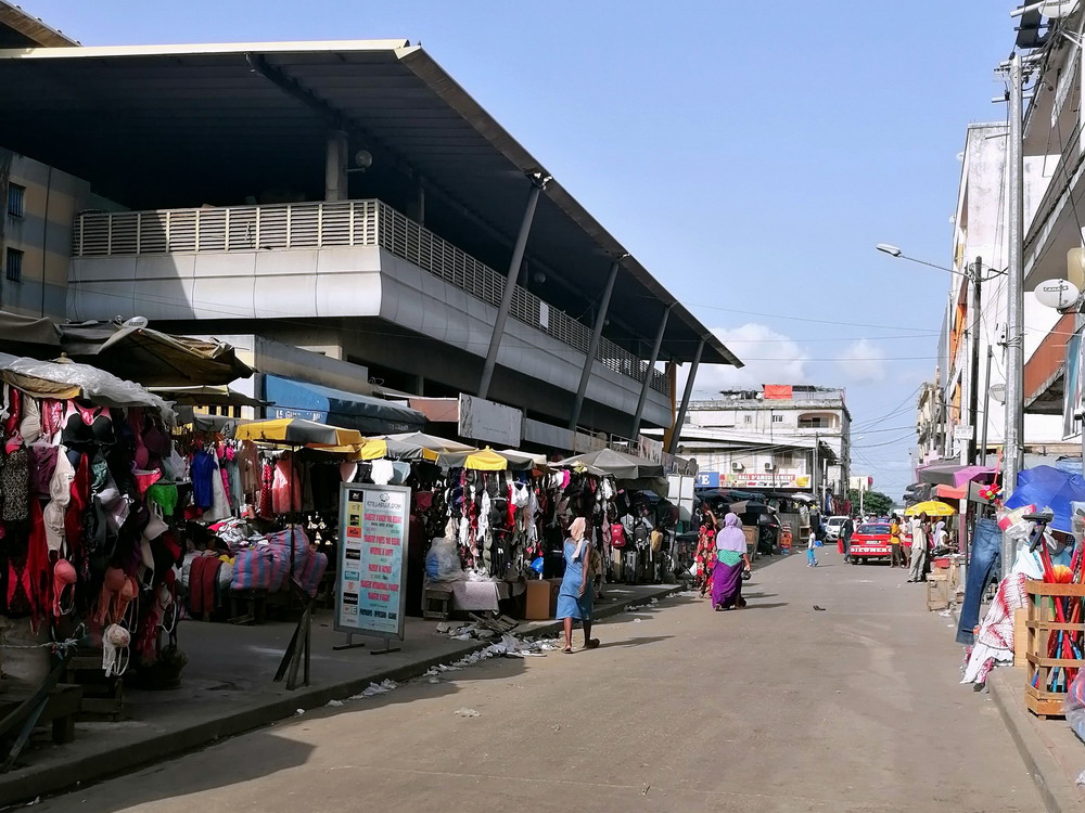 Am Freitag-Vormittag brachen wir auf in Richtung des Stadtteils Plateau, ein Geschäftsviertel mit vielen Hotels bekannter Ketten. Dazu nahmen wir die Personenfähre vom gegenüberliegenden Stadtteil Treichville, dem heimlichen Herz der Stadt. Der Anleger mit Abfahrten in verschiedene Richtungen, war nicht so einfach zu durchschauen. Als wir den Matrosen eines anlegenden Bootes fragten, ob dieses nach Plateau fährt, verneinte er. Als uns wenig später ein Ober-Mokel fragte, warum wir im Boarding-Bereich rumlungern, war es plötzlich doch das richtige Schiff. Einfach nur überragend, dass der Bootsjunge nicht mal wusste, wohin sein Kahn fährt. Afrika, ich liebe Dich! Die Kommunikation hatte sich durch die Abreise meines halb-französischen Hausarztes natürlich erschwert, auch wenn ich mir einige hilfreiche Wörter und die Zahlen hatte eingeprägt hatte. Lücken wurden mit Händen und Füßen oder dem Google-Übersetzer gestopft. In Plateau angekommen latschten wir am ‚Stade Félix Houphouet-Boigny‘, der eigentlichen Heim-Spielstätte von ASEC vorbei, welche aktuell für den Afrika-Cup im kommenden Jahr modernisiert wird, zur ‚Cathédrale Saint-Paul‘, die wuchtig daherkommt, aber keine Schönheit ist. Papst Johannes Päule II. hatte seinerzeit persönlich den Grundstein gelegt. Weiter ging es nun mal mit dem Linienbus in den Stadtteil Adjamé, wo die meisten Busgesellschaften ihre größten Abfahrts-Höfe haben. Wir waren von der Rezeptionistin des Hotels leidlich gewarnt worden, aber so dermaßen tief in Afrika war ich bisher noch nie abgetaucht.