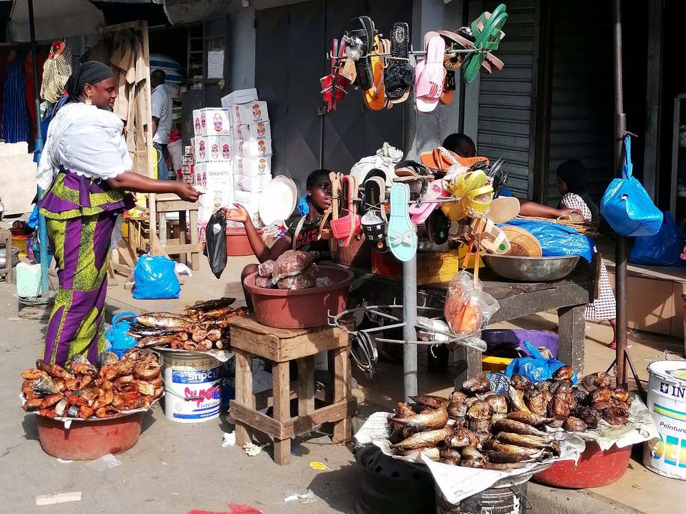 Beim Verband wurde ich freundlich begrüßt, man musste mir aber mitteilen, dass die erste Liga am bevorstehenden Wochenende komplett pausiert, da ASEC, der Vorzeige-Club des Landes, ein Spiel im Confederations-Cup, mit der Europa League zu vergleichen, austrug. Die ganze Liga pausierte, weil ein einziger Club international antrat – this ist Africa. Das er erst tief in den Rechner schauen musste, um das herauszufinden, war die Kirsche auf der Bananentorte. Der Spielplan der zweiten Liga wurde mir aber in die Hand gedrückt und da sowieso in denselben Stadien gespielt wird, wie auf höchstem Niveau und sich die Zuschauerpräsenz beim Liga-Fußball generell in Grenzen hält, war das dann auch egal. Ein wenig schlenderte ich durch das benachbarte Marktviertel. Finde ich ja immer wieder spannend, aus der Markthalle selbst trieben mich aber die für europäische Nasen wenig erträglichen Gerüche schnell wieder hinaus. Dann holte ich mir neben dem Hotel beim Vietnamesen was zu essen, verzog mich aufs Zimmer und wartete auf meine neue Reisebegleitung, die dann gegen 21:00 Uhr eintraf – günstig, dass ich mich beim Vornamen nicht umgewöhnen musste. Die Kondition reichte nur noch für den Besuch in einer Bar neben dem nahen ‚Stade Robert Champroux‘, wo wir uns länger aufhielten als geplant, was an einem heftigen Unwetter lag, welches die Straße komplett unter Wasser setzte. Daher mussten wir uns erstmal gedulden, bis wir den Laden trockenen Fußes verlassen konnten.