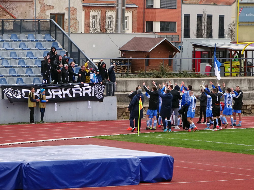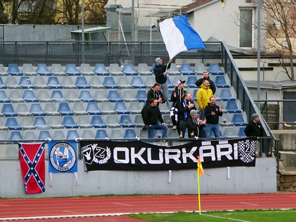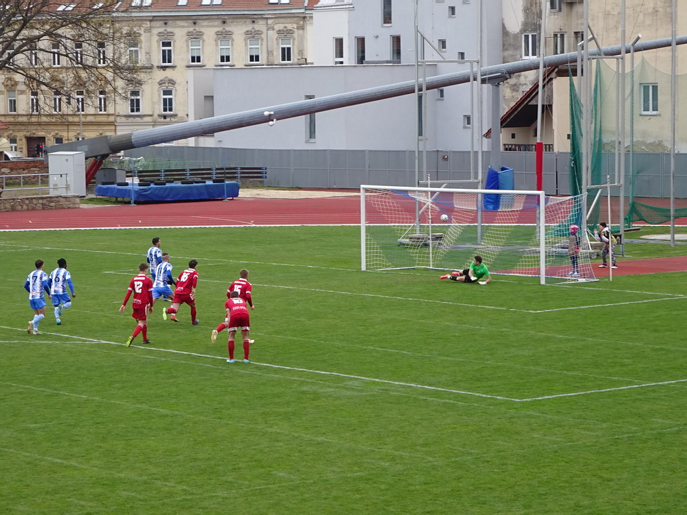 Am Morgen des Karfreitag fuhr ich mit dem Zug von Breclav nach Znojmo. Der Fußballverein aus Znaim, so der deutsche Name der Stadt in Südmähren, schaffte es vor gut zehn Jahren für eine Saison in die höchste Spielklasse. Tat dem Club wohl nicht gut, denn danach ging es runter bis auf drittklassiges Niveau, wo der Verein aktuell auch in argen Abstiegsnöten ist. Umso wichtiger war ein Sieg gegen den direkten Kontrahenten. Sah auch gut aus, was die Gastgeber machten, aber Chance um Chance wurde vergeben, bis der Ball nach einer halben Stunde dann endlich mal einschlug. Sehr zur Freude der exakt zehn ‚Okurkari‘, die sich ab und an zur Anfeuerung ihres Teams aufrafften. ‚Gurken‘ bedeutet das tschechische Wort Okurkari, was aber keine Selbstironie ist, sondern einen Bezug zur Gurkenproduktion, für welche die Region um Znojmo bekannt ist. Die Gäste rafften sich im zweiten Durchgang zu mehr Aktivität auf und spielten nun ordentlich mit. Belohnt wurden die Bemühungen mit dem Ausgleich per Foulelfmeter. Das rief die Znojmonesen wieder auf den Plan, die nun offensiv ausgerichtet druckvoll nach vorne spielten, eine Torgelegenheit nach der anderen kreierten, aber einfach die Bude nicht trafen. Hinten waren die Gastgeber dafür anfällig für Konter, aber was die Gastmannschaft da vorm Tor ablieferte, war noch übler. Allein drei Male wurde ein Stürmer in Überzahlsituationen freigespielt, schob die Kirsche dann aber am eigentlich leeren Tor vorbei – das hatte schon was von Comedy. Und bestraft wurde es auch noch, denn in der Nachspielzeit bekam die Heimmannschaft einen Strafstoß zugesprochen, der sicher verwandelt wurde. Die drei wichtigen Punkte gegen den Abstieg wurden natürlich frenetisch gefeiert und elf Spieler bedankten sich dann noch bei ihren zehn Fans. Eine Eigenart des Stadions sind die klappbaren Flutlichmasten, erforderlich damit die historische Silhouette der Stadt nicht gestört wird, ähnlich wie in Babelsberg. Der Winkel der Haupttribüne ist übrigens mit der steilste, den ich je in einem Stadion gesehen habe.