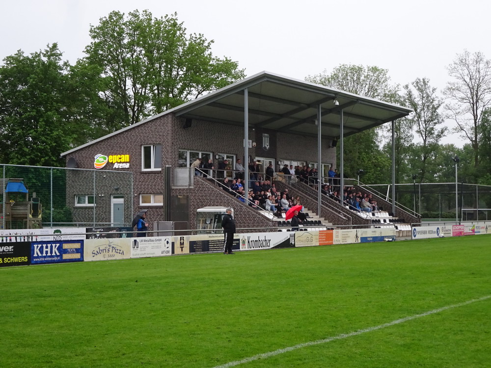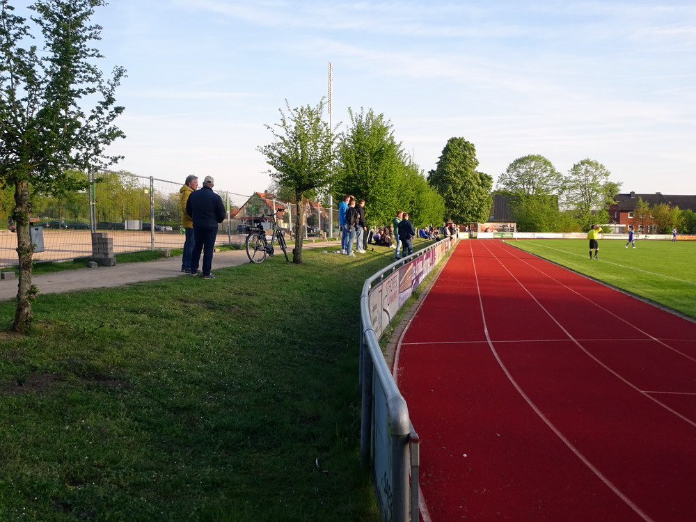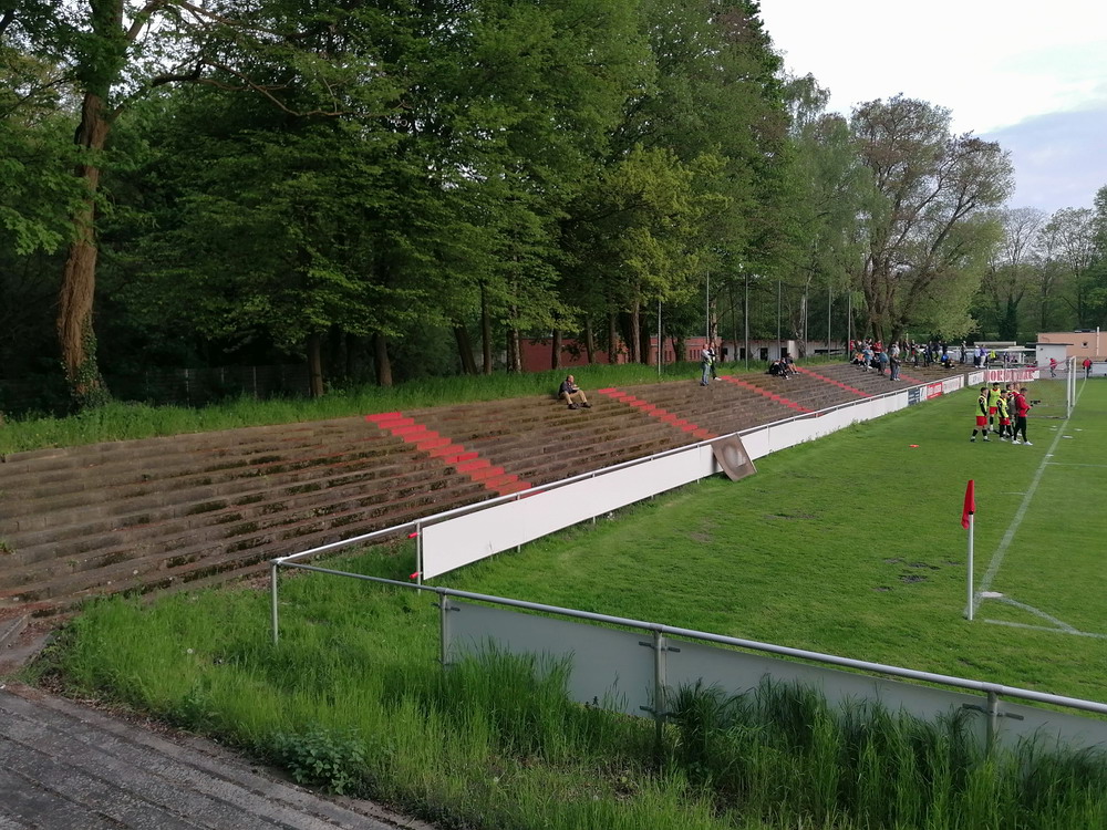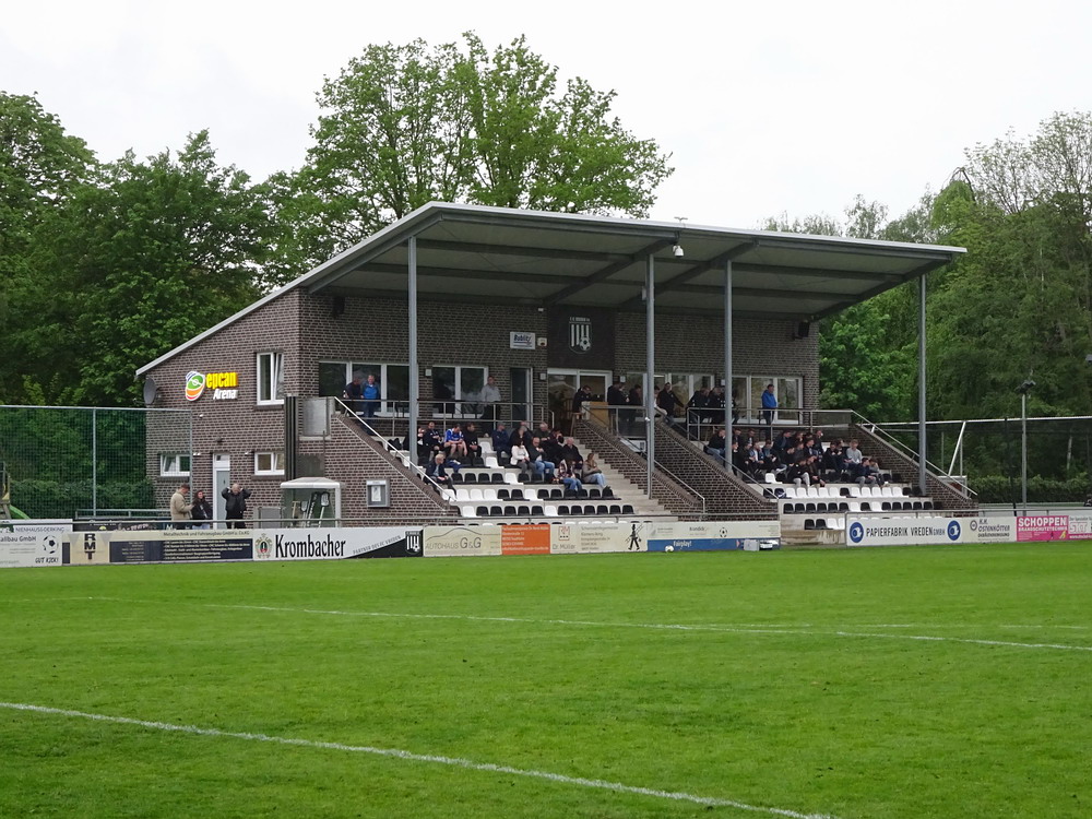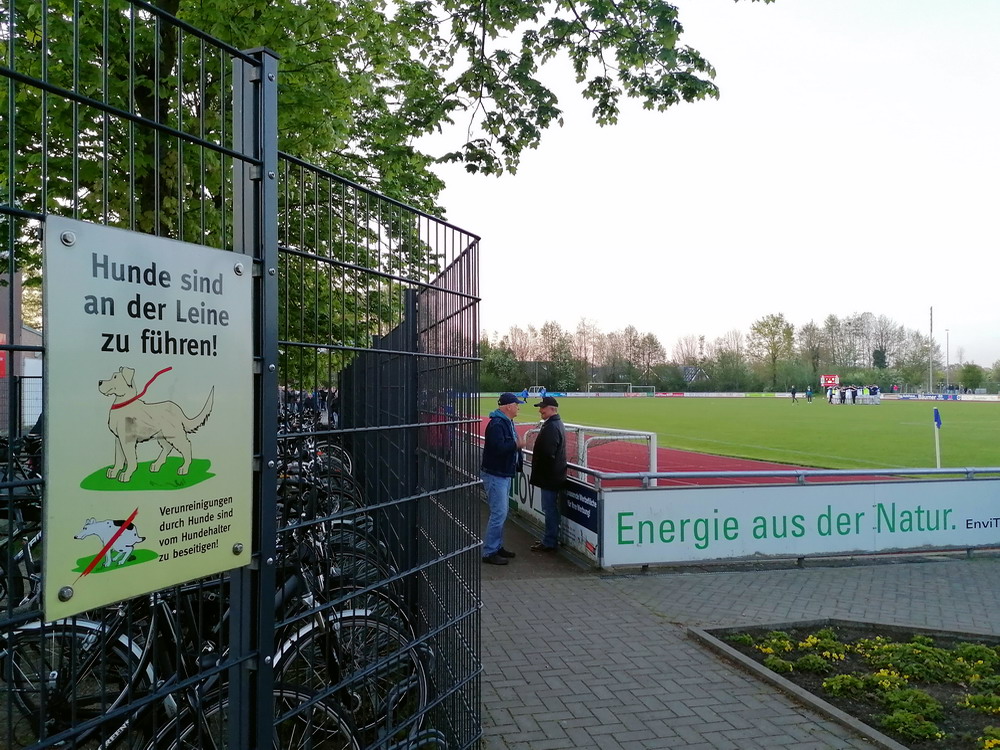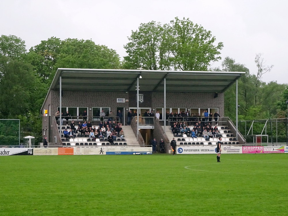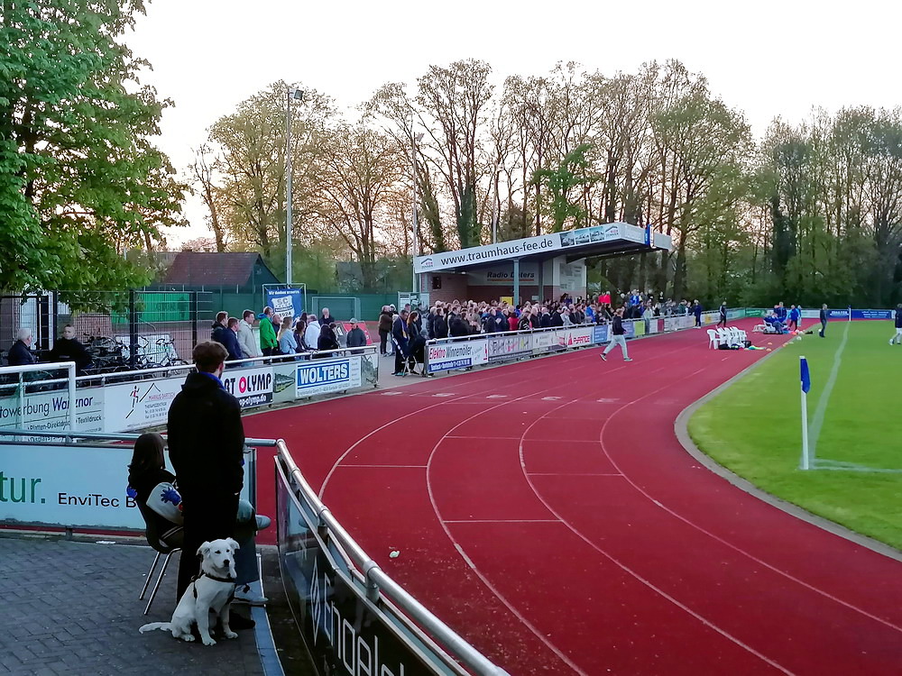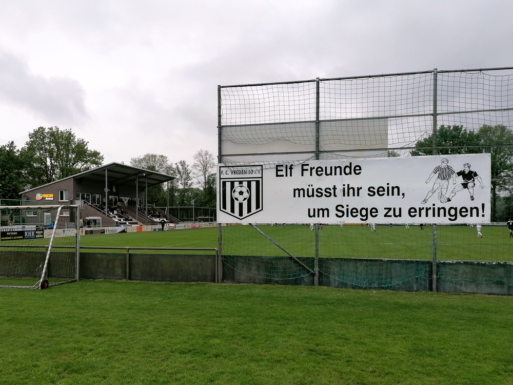 Der im Schatten des Oberligisten und unmittelbaren Platznachbarn Spvgg Vreden stehende FC 52 empfing den TuS Wüllen aus dem Kreis Ahaus. Die Gäste, erst im vergangenen Jahr aus der Bezirksliga abgestiegen, standen kurz vor dem freien Fall in die Kreisliga B. Um nach dem eh schon dünnen Strohhalm zu greifen, mussten sie drei Spieltage vor Saisonende zwingend etwas Zählbares mitnehmen. Und sie spielten auch gar nicht schlecht mit und kamen im grenzländischen Nieselregen zu einigen Chancen, die jedoch ungenutzt blieben. Die Gastgeber hatten dagegen zwar mehr Spielanteile, konnten aber keine zwingenden Szenen kreieren, so dass es torlos in die Pause ging. Unmittelbar nach dem Wechsel war es dann aber soweit und die Hausherren gingen nach einer Ecke in Führung. Der TuS kam nun auch nicht mehr zu Chancen, so dass sich die Niederlage abzeichnete und spätestens mit dem zweiten Treffer eine Viertelstunde vor Schluss besiegelt war, ebenso wie der daraus resultierende Abstieg. Der Hauptplatz des FC 52 verfügt über eine recht neue und große Tribüne mit integriertem Kabinen- und Sozialtrakt.
