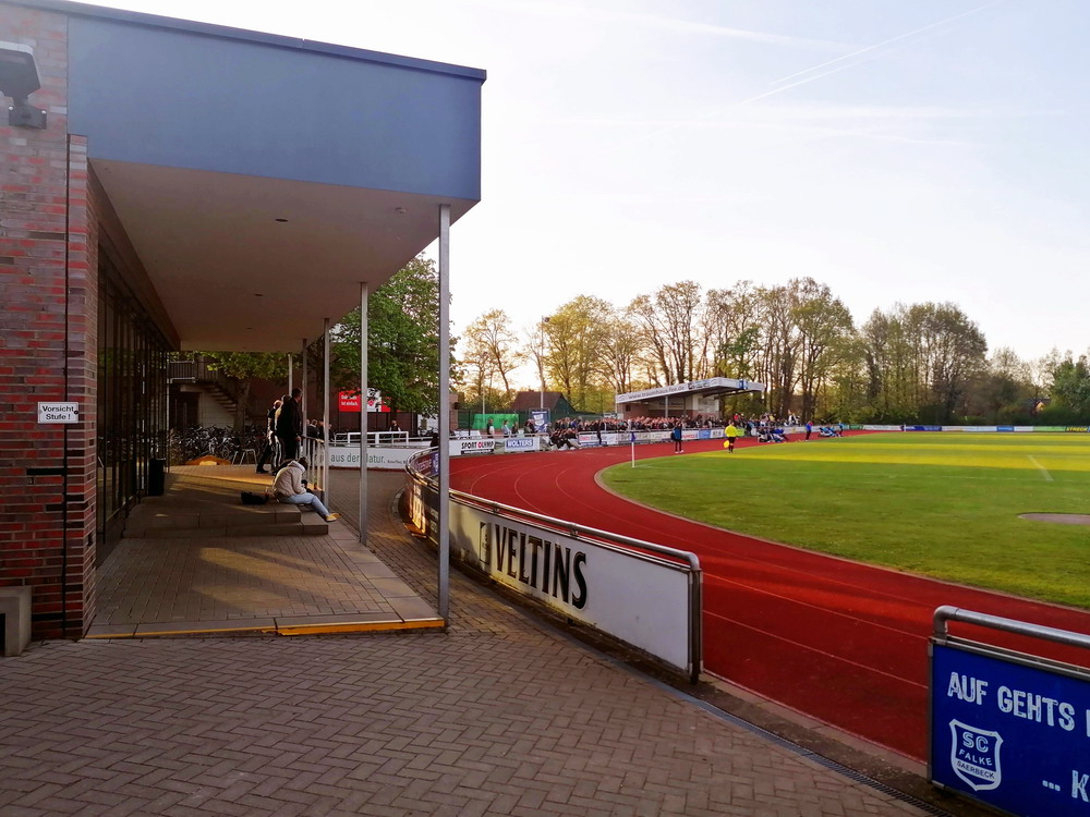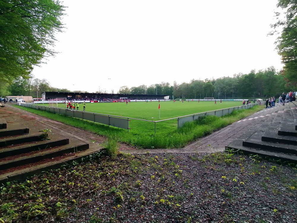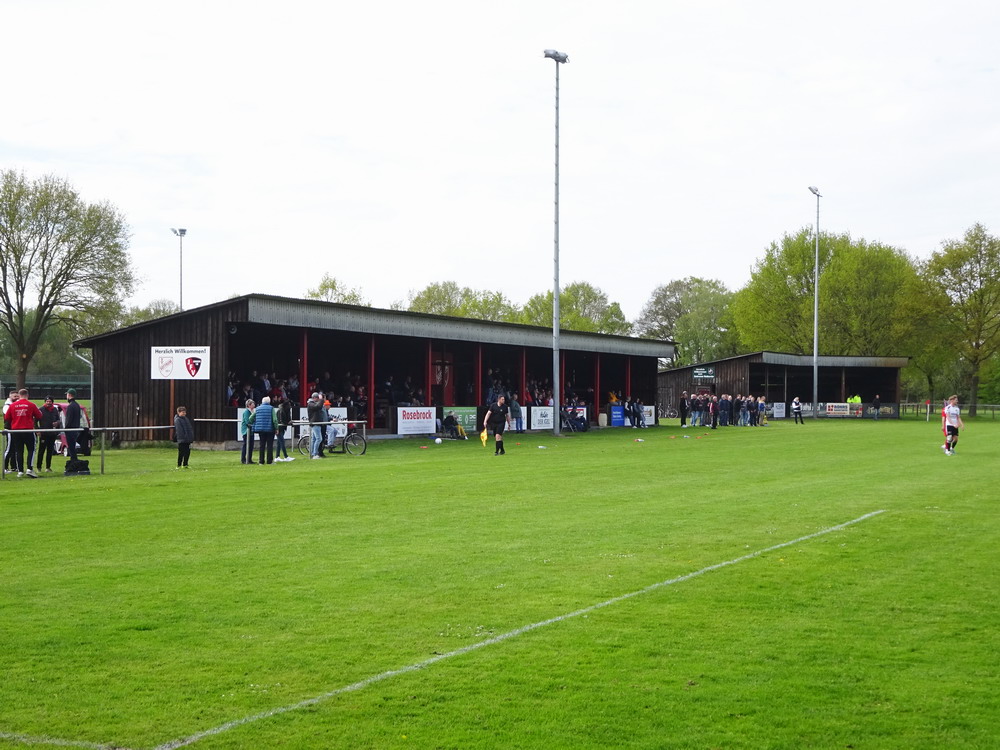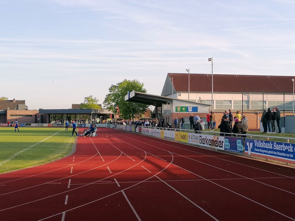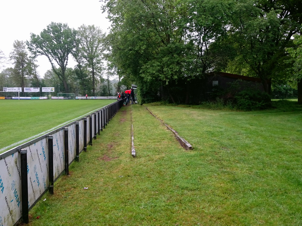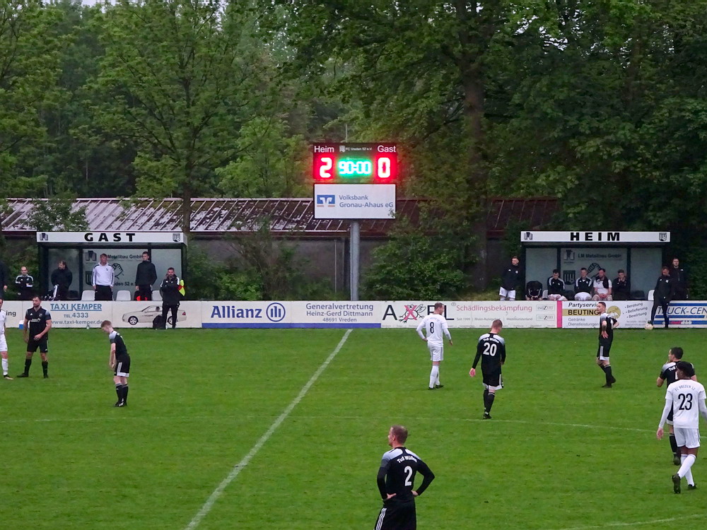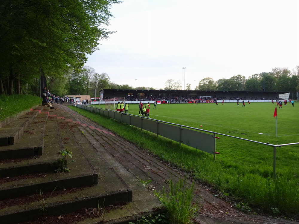 Der im Schatten des Oberligisten und unmittelbaren Platznachbarn Spvgg Vreden stehende FC 52 empfing den TuS Wüllen aus dem Kreis Ahaus. Die Gäste, erst im vergangenen Jahr aus der Bezirksliga abgestiegen, standen kurz vor dem freien Fall in die Kreisliga B. Um nach dem eh schon dünnen Strohhalm zu greifen, mussten sie drei Spieltage vor Saisonende zwingend etwas Zählbares mitnehmen. Und sie spielten auch gar nicht schlecht mit und kamen im grenzländischen Nieselregen zu einigen Chancen, die jedoch ungenutzt blieben. Die Gastgeber hatten dagegen zwar mehr Spielanteile, konnten aber keine zwingenden Szenen kreieren, so dass es torlos in die Pause ging. Unmittelbar nach dem Wechsel war es dann aber soweit und die Hausherren gingen nach einer Ecke in Führung. Der TuS kam nun auch nicht mehr zu Chancen, so dass sich die Niederlage abzeichnete und spätestens mit dem zweiten Treffer eine Viertelstunde vor Schluss besiegelt war, ebenso wie der daraus resultierende Abstieg. Der Hauptplatz des FC 52 verfügt über eine recht neue und große Tribüne mit integriertem Kabinen- und Sozialtrakt.