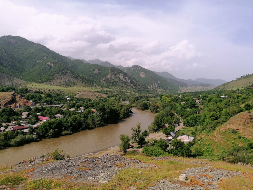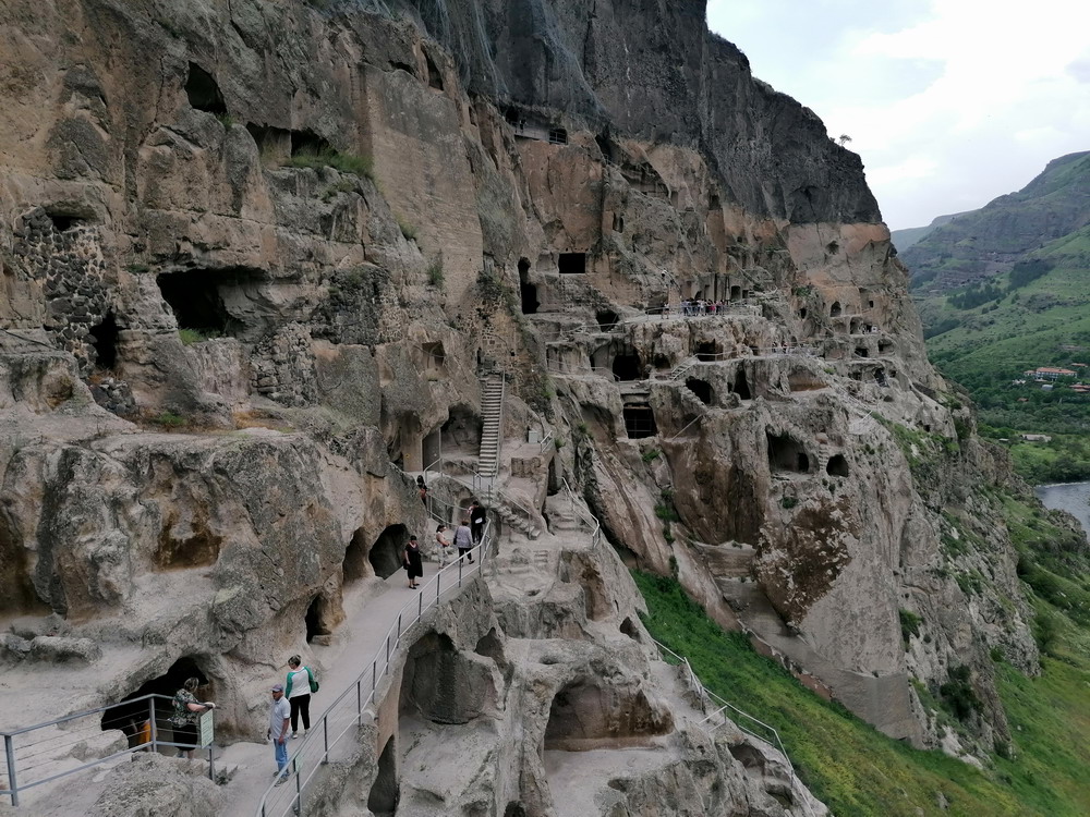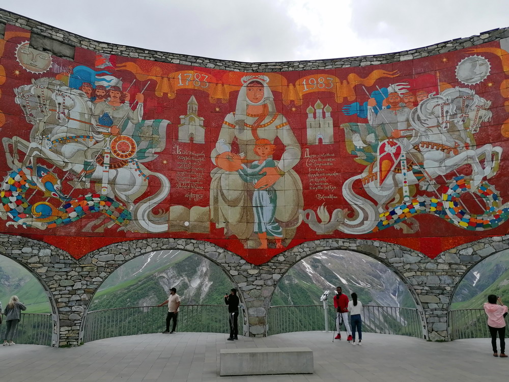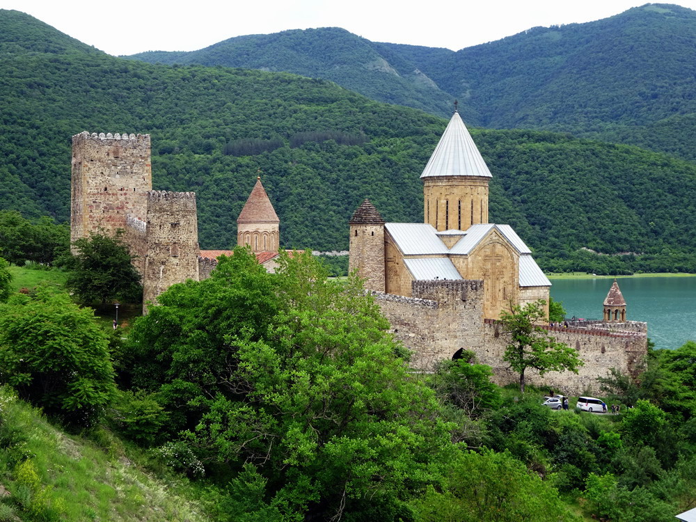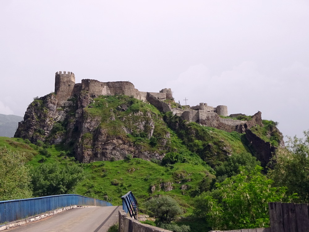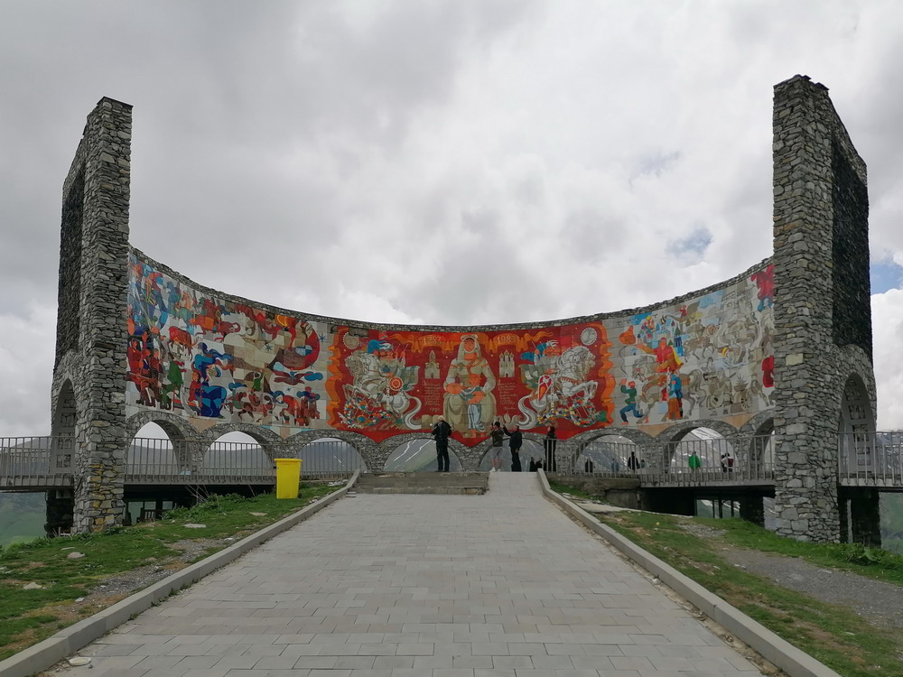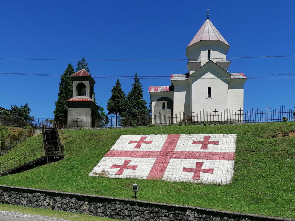 Weiter ging die Reise zunächst über die Georgische Heerstraße in den Norden des Landes ins nur noch 20 Kilometer von der russischen Grenze entfernte, auf 1700 Metern Höhe gelegene Stepantsminda. Um diesen Ort zu erreichen muss man den Dschwari-Pass auf fast 2400 Metern überwinden. Lange wird das nicht mehr notwendig sein, denn aktuell wird an einer Umgehung mit mehreren Tunneln und Brücken gearbeitet. Auf dem Weg machten wir Halt am Denkmal der russisch-georgischen Freundschaft, mit der es nicht mehr weit her sein dürfte, wenn ich die Meinungen des überwiegenden Teils der Georgier richtig deute. Stepantsminda war damals das einzige Ziel außerhalb der Hauptstadt, welches ich besuchte, und ich hatte es gut in Erinnerung. Anziehungspunkt dieser Region ist die Kirche ‚Gergetis Sameba‘, die auf einem Bergvorsprung noch einmal knapp 500 Meter höher liegt. Hier zeigte sich schon die Entwicklung, die Georgien erlebt. Vor zehn Jahren musste man sich unten im Ort noch in einen Jeep einmieten, um die Kirche über holprige Schotterwege zu erreichen, oder diese erwandern. Heute führt eine geteerte Straße auf den Berg hinauf. Während sich mir damals hinter der Kirche das wunderbare Bergpanorama bot, war jenes dieses Mal durch tiefhängende Wolken versperrt. Aber auch dieser Anblick hatte seinen Reiz. Nach Übernachtung in Stepantsminda schraubten wir uns über die Serpentinen zurück nach unten in Richtung Gori. Gori – da war doch was… es ist der Geburtsort von Iosseb Bessarionis dse Dshughashvili. Besser bekannt ist der Mann als Josef Stalin und unmittelbar neben seinem unscheinbaren Geburtshaus, das zum Schutz überdacht wurde, steht ein pompöses Museum, welches sein Leben und Wirken erklärt. Der persönliche Eisenbahnwagen des Stählernen hat auch Platz auf dem Gelände gefunden. Weiter ging es ins Nachtquartier nach Martvili, wo wir am nächsten Morgen zunächst den kleinen aber sehenswerten Canyon besuchten, in den sich das Flüsschen Abasha eingegraben hat, bevor wir wieder ins Gebirge hinauffuhren.