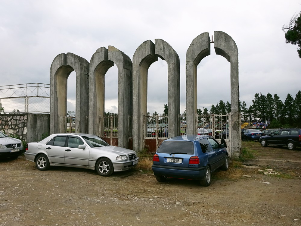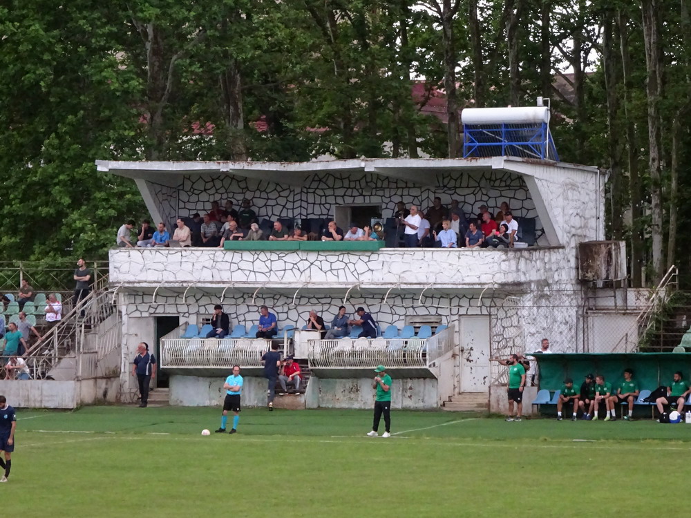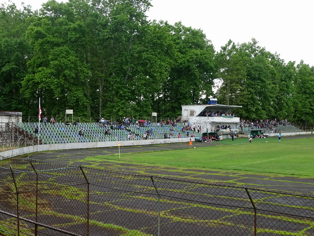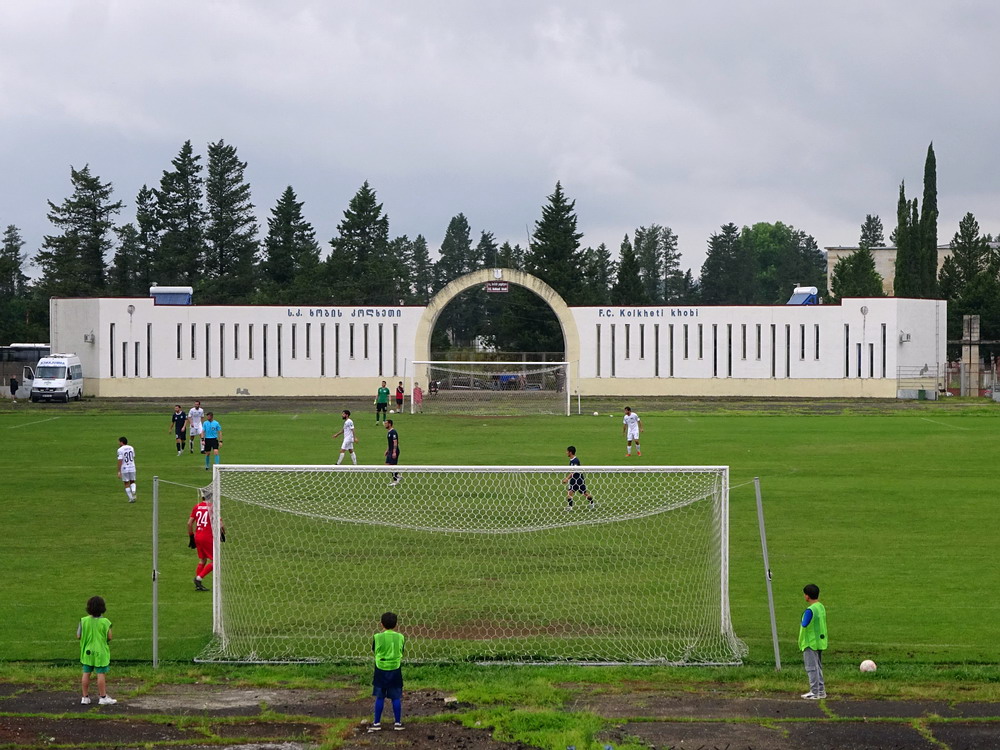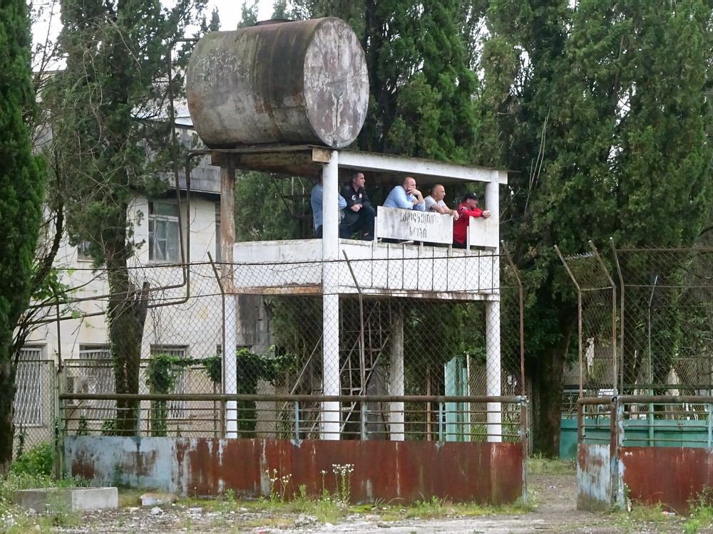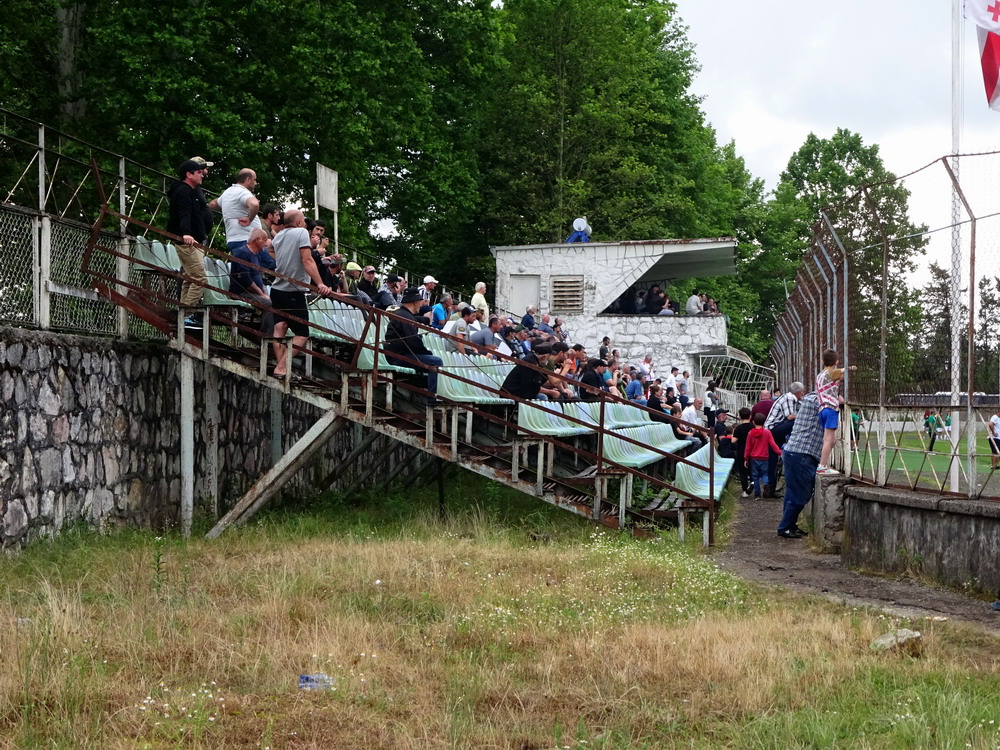 Eigentlich hätte es von Ushguli über den 2.600 Meter hohen Zagari-Pass auf anderem Wege zurück in Richtung Kutaisi gehen sollen, aber die Sache war nicht zu Ende gedacht. Die Passstraße ist natürlich unbefestigt und vorausschauend hatten wir einen Subaru-Crossover-SUV mit guter Bodenfreiheit gebucht, aber der Juni ist für solche Abenteuer einfach noch zu früh und das hätte mir auch klar sein müssen. Schmelzwasser und Regenfälle machen den Pass ohne gute Offroadbereifung unbefahrbar. Unser allradbetriebener Japaner kletterte zwar tapfer nach Ushguli hinauf, aber wir folgten dann dem Rat der Einheimischen, die uns mit Blick auf die Bereifung vom geplanten Abenteuer abrieten. Also nahmen wir nach der zweiten Nacht in Mestia denselben Weg zurück, der ja auch sehenswert genug ist, um erneut befahren zu werden. Man passiert auch den Enguri-Staudamm, die mit 271 Metern Höhe aktuell siebtgrößten Talsperre weltweit. Ziel war Khobi, wo am heutigen Samstag um Zweitliga-Punkte gekickt wurde. Das Stadion ist Traum in verrostetem Stahl, leider wurde aber vor einigen Jahren die klapprige Tribüne in einer der Kurven abgerissen, die andere verfügte seit jeher nicht über Ausbau. Dennoch bleibt das Rund besonders. Es regnete bei Spielbeginn, daher suchten wir in diesem abgeranzten, bis auf einige Ehrenplätze unüberdachten Stadion nach einem Wetterschutz und fanden diesen neben ein paar Einheimischen auf einem Stahlbetongestell, das früher einmal die Anzeigetafel war. Ein paar hundert Leute waren am Spielgeschehen interessiert, vielleicht zwei Dutzend unterstützten das Team auch akustisch mit einer Trommel und einigen Vuvuzelas. Spielerisch war es ganz okay und die Gastgeber schafften es, den Gegner aus Tbilisi beinahe 90 Minuten in die Defensive zu drängen und reichlich Chancen herauszuspielen, um dann am Ende doch zu unterliegen, da das Gäste-Team seine einzige Chance zu nutzen wusste. Dabei war diese nicht einmal selbst herausgespielt. Ein zu kurz geratener Befreiungsschlag des Torwarts wurde etwa 35 bis 40 Mieter vor dem Tor gestoppt und mit einem langen Hub über den unglücklichen Schnappnix in die Maschen gehieft. So kann’s gehen.