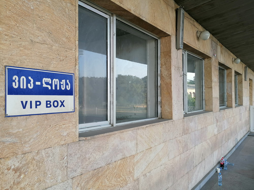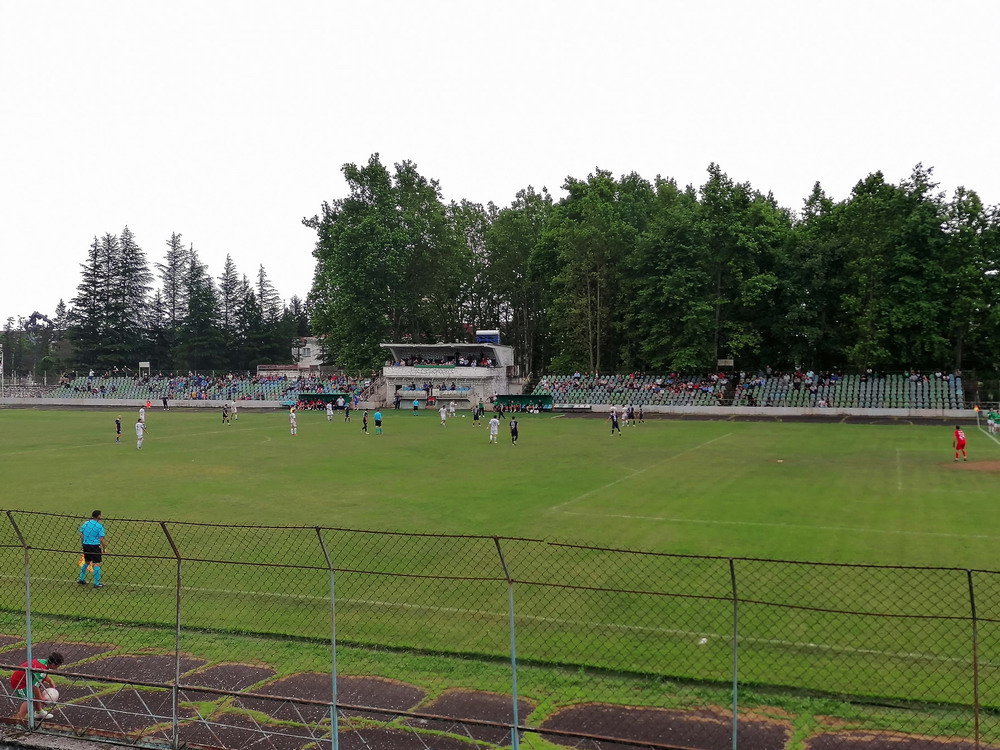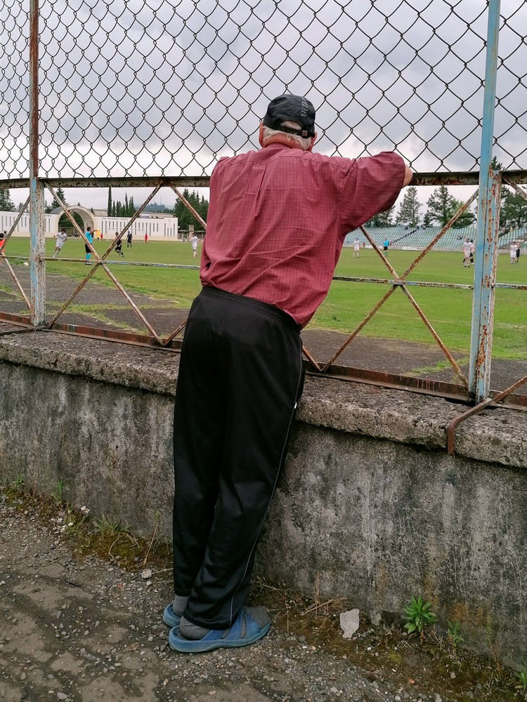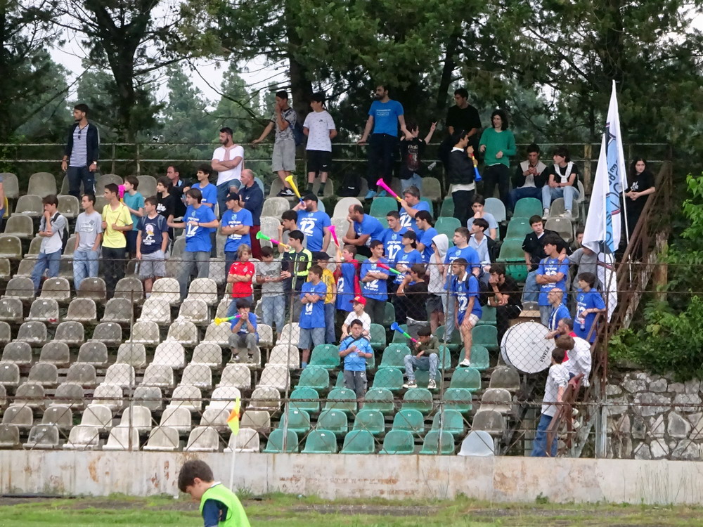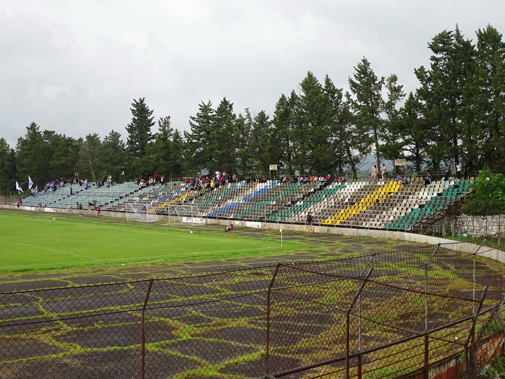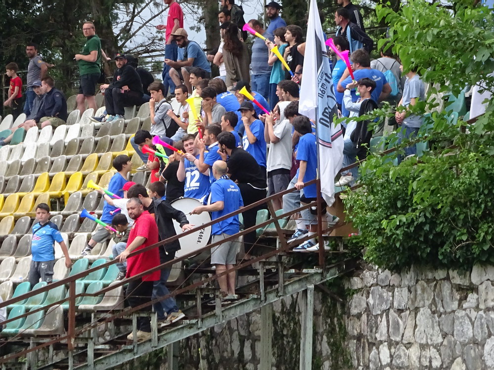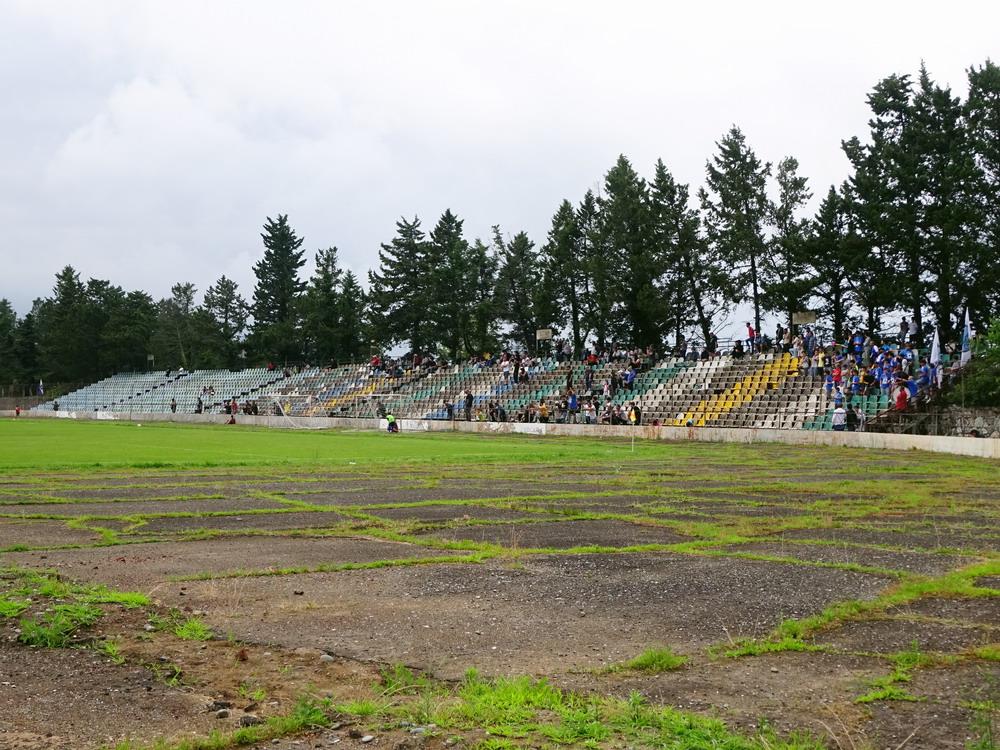Eigentlich hätte es von Ushguli über den 2.600 Meter hohen Zagari-Pass auf anderem Wege zurück in Richtung Kutaisi gehen sollen, aber die Sache war nicht zu Ende gedacht. Die Passstraße ist natürlich unbefestigt und vorausschauend hatten wir einen Subaru-Crossover-SUV mit guter Bodenfreiheit gebucht, aber der Juni ist für solche Abenteuer einfach noch zu früh und das hätte mir auch klar sein müssen. Schmelzwasser und Regenfälle machen den Pass ohne gute Offroadbereifung unbefahrbar. Unser allradbetriebener Japaner kletterte zwar tapfer nach Ushguli hinauf, aber wir folgten dann dem Rat der Einheimischen, die uns mit Blick auf die Bereifung vom geplanten Abenteuer abrieten. Also nahmen wir nach der zweiten Nacht in Mestia denselben Weg zurück, der ja auch sehenswert genug ist, um erneut befahren zu werden. Man passiert auch den Enguri-Staudamm, die mit 271 Metern Höhe aktuell siebtgrößten Talsperre weltweit. Ziel war Khobi, wo am heutigen Samstag um Zweitliga-Punkte gekickt wurde. Das Stadion ist Traum in verrostetem Stahl, leider wurde aber vor einigen Jahren die klapprige Tribüne in einer der Kurven abgerissen, die andere verfügte seit jeher nicht über Ausbau. Dennoch bleibt das Rund besonders. Es regnete bei Spielbeginn, daher suchten wir in diesem abgeranzten, bis auf einige Ehrenplätze unüberdachten Stadion nach einem Wetterschutz und fanden diesen neben ein paar Einheimischen auf einem Stahlbetongestell, das früher einmal die Anzeigetafel war. Ein paar hundert Leute waren am Spielgeschehen interessiert, vielleicht zwei Dutzend unterstützten das Team auch akustisch mit einer Trommel und einigen Vuvuzelas. Spielerisch war es ganz okay und die Gastgeber schafften es, den Gegner aus Tbilisi beinahe 90 Minuten in die Defensive zu drängen und reichlich Chancen herauszuspielen, um dann am Ende doch zu unterliegen, da das Gäste-Team seine einzige Chance zu nutzen wusste. Dabei war diese nicht einmal selbst herausgespielt. Ein zu kurz geratener Befreiungsschlag des Torwarts wurde etwa 35 bis 40 Mieter vor dem Tor gestoppt und mit einem langen Hub über den unglücklichen Schnappnix in die Maschen gehieft. So kann’s gehen.