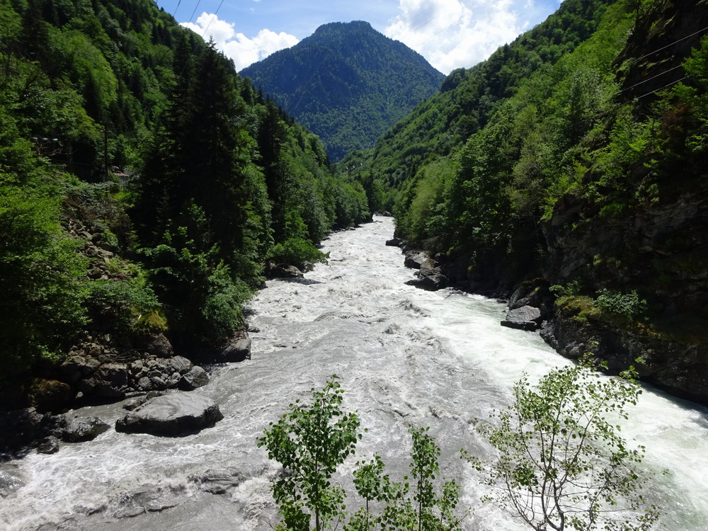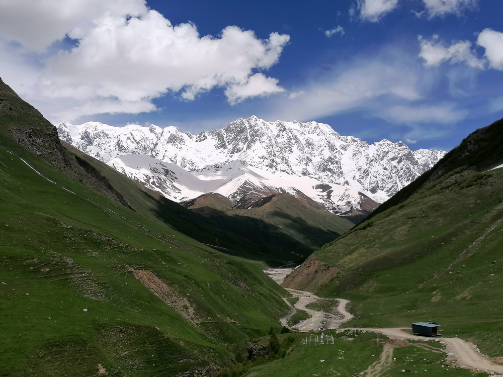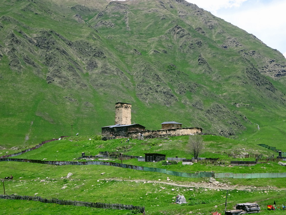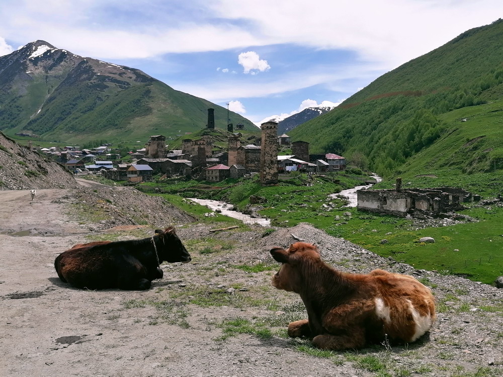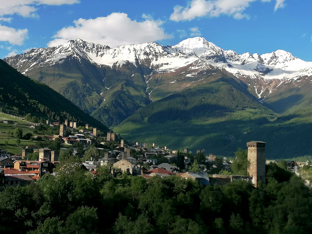 Oberswanetien war das Ziel und es sollte das Highlight der Reise sein und werden. Das Tagesziel war Mestia auf 1.500 Meter, wo wir für zwei Nächte unser Lager aufschlugen. Dieser 2.000 Einwohner starke Ort ist schon stark touristisch orientiert, von dort starten verschiedene Trecking-Touren ins Hochgebirge. Wie auf den meisten Strecken in den Tagen zuvor, regierte auch auf dieser Strecke wieder die Langsamkeit. Für die 180 Kilometer von Martvili nach Mestia benötigten wir ohne Stress, aber auch ohne zu Trödeln, mit ein paar wenigen Stopps gute fünf Stunden. Bis auf eine Autobahn ab Tbilisi Richtung Schwarzmeerküste, die aber auch erst in Teilstücken vollendet ist, gibt es in Georgien nur Landstraßen, die sich mal in besserem, mal in schlechterem Zustand offenbaren. Durch das Profil des Landes bestehen die meisten Straßen nur aus Kurven, man braucht also Geduld. Am Folgetag machten wir einen Tagesausflug nach Ushguli, 45 Kilometer von Mestia entfernt. Die letzten sechs oder sieben Kilometer Straße sind unbefestigt, man rumpelt über Stock und Stein. Von Mestia aus benötigt man gute eineinhalb Stunden für die Strecke und der Weg lohnt sich. Ushguli besteht aus vier Dörfern und das höchstgelegen befindet sich auf knapp 2.200 Metern. Obersvanetien ist bekannt für seine Wehrtürme, die sich in der Vergangenheit jeder Familienclan zum Schutz vor Angriffen baute. In Ushguli schnürten wir die Wanderschuhe und machten uns ein Stück auf den Weg in Richtung des Schara-Gletschers ohne das Ziel diesen erreichen zu wollen. Das Bergpanorama mit den bis über 5.000 Meter hohen Gipfeln war bei bestem Wetter fantastisch anzusehen.