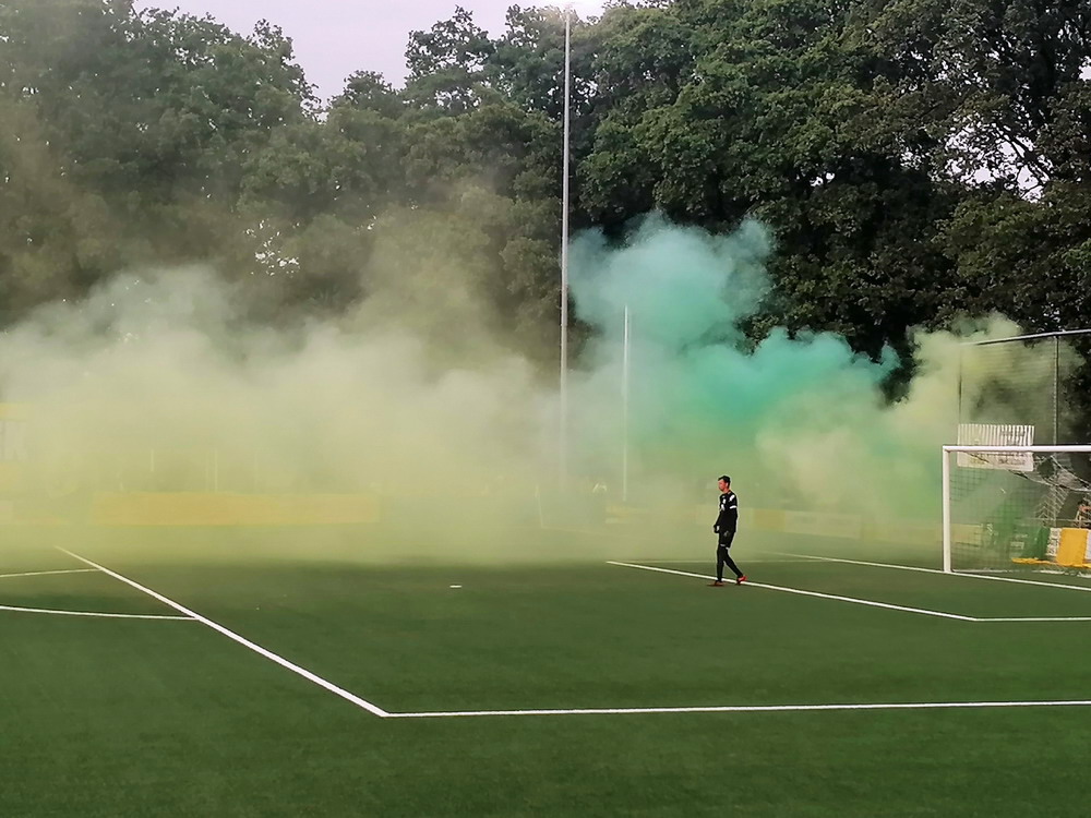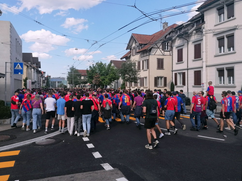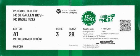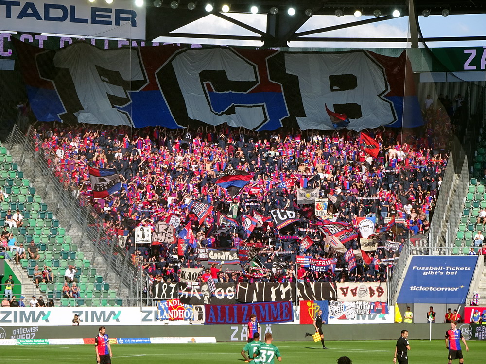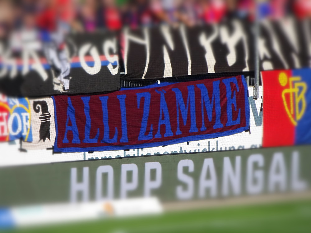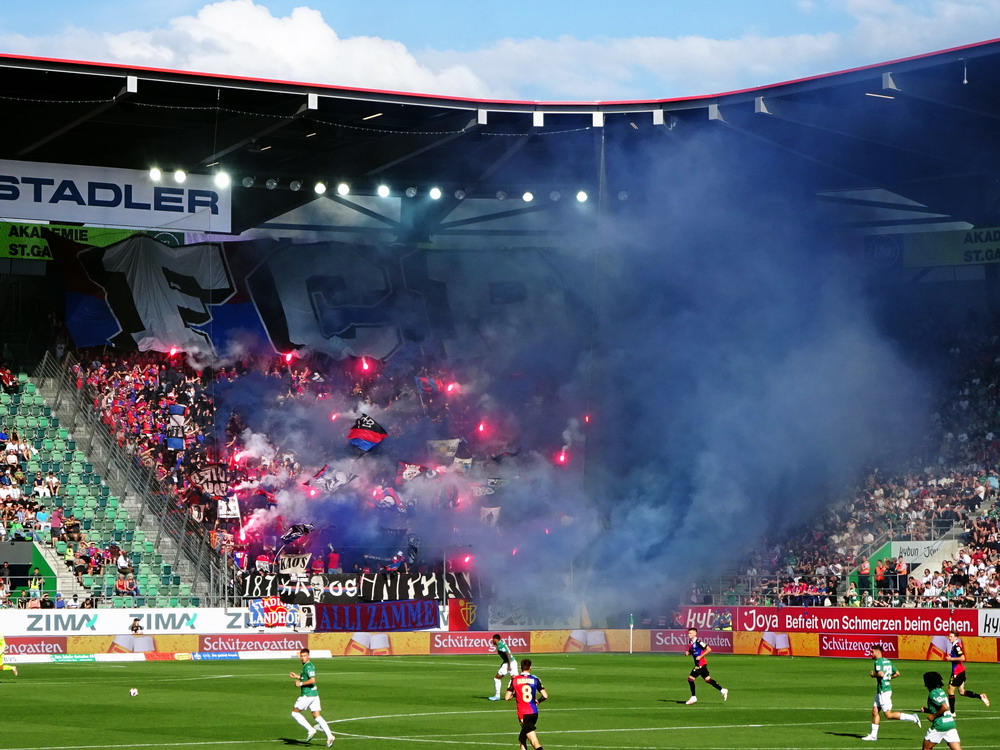 Die Gäste aus Basel füllten ihren Block komplett und konnten die LED-Bande dank entsprechender Hinweise und Koordination des FCSG-Anhangs erfolgreich mit einem großen Banner überhängen. Zum Intro gab es dann Fackeln und eine ordentliche Rauchwolke zu sehen. Dass der Support aus dem Gästeblock ebenfalls ansprechend war, braucht wohl nicht extra erwähnt zu werden. Sangallä nahm in einem recht temporeichen Spiel das Heft in die Hand, musste aber gegen kompakte Gäste hohen Aufwand betreiben, um die verdiente Führung per Abstauber zu erzielen, nachdem Ex-FCA- und Ex-BVB-Schnapper Marwin Hitz die Kirsche nach einem Fernschuss nicht festhalten konnte. Nur wenige Minuten später glich der FCB durch einen abgefälschten Freistoß mit dem Halbzeitpfiff glücklich aus. Die Gastgeber ließen sich nicht irritieren und machten nach dem Seitenwechsel einfach weiter. Bei einer 120%igen Chance lag die erneute Führung in der Luft und schien nur noch eine Frage der Zeit. Die Gäste dezimierten sich dann per Ampelkarte und wie so oft, zog das bei der nun in Überzahl spielenden Mannschaft den Stecker. Platzverweise bringen Spielgeschehen erstaunlich oft auf die ‚falsche‘ Art durcheinander. Als sich wohl alle langsam mit dem Remis abfanden, fiel nach einem Schuss von der Strafraumgrenze doch noch der Siegtreffer für das Team in ‚grüewiss‘ und bescherte Mannschaft und Fans den Glücksmoment des gelungenen Saisonstarts.