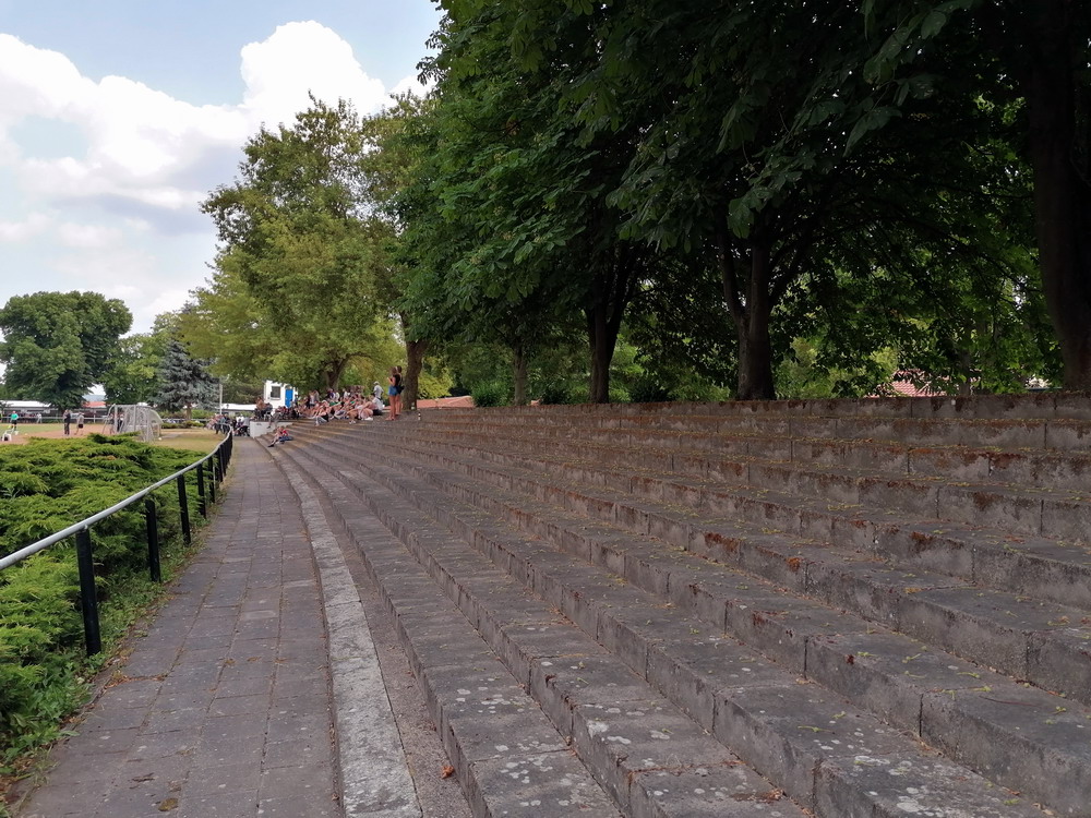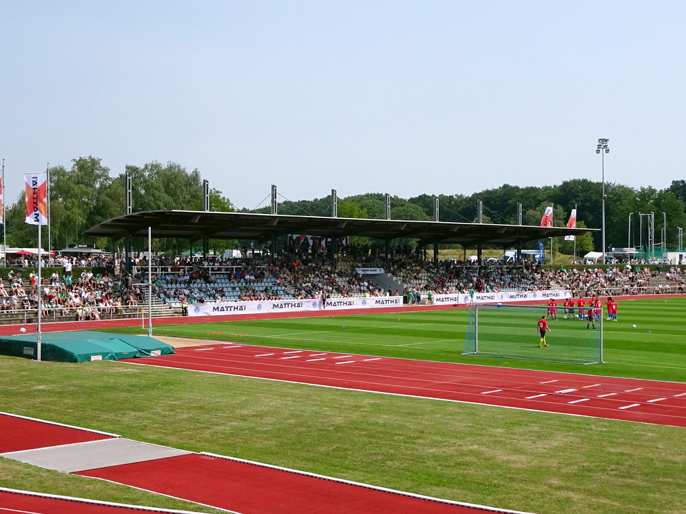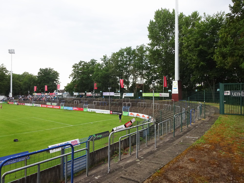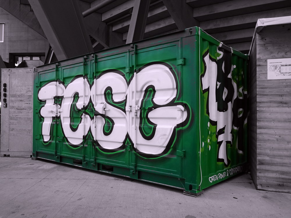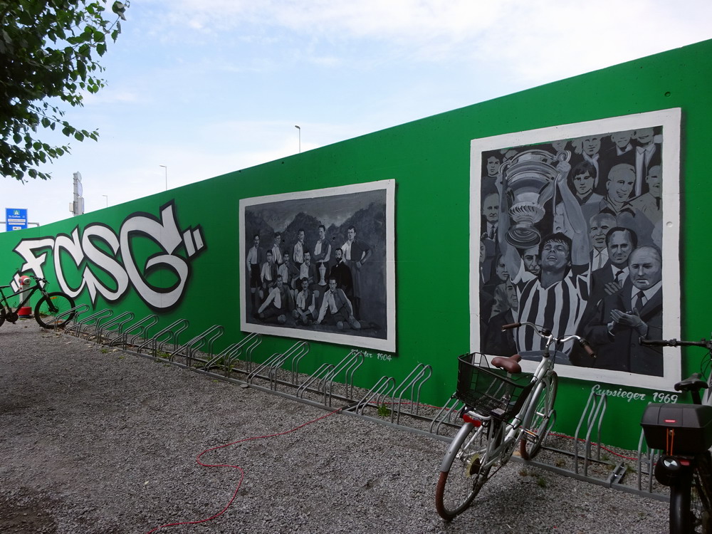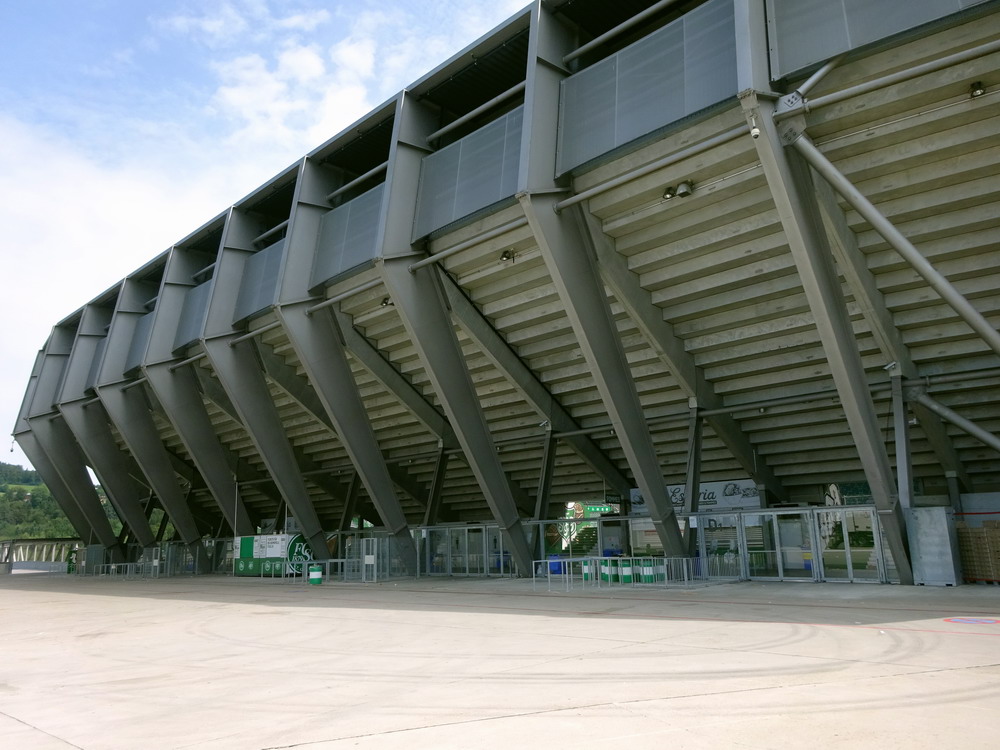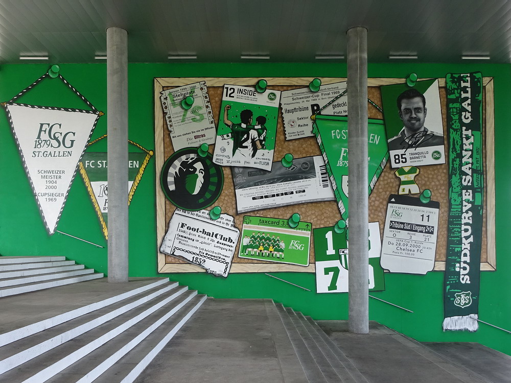 Vor gut zehn Jahren sah ich schon einmal ein Spiel in St. Gallen. Damals entschied sich die Szene der Gäste aus Bern kurzfristig für einen Boykott. Grund waren Restriktionen aus dem Besuch des Spiels in der vorherigen Spielzeit. Damals hatten Willkür des Ordner-Personals und daraus entstehender Ärger einige Stadionverbote für den YB-Anhang zur Folge, sodass nur wenige Szene-fremde Anhänger aus der Hauptstadt angereist waren. Der fehlende Gäste-Mob zog der Partie damals natürlich ziemlich den Zahn, so dass ein erneuter Besuch nach langer Zeit durchaus Reiz hatte, um das St. Gallener Stadion auch mal von beiden Kopfseiten her stimmungsvoll zu erleben. Das erst wenig mehr als zehn Jahre alte Stadion weicht von der Innenansicht natürlich nicht von anderen Arenen dieser Bauart ab. Wie auch – im Gegensatz zur Fassade gibt es im Innenleben nicht zu viele Gestaltungsoptionen. Unter dem Spielort befindet sich ein Einkaufszentrum. Solche multifunktionalen Bauten gefallen mir – losgelöst von der Optik – eher nicht. In meiner Vorstellung steht ein Stadion (egal ob Neubau oder nicht) im besten Falle an seinem angestammten, ursprünglichen Platz und ist dort auch einfach nur ein Stadion. Dass diese Vorstellung im modernen Fußball eher romantische Verklärung bedeutet, ist mir natürlich bewusst. Mit Wehmut denkt der Anhang von ‚Sangallä‘, wie der Verein im Kantons-Jargon tituliert wird, sicherlich noch an das enge, alte ‚Espenmoos‘ zurück, welches genau am anderen Ende der Stadt liegt. Von diesem ist nur die denkmalgeschützte, in Muschelform erbaute Haupttribüne übrig. Bespielt wird der Ground noch von der Reserve des FCSG. Mit dem Spielbesuch verband ich ein Zusammentreffen mit Andrin, Administrator des Blogs andrinunterwegs, welchen ich hiermit empfehlen möchte. Andrin weiß über seine Spielbesuche in sehr angenehmer Art in nicht zu extensiven, aber stets mit einigen Randinformationen versehenen Texten zu berichten und weicht damit wohltuend vom strikten Groundhopping-Stil ab.