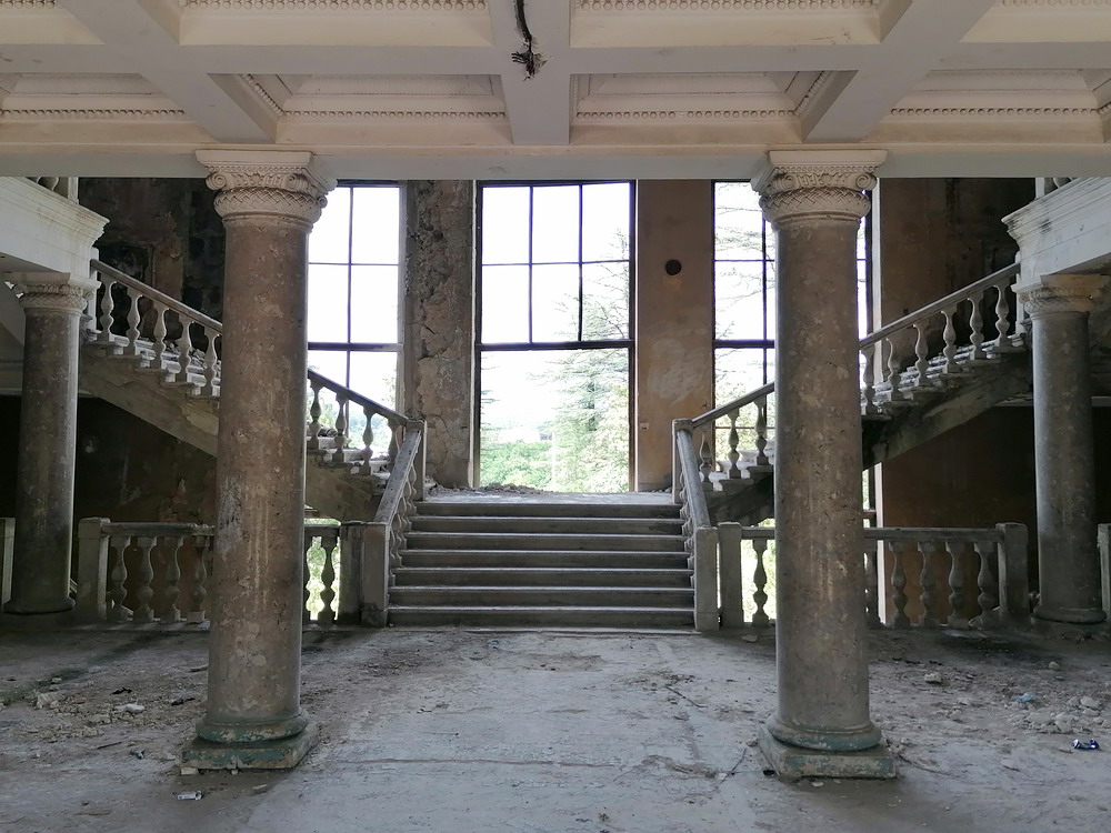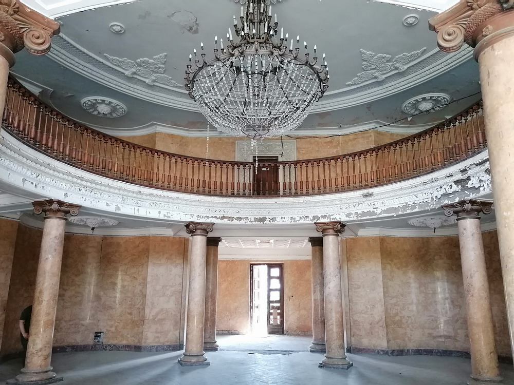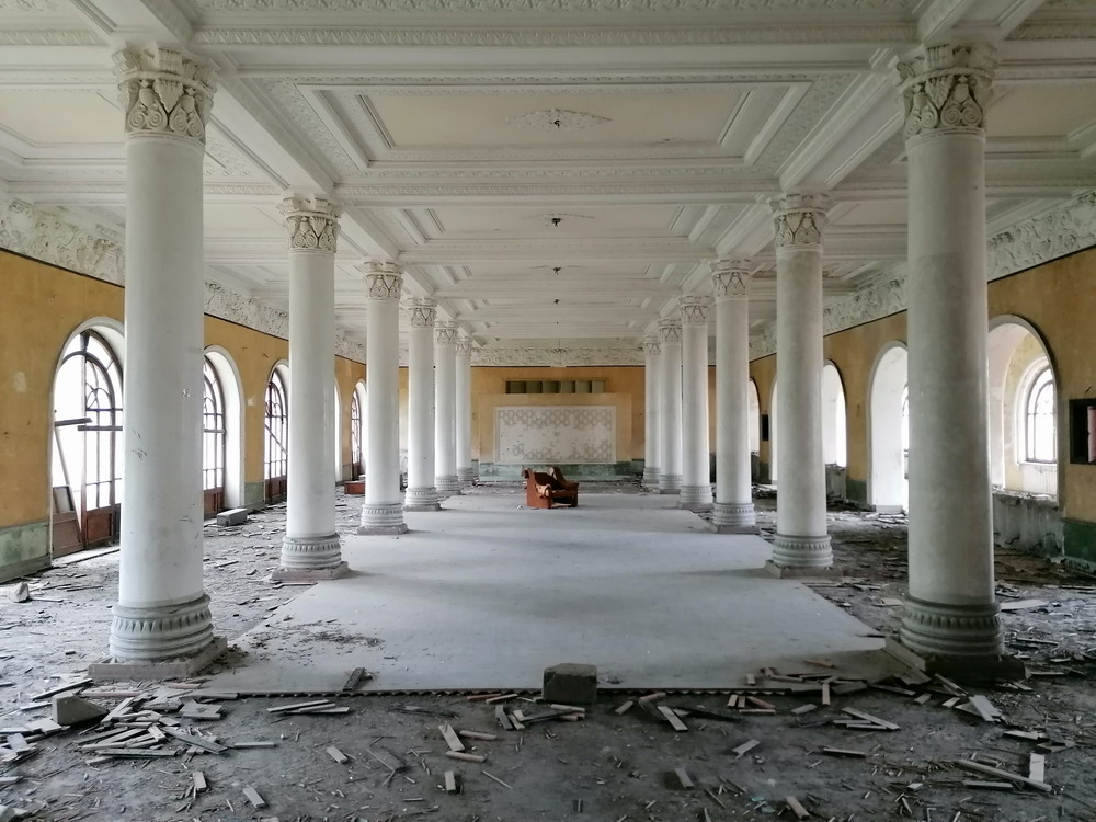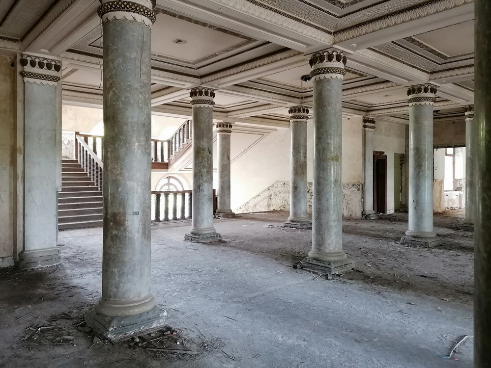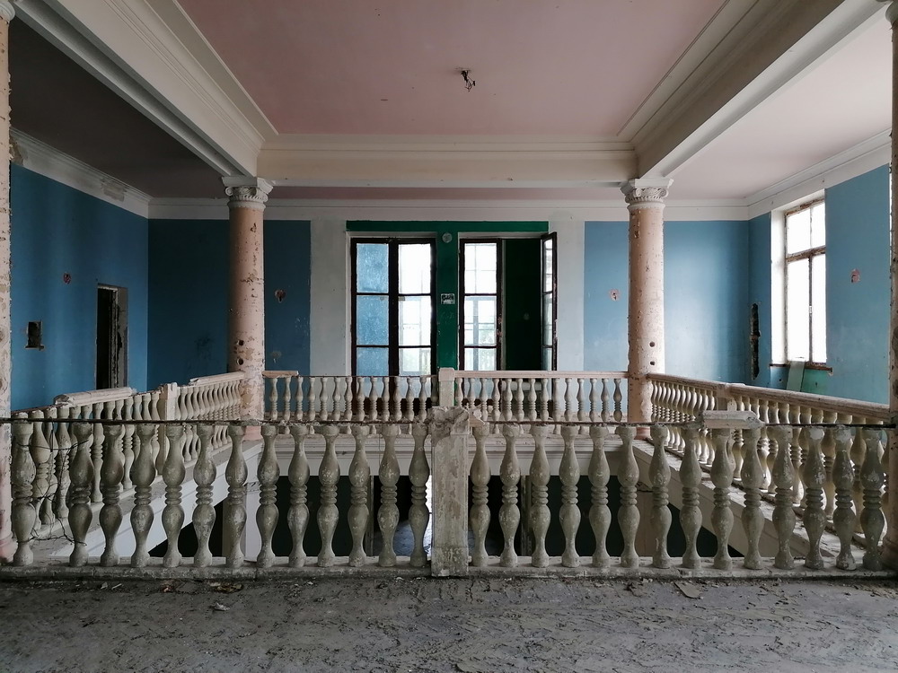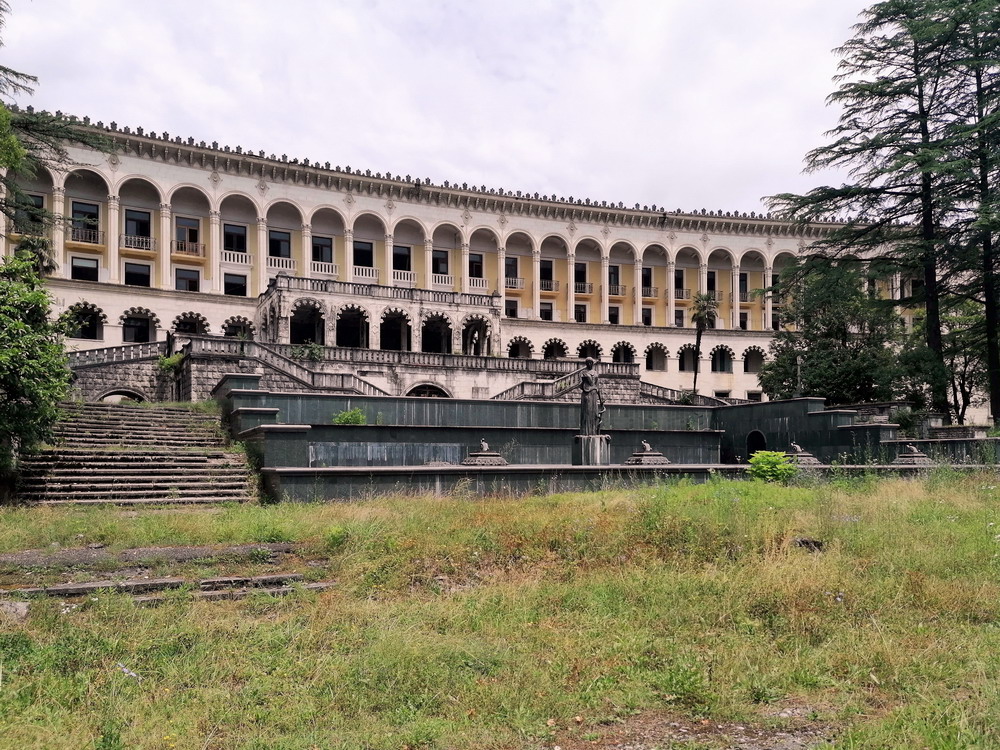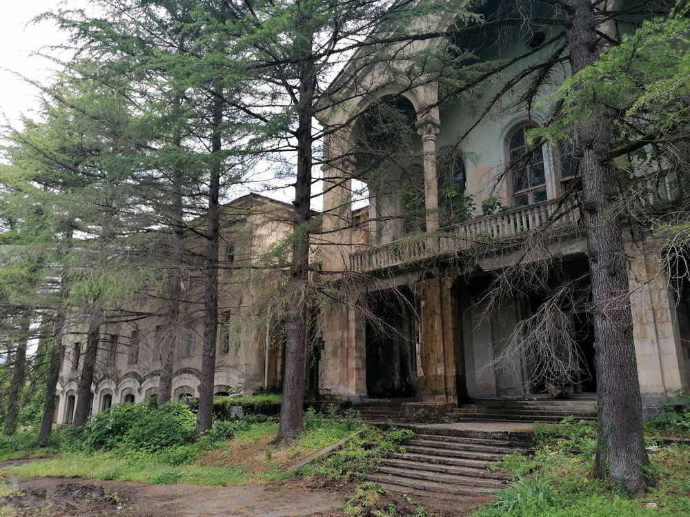 Für den letzten vollen Tag hatten wir uns noch einen ganz speziellen Ort aufgehoben. Wir fuhren nach Zqaltubo, ehemals einer der bedeutendsten Kurorte der Sowjetunion. Mit dem Niedergang dieses erzwungenen Staaten-Konstruktes setzte auch in Zqaltubo der Verfall ein und es entwickelte sich über die Jahre ein einzigartiger riesiger Lost Place. Ein gutes Dutzend Sanatorien, einige einfache Hotels und Kureinrichtungen gammeln seitdem weitestgehend unberührt vor sich hin. Einige der Sanatorien wurden durch Wohnungslose okkupiert, viele davon Geflüchtete aus den abtrünnigen Landesteilen Abchasien und Südossetien, denen von der georgischen Regierung Wohnungen in Aussicht gestellt, diese aber nie verwirklicht wurden. Die Stadt soll als Kurort aber wiederbelebt werden. Einige der alten Prachtbauten wurden bereits an Investoren veräußert, es tut sich allerdings bisher wenig. In der weitläufigen Kurpark-Anlage sind zwei der Bäder nach wie vor aktiv. Sanierungsarbeiten an den Heilanstalten sind lediglich am Sanatorium Tbilisi im Gange, andere aber bereits eingezäunt, was deren Besichtigung etwas schwieriger gestaltete. Aber letztlich geht es ja immer irgendwie, natürlich unter Abwägung des Risikos. Wir schauten uns das prächtige Sanatorium Shakhtiori, das Gelati, Metalurgist, Medea und Imereti an. Teilweise mussten selbsternannte Wärter – die einen freundlich, andere weniger freundlich – umschifft werden. Außerdem mühten wir uns, in den ‚bewohnten‘ Häusern den dort unter teils zweifelhaften Bedingungen hausenden Personen ihre Ruhe zu lassen und mieden diese Bereiche, einerseits um unnötigen Ärger zu vermeiden, aber viel mehr um diesen vom Schicksal gestraften Menschen gegenüber Respekt zu zeigen. Einrichtungsgegenstände sind in den Gebäuden nicht viele zu finden, aber diese bieten dennoch fantastische Motive mit alten Speise- und Konzertsälen, Theatern, gemusterten Tapeten, völlig intakten Stuckdecken. Glanzpunkt war der mächtige Kronleuchter in der Empfangshalle des Sanatorium Metalurgist. Allein ist man in den wenigsten Häusern. Man trifft immer wieder mal auf Gleichgesinnte, diese Begegnungen sind zum Glück aber doch selten, so dass die mystisch angehauchte Atmosphäre erhalten bleibt.