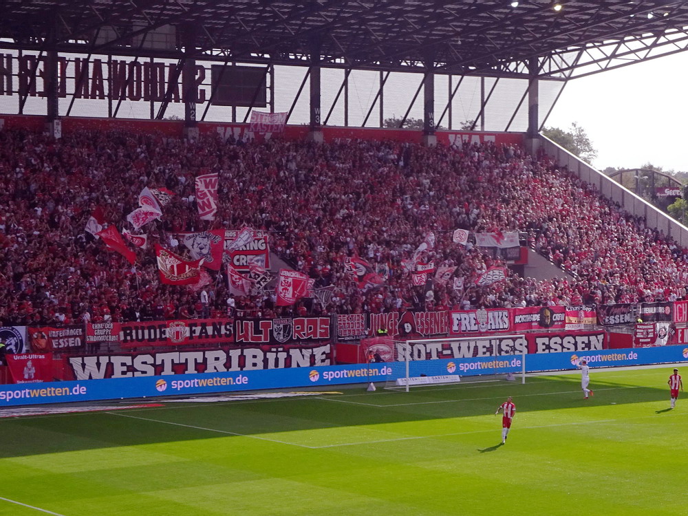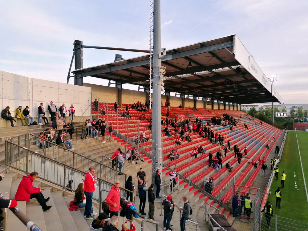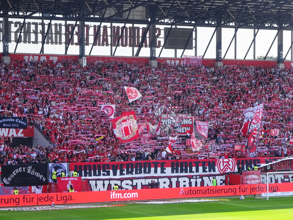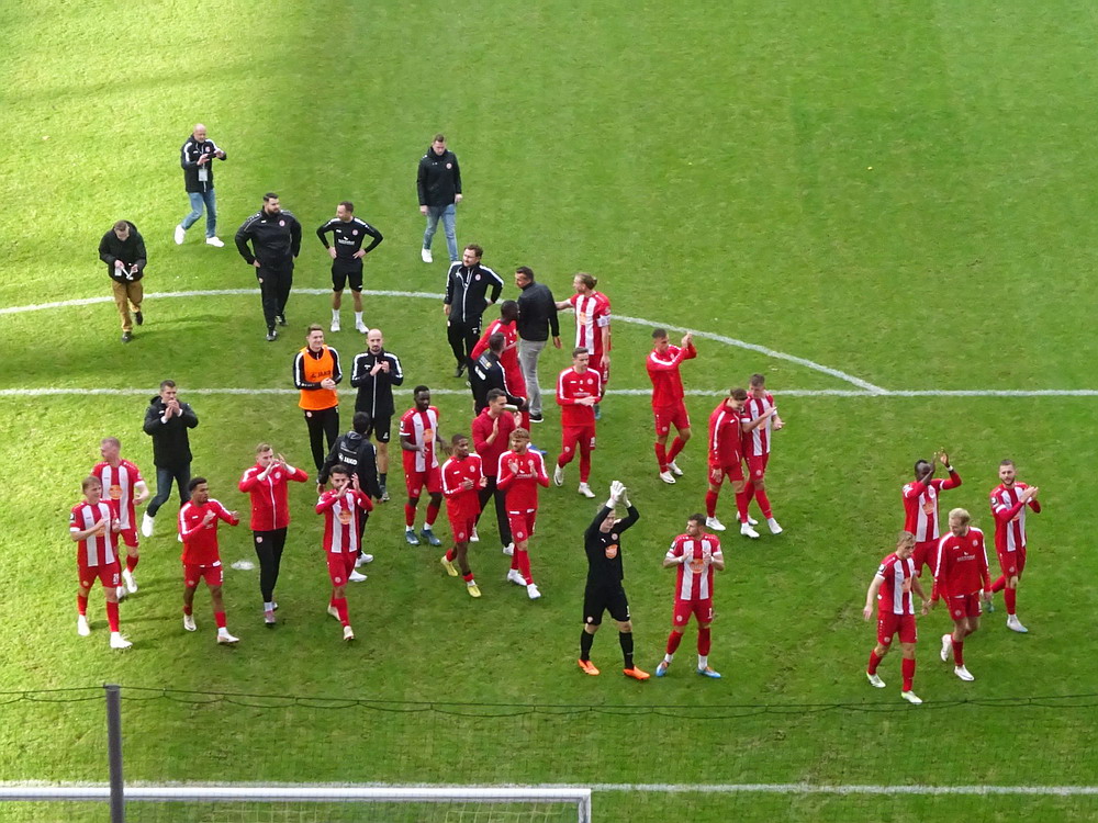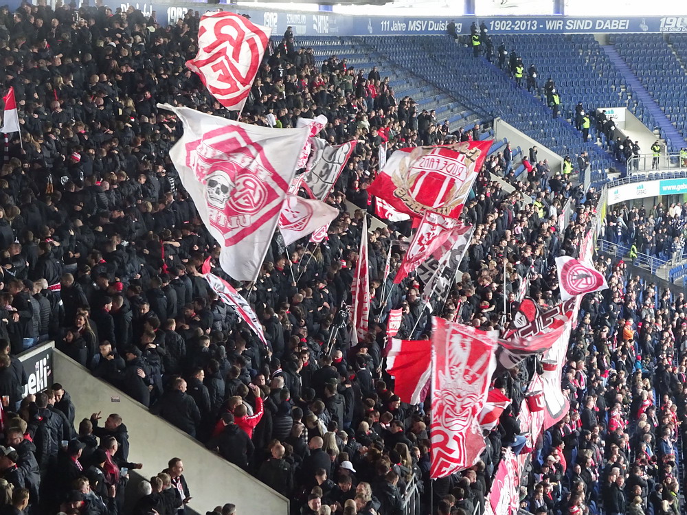 Der Strafstoß wurde sicher verwandelt und die Gäste spielten danach 83 Minuten ihren Stiefel runter. Die Adler waren in Unterzahl nicht hoffnungslos unterlegen, es fehlten aber die Mittel um offensiv gefährlich zu werden. Der früh nach der Pause erzielte zweite Treffer war eigentlich nur am Rande interessant, denn das gesamte Publikum döste aufgrund der einseitigen und dadurch todlangweiligen Partie vor sich hin. Auch vom doppelten Uerdinger Ultra-Dutzend kam nicht viel, insgesamt beschlich mich ein Pre-Season-Friendly-Feeling. Die Punkte gegen den Abstieg müssen aber eh gegen andere Clubs geholt werden. Nach Spielende gab es dann auf der Straße vor der Anlage noch etwas Rennerei. Ich war eh überrascht, dass dieses Heimspiel auf der recht ungeschützten Platzanlage ohne echte Fantrennung stattfinden durfte. Da war für einige Erlebnisorientierte aus dem rot-weissen Lager die Versuchung wohl doch zu groß. Außer viel Blaulicht und übertriebener Anzahl zusammengezogener Streifenwagen ist aber offenbar nicht viel passiert.