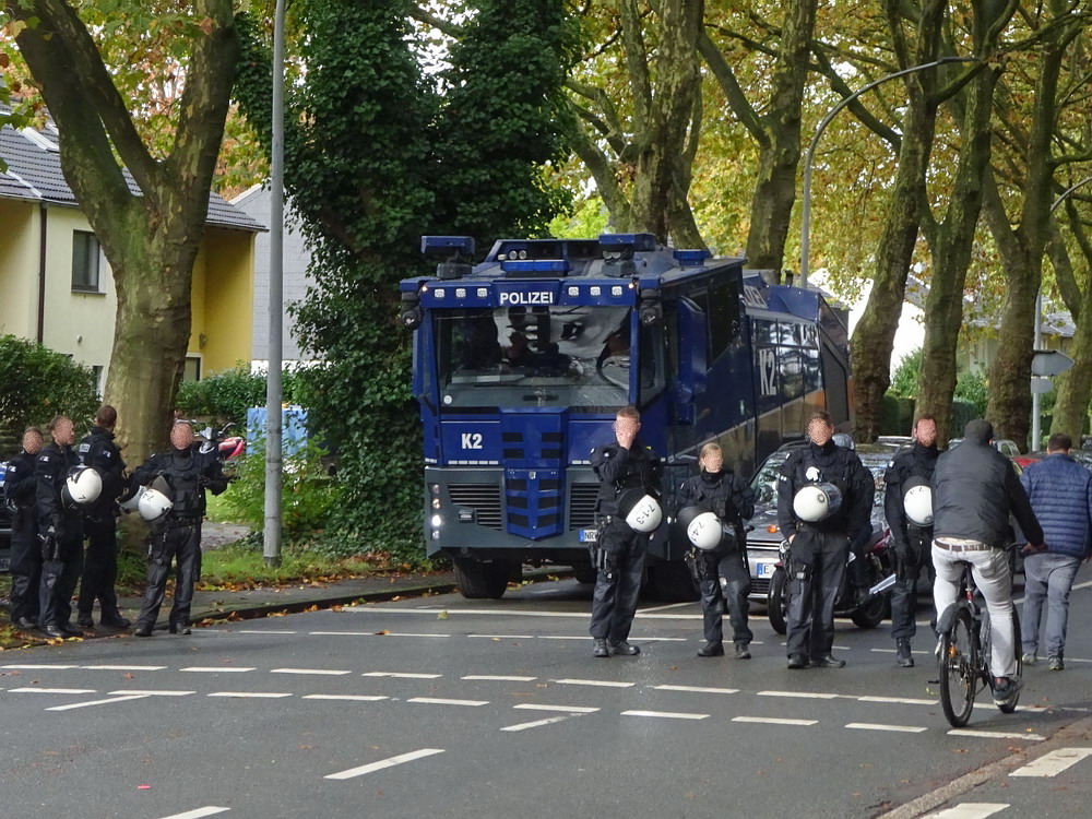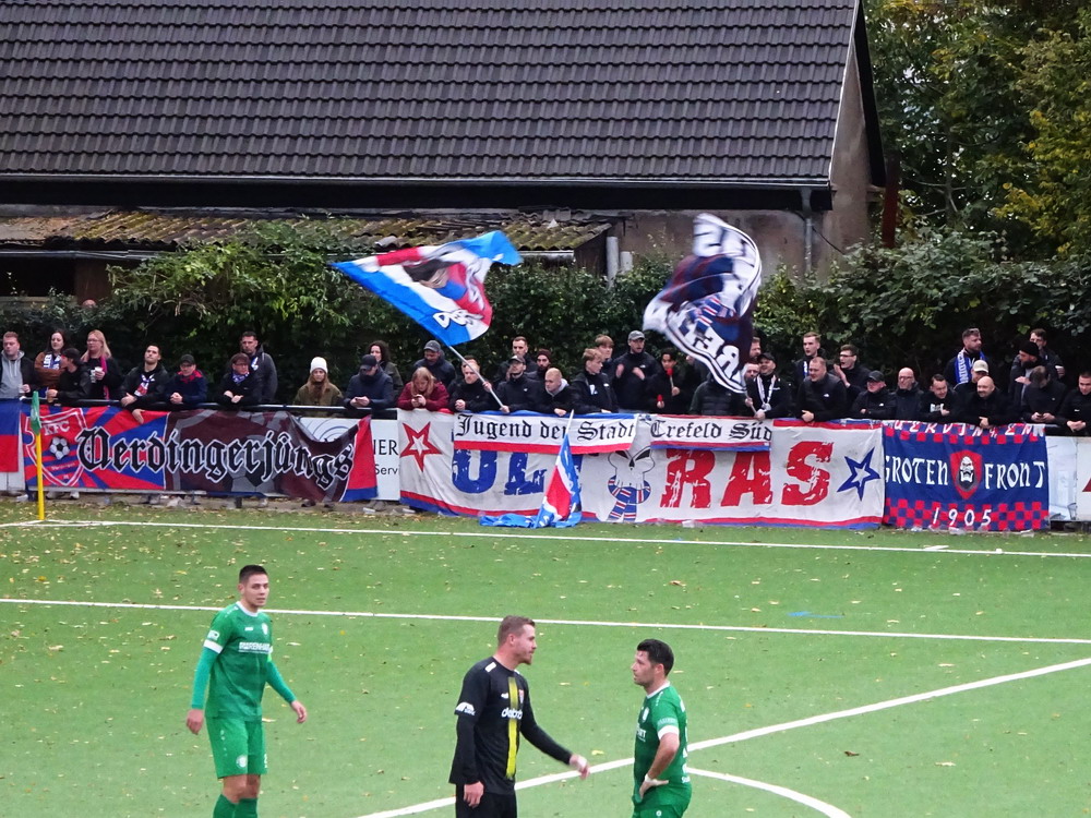 Der DFB-Pokalsieger von 1985 stellte sich am schönsten Wasserturm der Welt vor, daher war der heutige Spielbesuch alternativlos. Fast 900 Seelen pilgerten zur engen Sportanlage, die damit pickepackevoll war. Aus Krefeld hatte ich allerdings mehr Anhänger erwartet, denn nur etwa 150 Leute waren aus der Seidenstadt angereist, darunter ein versprengter Haufen von knapp zwei Dutzend Ultras. Von den Voraussetzungen und Ansprüchen ausgehend, trennen beide Clubs Welten, sportlich war es aber aktuell gerade mal ein Pünktchen Differenz. Allerdings hatten sich in den bisherigen Spielen der Greifvögel gegen favorisierte Teams der Oberliga durchaus unüberbrückbare Unterschiede gezeigt. Der KFC hatte sich zuletzt ein wenig stabilisiert, dennoch rechnete man sich am Turm eine Außenseiterchance aus. Diese wurde allerdings nach wenigen Spielminuten durch den Referee auf ein Minimum zusammengestutzt. Torjäger Reiners, der bei Ecken für den Gegner immer in der Defensive aushilft, bekam den Ball kurz vor der Torlinie unglücklich an die Hand. Die Elfmeterentscheidung war dann noch schmerzhaft, aber nachvollziehbar. Der Platzverweis wegen vermeintlicher Absicht zur Verhinderung eines Tores geriet allerdings zur Farce. Mag sein, dass es – Absicht vorausgesetzt, nach der es nicht aussah – eine regelgerechte Entscheidung war. Dass der Unparteiische aber seinen Ermessensspielraum nicht nutzte und Fingerspitzengefühl vermissen ließ, zog dieser Partie nun früh den Zahn und raubte jede mögliche Spannung.