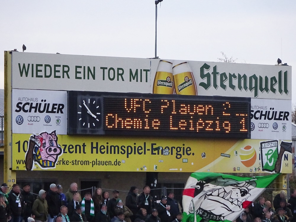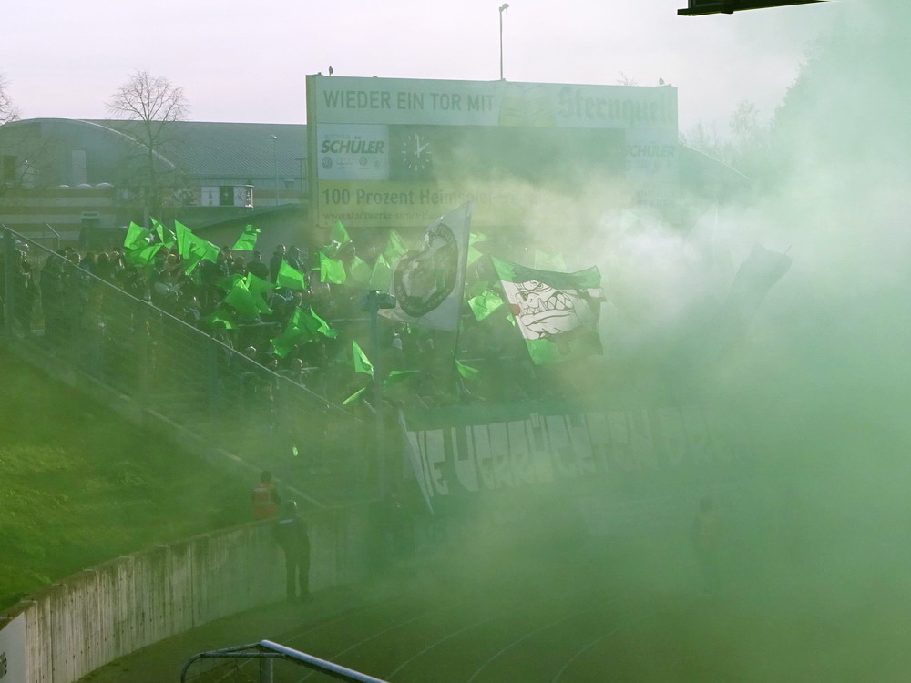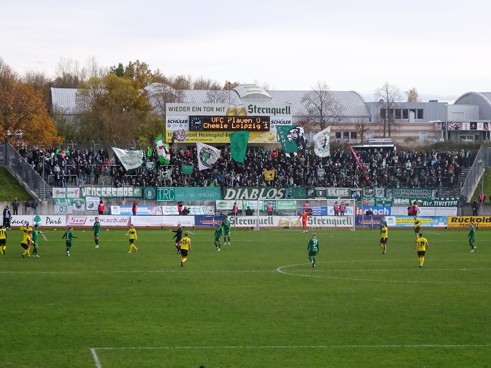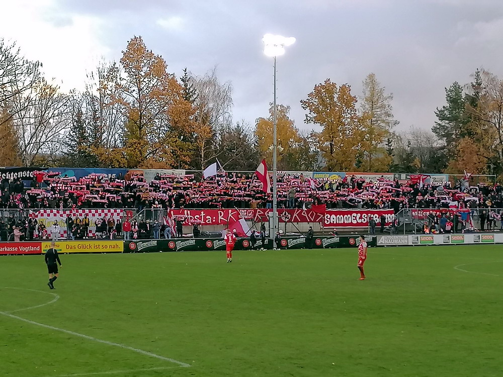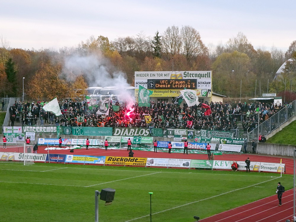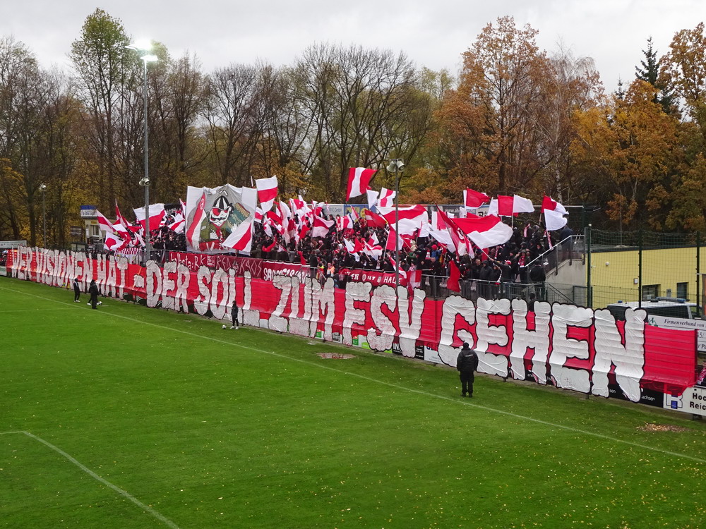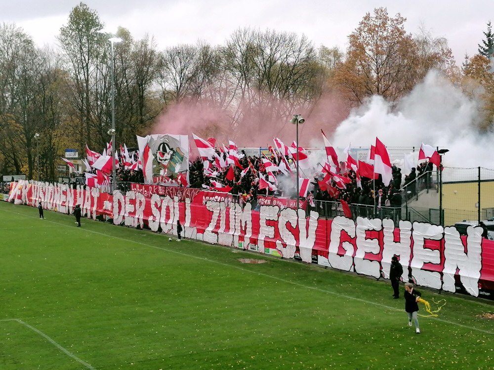 Etwa 800 Anhänger waren aus dem nahen Zwickau angereist. Trotz widriger Umstände präsentierte die Szene um ‚Red Kaos‘ eine Choreo. Ein überdimensionaler Doppelhalter zeigte das Maskottchen der Gruppe, welches den Landespokal im Arm hielt. Am Zaun prangte ein fettes Spruchband, welches lautete „Wer Visionen hat, der soll zum FSV gehen“ und zielte wohl auf einen möglichen Pokalgewinn ab, eventuell auch auf die mutige Vorstellung, den ins Schlingern geratenen Verein ohne Hilfe eines Investors aus eigener Kraft heraus zu retten. Abgerundet wurde die Aktion mit etwas vom Winde verwehten Rauch in den Club-Farben. Auch die kleine Szene der Gastgeber hatten etwas vorbereitet und so freute sich der Löwe aus dem VfB-Vereinswappen auf einen Sonntagsbraten, mit dem vermutlich die Schwäne gemeint waren. Aus dem kleinen Heim-Block wurde auch ab und an supportet, was natürlich hinter den Gesängen aus dem Gäste-Block verblasste. Allerdings geriet das Liedgut aus der Zwigge-Kurve zum Teil langatmig und einschläfernd. Zu lang wurden manche Lieder getragen, zu speziell waren die Melodien. Das war schon sehr ‚ultra‘ und nullkommanull aufs Spielgeschehen bezogen. Der Kick war in der ersten Hälfte auch ziemlich unterirdisch. Der FSV hatte zwei Tor-Chancen, die ungenutzt blieben, ansonsten war König Fehlpass sehr präsent. Das änderte sich in Hälfte zwei, als die Gäste zielstrebiger auftraten. An das späte Führungstor für die Gäste zehn Minuten vor dem Ende habe ich aber trotzdem nicht mehr geglaubt. Treffer Nummer zwei in der Nachspielzeit war dann nur noch abschließende Kosmetik.