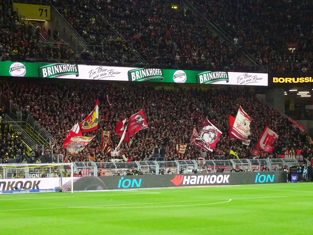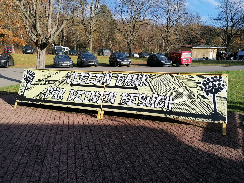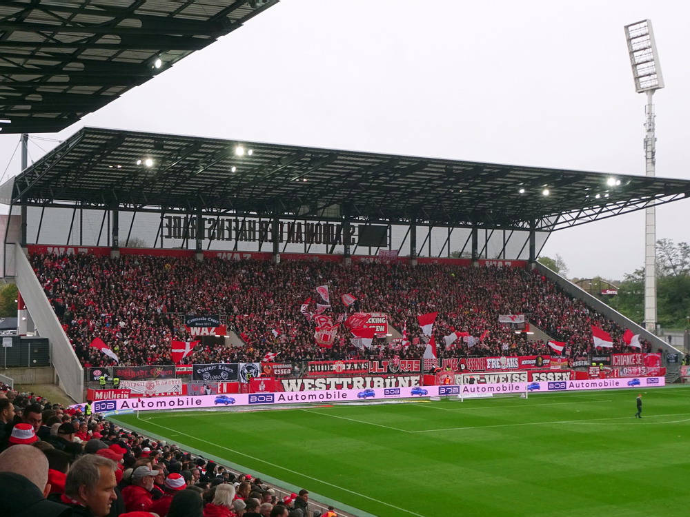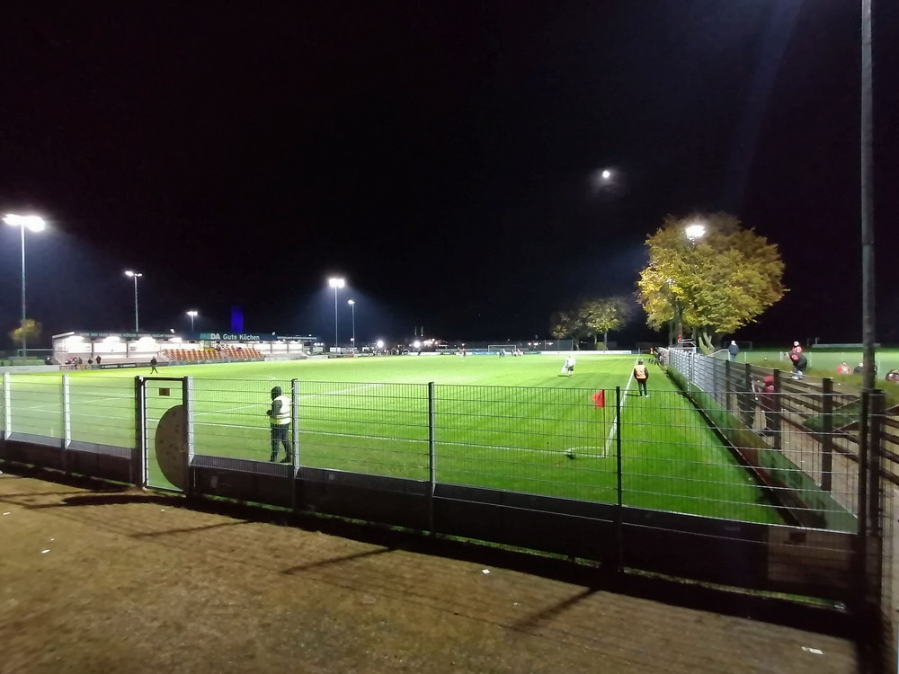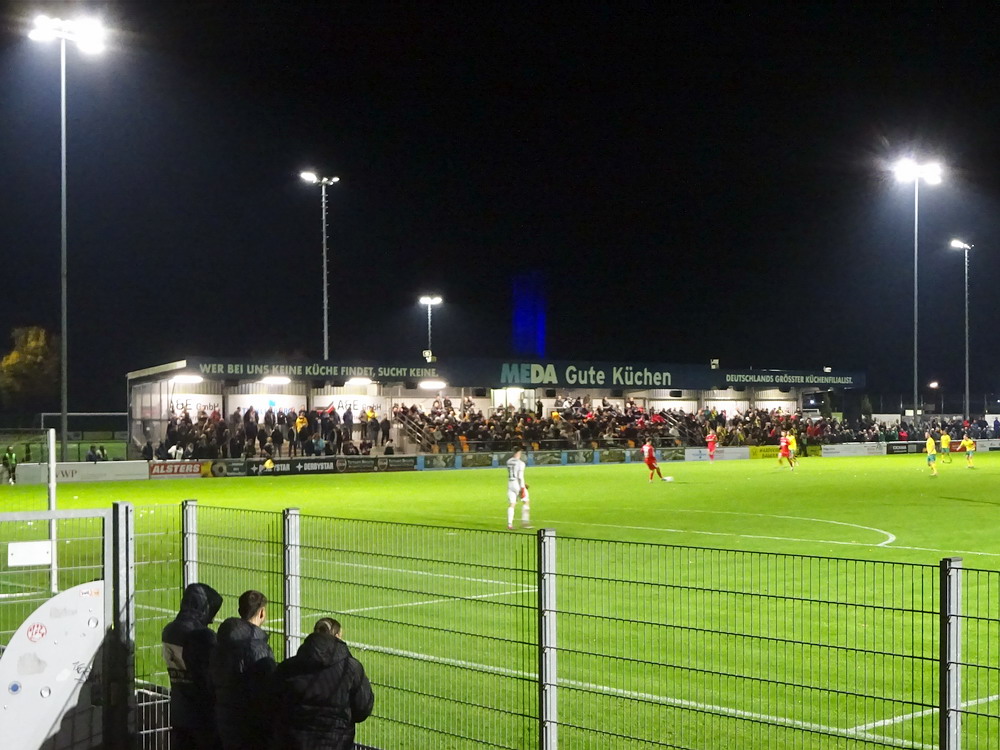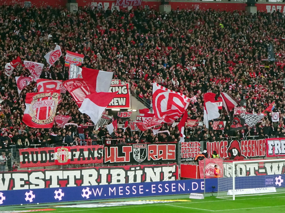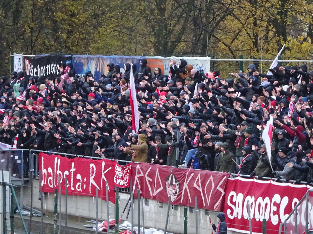 Etwa 800 Anhänger waren aus dem nahen Zwickau angereist. Trotz widriger Umstände präsentierte die Szene um ‚Red Kaos‘ eine Choreo. Ein überdimensionaler Doppelhalter zeigte das Maskottchen der Gruppe, welches den Landespokal im Arm hielt. Am Zaun prangte ein fettes Spruchband, welches lautete „Wer Visionen hat, der soll zum FSV gehen“ und zielte wohl auf einen möglichen Pokalgewinn ab, eventuell auch auf die mutige Vorstellung, den ins Schlingern geratenen Verein ohne Hilfe eines Investors aus eigener Kraft heraus zu retten. Abgerundet wurde die Aktion mit etwas vom Winde verwehten Rauch in den Club-Farben. Auch die kleine Szene der Gastgeber hatten etwas vorbereitet und so freute sich der Löwe aus dem VfB-Vereinswappen auf einen Sonntagsbraten, mit dem vermutlich die Schwäne gemeint waren. Aus dem kleinen Heim-Block wurde auch ab und an supportet, was natürlich hinter den Gesängen aus dem Gäste-Block verblasste. Allerdings geriet das Liedgut aus der Zwigge-Kurve zum Teil langatmig und einschläfernd. Zu lang wurden manche Lieder getragen, zu speziell waren die Melodien. Das war schon sehr ‚ultra‘ und nullkommanull aufs Spielgeschehen bezogen. Der Kick war in der ersten Hälfte auch ziemlich unterirdisch. Der FSV hatte zwei Tor-Chancen, die ungenutzt blieben, ansonsten war König Fehlpass sehr präsent. Das änderte sich in Hälfte zwei, als die Gäste zielstrebiger auftraten. An das späte Führungstor für die Gäste zehn Minuten vor dem Ende habe ich aber trotzdem nicht mehr geglaubt. Treffer Nummer zwei in der Nachspielzeit war dann nur noch abschließende Kosmetik.