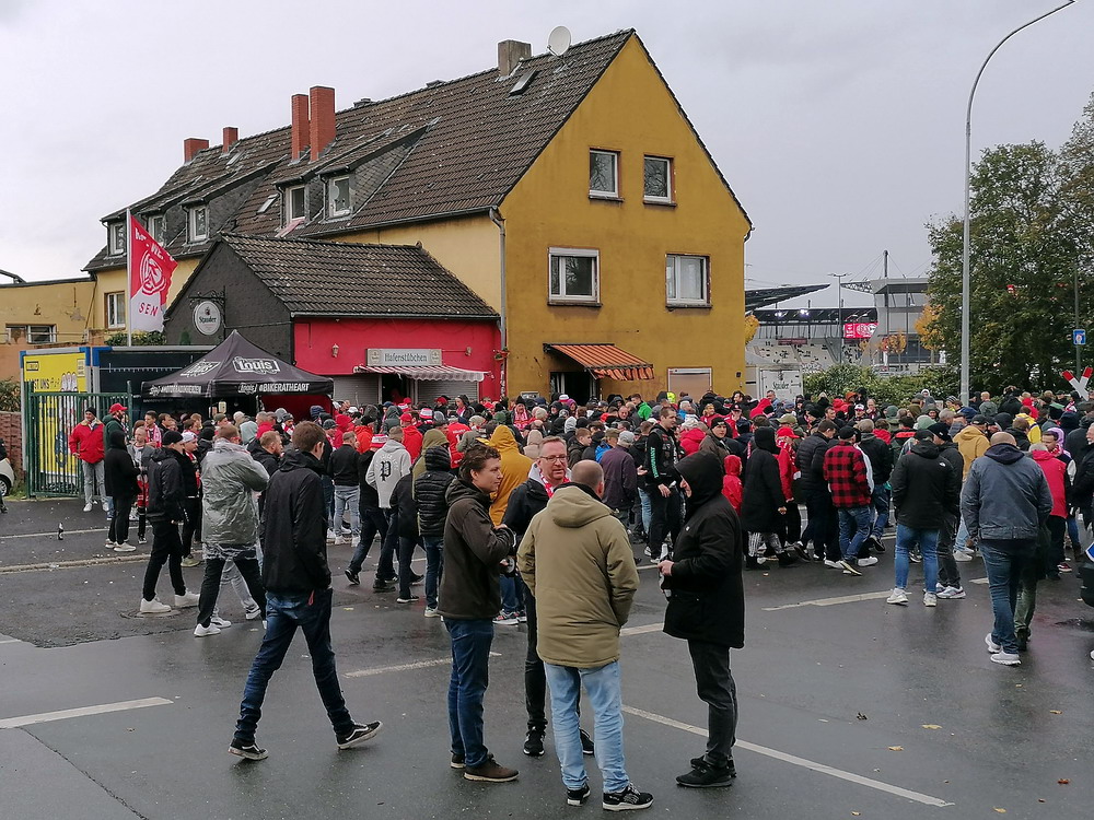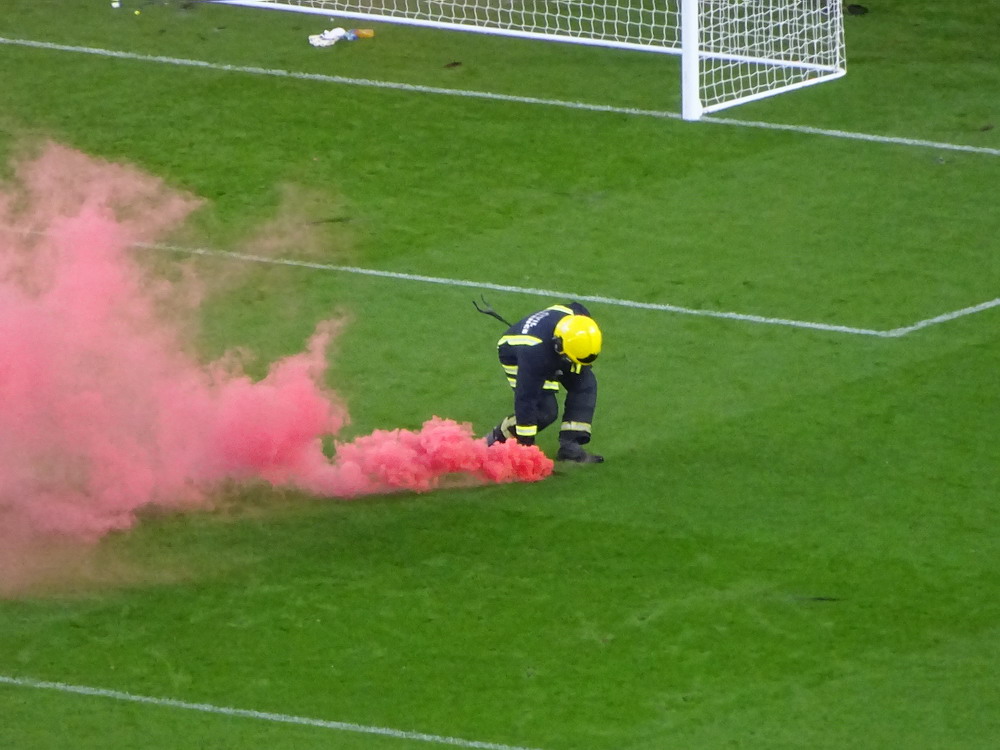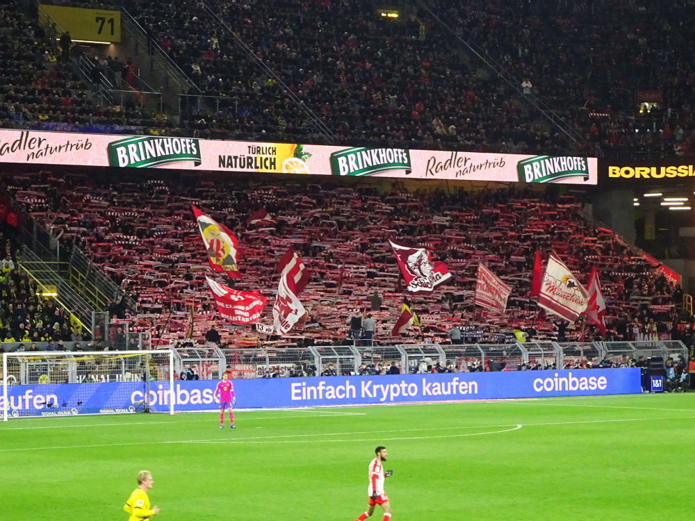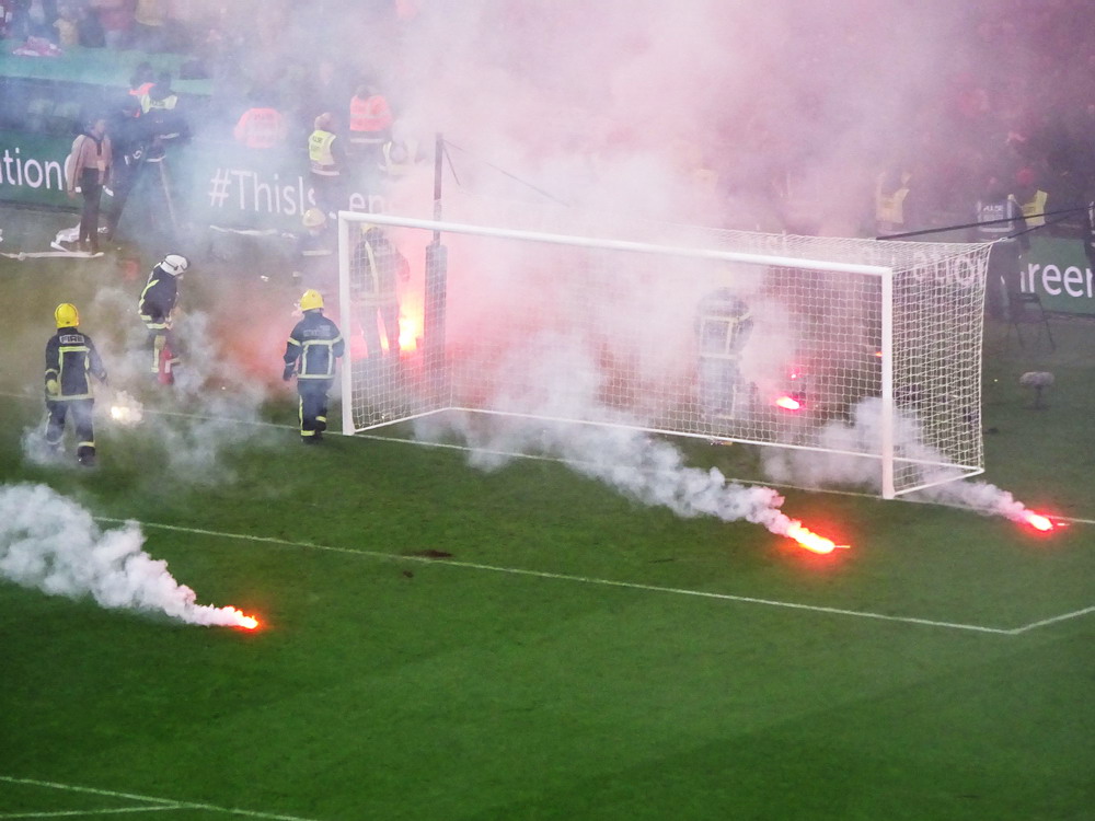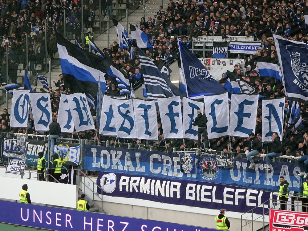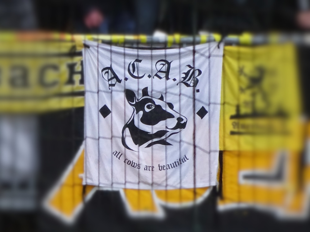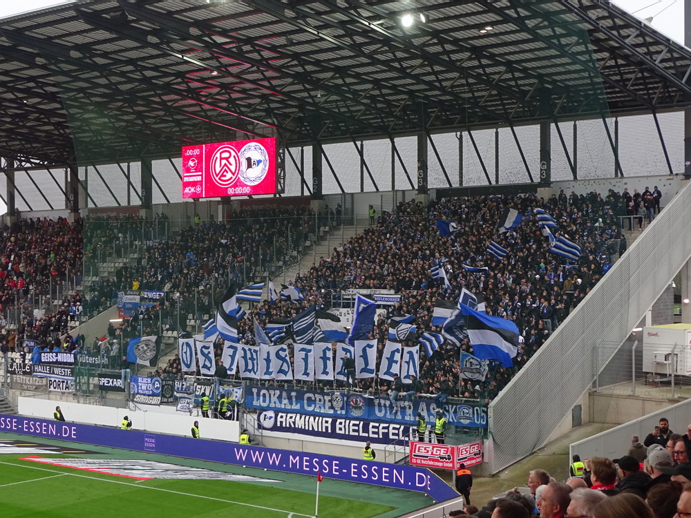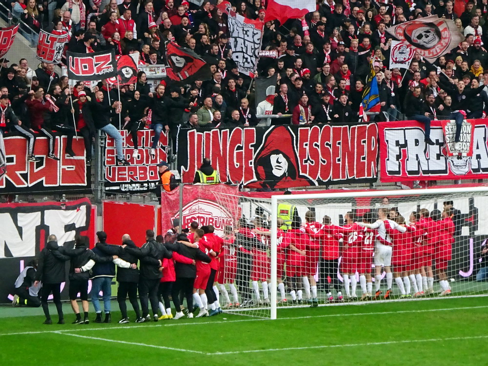 Etwa 800 Anhänger waren aus dem nahen Zwickau angereist. Trotz widriger Umstände präsentierte die Szene um ‚Red Kaos‘ eine Choreo. Ein überdimensionaler Doppelhalter zeigte das Maskottchen der Gruppe, welches den Landespokal im Arm hielt. Am Zaun prangte ein fettes Spruchband, welches lautete „Wer Visionen hat, der soll zum FSV gehen“ und zielte wohl auf einen möglichen Pokalgewinn ab, eventuell auch auf die mutige Vorstellung, den ins Schlingern geratenen Verein ohne Hilfe eines Investors aus eigener Kraft heraus zu retten. Abgerundet wurde die Aktion mit etwas vom Winde verwehten Rauch in den Club-Farben. Auch die kleine Szene der Gastgeber hatten etwas vorbereitet und so freute sich der Löwe aus dem VfB-Vereinswappen auf einen Sonntagsbraten, mit dem vermutlich die Schwäne gemeint waren. Aus dem kleinen Heim-Block wurde auch ab und an supportet, was natürlich hinter den Gesängen aus dem Gäste-Block verblasste. Allerdings geriet das Liedgut aus der Zwigge-Kurve zum Teil langatmig und einschläfernd. Zu lang wurden manche Lieder getragen, zu speziell waren die Melodien. Das war schon sehr ‚ultra‘ und nullkommanull aufs Spielgeschehen bezogen. Der Kick war in der ersten Hälfte auch ziemlich unterirdisch. Der FSV hatte zwei Tor-Chancen, die ungenutzt blieben, ansonsten war König Fehlpass sehr präsent. Das änderte sich in Hälfte zwei, als die Gäste zielstrebiger auftraten. An das späte Führungstor für die Gäste zehn Minuten vor dem Ende habe ich aber trotzdem nicht mehr geglaubt. Treffer Nummer zwei in der Nachspielzeit war dann nur noch abschließende Kosmetik.