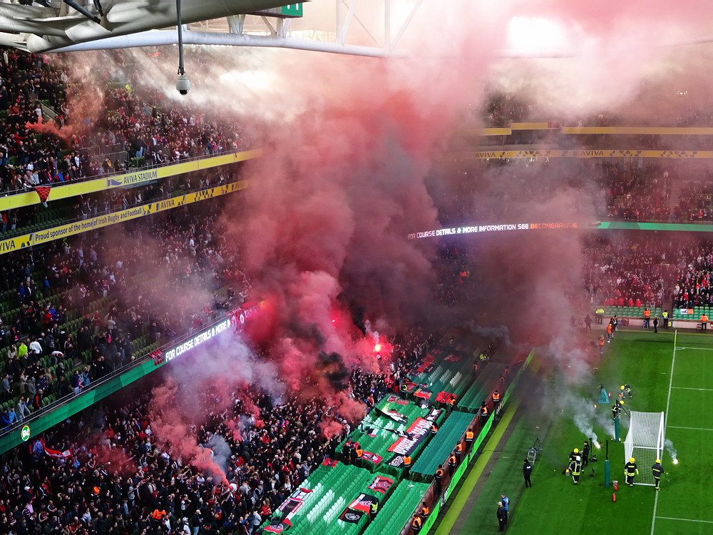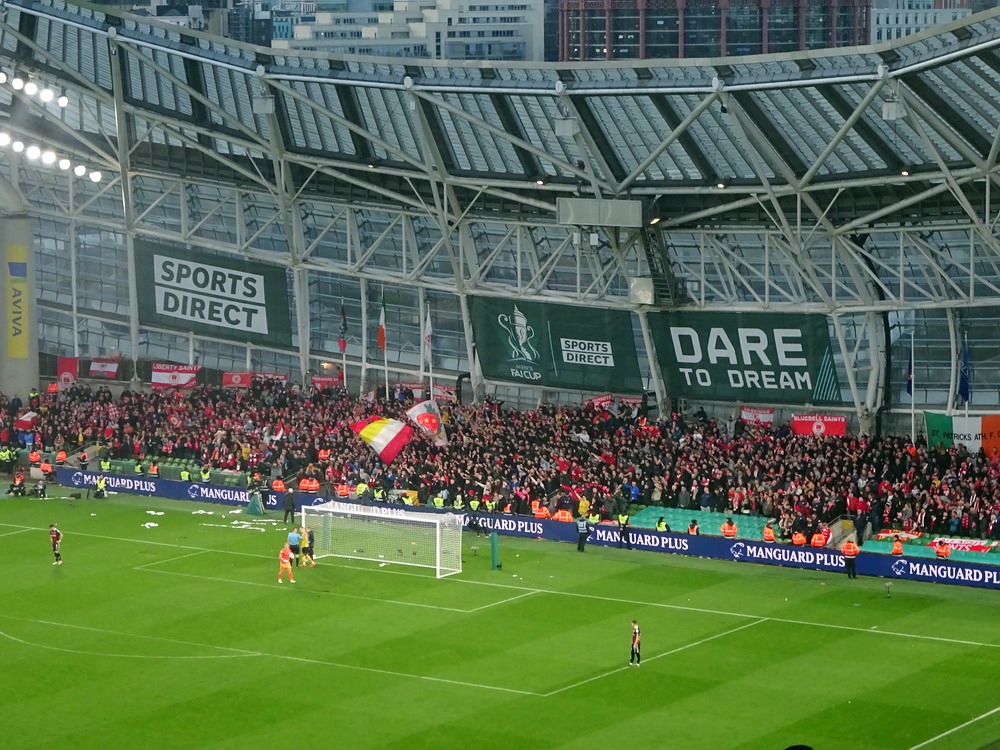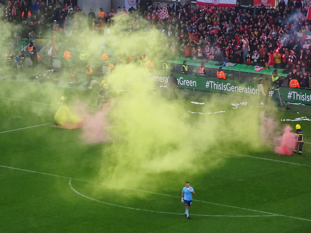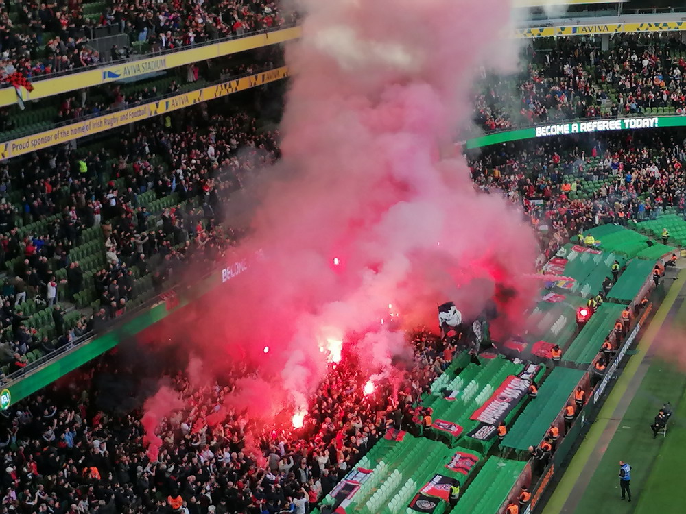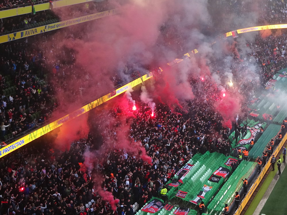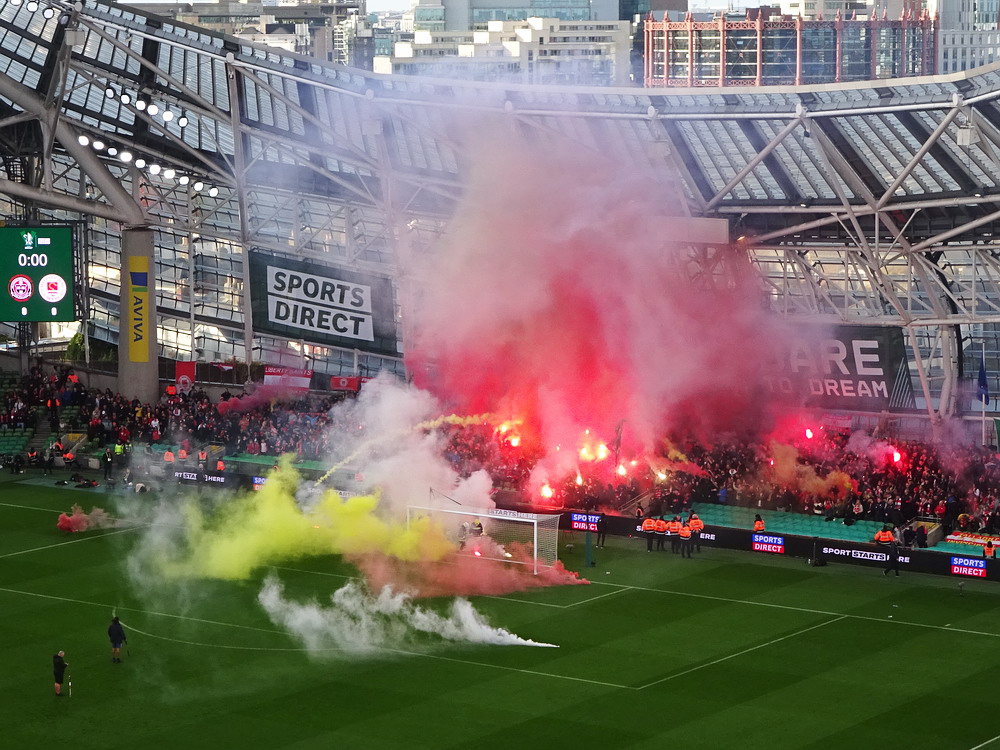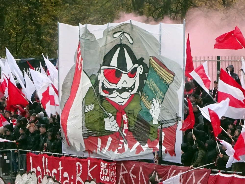 Etwa 800 Anhänger waren aus dem nahen Zwickau angereist. Trotz widriger Umstände präsentierte die Szene um ‚Red Kaos‘ eine Choreo. Ein überdimensionaler Doppelhalter zeigte das Maskottchen der Gruppe, welches den Landespokal im Arm hielt. Am Zaun prangte ein fettes Spruchband, welches lautete „Wer Visionen hat, der soll zum FSV gehen“ und zielte wohl auf einen möglichen Pokalgewinn ab, eventuell auch auf die mutige Vorstellung, den ins Schlingern geratenen Verein ohne Hilfe eines Investors aus eigener Kraft heraus zu retten. Abgerundet wurde die Aktion mit etwas vom Winde verwehten Rauch in den Club-Farben. Auch die kleine Szene der Gastgeber hatten etwas vorbereitet und so freute sich der Löwe aus dem VfB-Vereinswappen auf einen Sonntagsbraten, mit dem vermutlich die Schwäne gemeint waren. Aus dem kleinen Heim-Block wurde auch ab und an supportet, was natürlich hinter den Gesängen aus dem Gäste-Block verblasste. Allerdings geriet das Liedgut aus der Zwigge-Kurve zum Teil langatmig und einschläfernd. Zu lang wurden manche Lieder getragen, zu speziell waren die Melodien. Das war schon sehr ‚ultra‘ und nullkommanull aufs Spielgeschehen bezogen. Der Kick war in der ersten Hälfte auch ziemlich unterirdisch. Der FSV hatte zwei Tor-Chancen, die ungenutzt blieben, ansonsten war König Fehlpass sehr präsent. Das änderte sich in Hälfte zwei, als die Gäste zielstrebiger auftraten. An das späte Führungstor für die Gäste zehn Minuten vor dem Ende habe ich aber trotzdem nicht mehr geglaubt. Treffer Nummer zwei in der Nachspielzeit war dann nur noch abschließende Kosmetik.