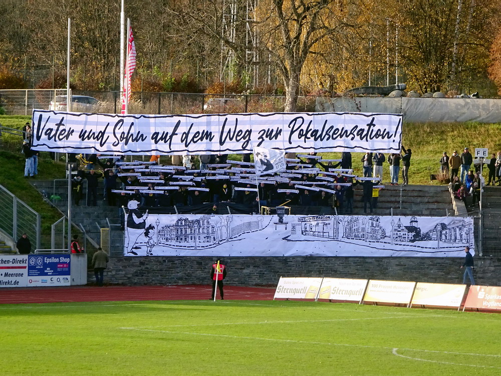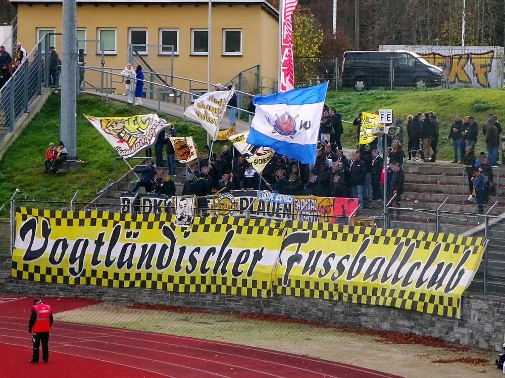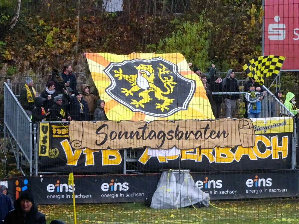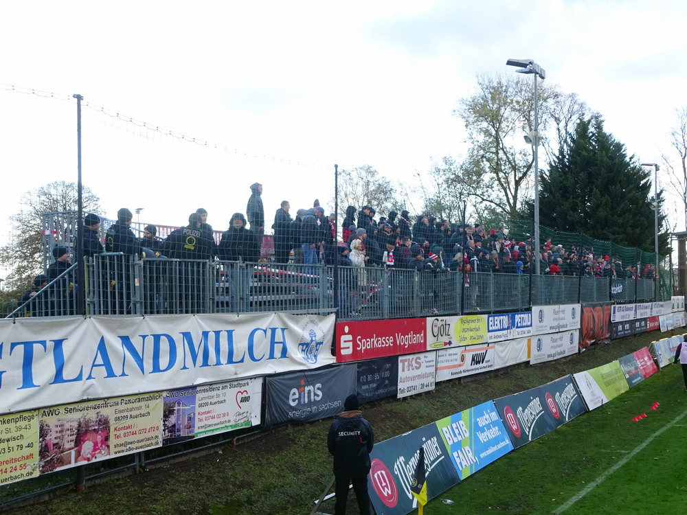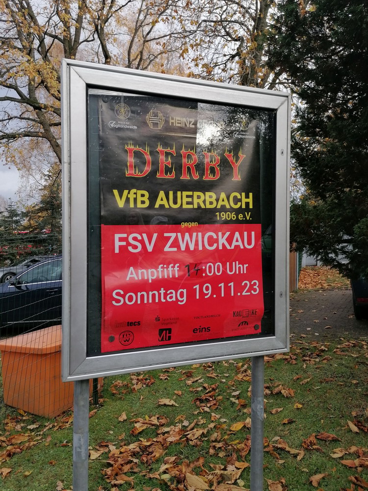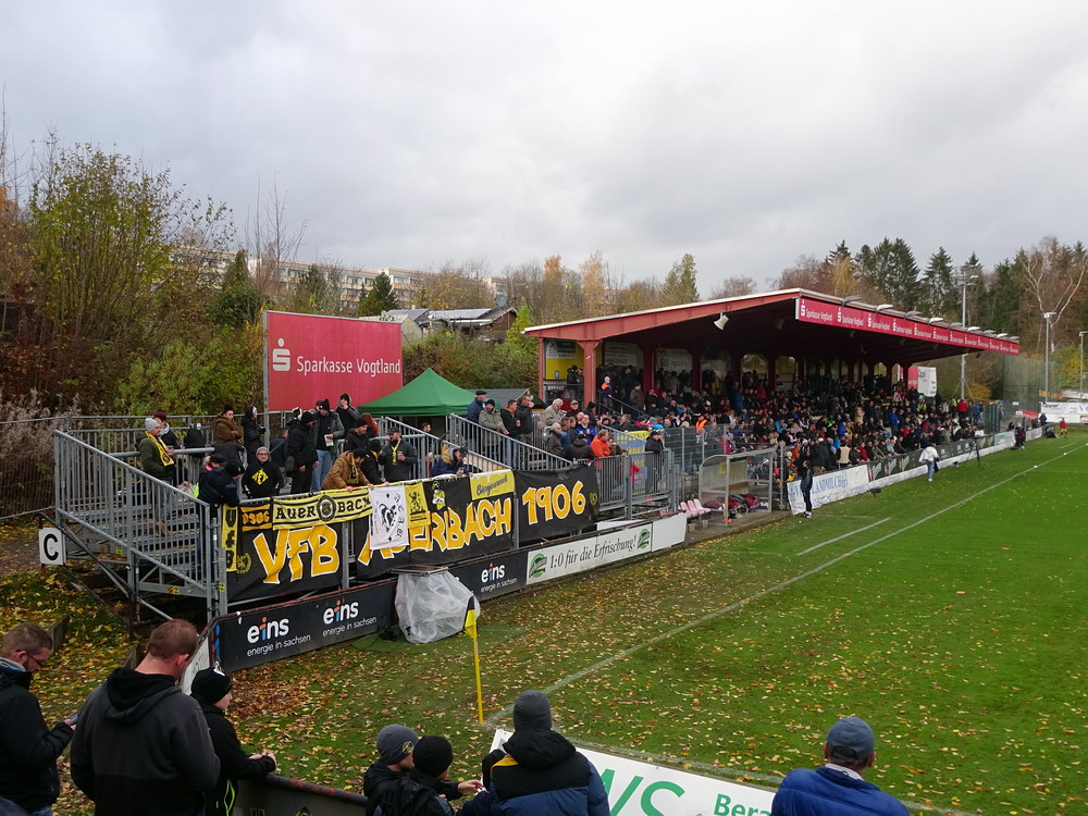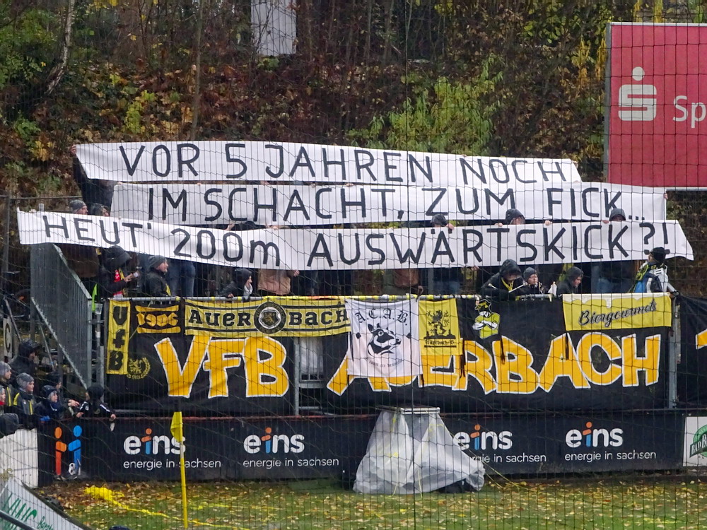 Die zweite Kraft im Vogtland hinter dem VFC Plauen ist der VfB Auerbach. Allerdings betrifft dieser Aussage eher die öffentliche Wahrnehmung, denn in den vergangenen Jahren war der VfB dem VFC durch die Teilnahme an der Regionalliga einen Schritt voraus, als die Plauener längst abgestiegen waren. Im vergangenen Jahr musste aber auch der VfB den bitteren Gang in die Oberliga antreten. Zum Pokalspiel reiste heute der FSV Zwickau an, ein Club der seit Monaten von Krisen geschüttelt wird. Gefühlter Beginn, vielleicht sogar tatsächlicher Auslöser der Misere, war die unsägliche Bierdusche des Referees beim Ligaspiel gegen den glorreichen Deutschen Meister von 1955, der Punktabzug und Geldstrafe zur Folge hatte. Danach gingen die eh schon stark abstiegsbedrohten Schwäne in den Sturzflug über, der schließlich im Abstieg in die Regionalliga sein Ende fand. Das wiederum hatte einen finanziellen Engpass zur Folge, der dank einer Crowdfunding-Aktion der Fanszene erst einmal überstanden wurde. Allerdings sitzt der Gürtel weiterhin verdammt eng und der FSV spielt eine desaströse Saison. Als aktueller Vorletzter droht der nächste Abstieg und sollte dieser Fall eintreten, dürfte es wohl verdammt dunkel über der Automobil-Stadt werden. Die Anhängerschaft ließ sich aber weder von der bedrohlichen Lage noch vom miesen Wetter beeindrucken und reiste zahlreich ins Vogtland.