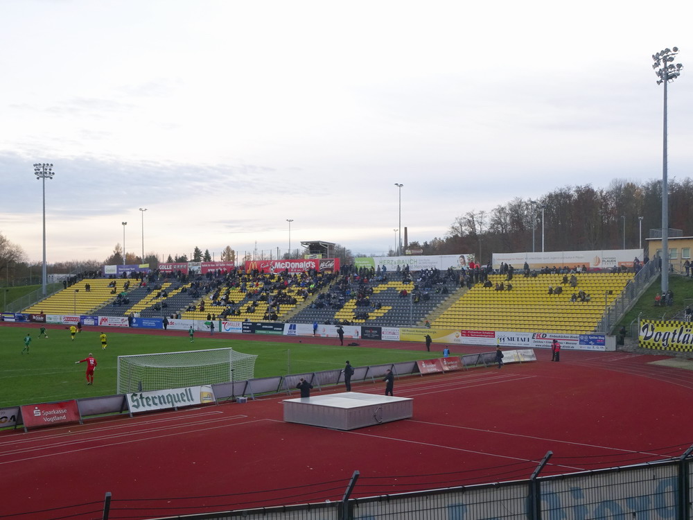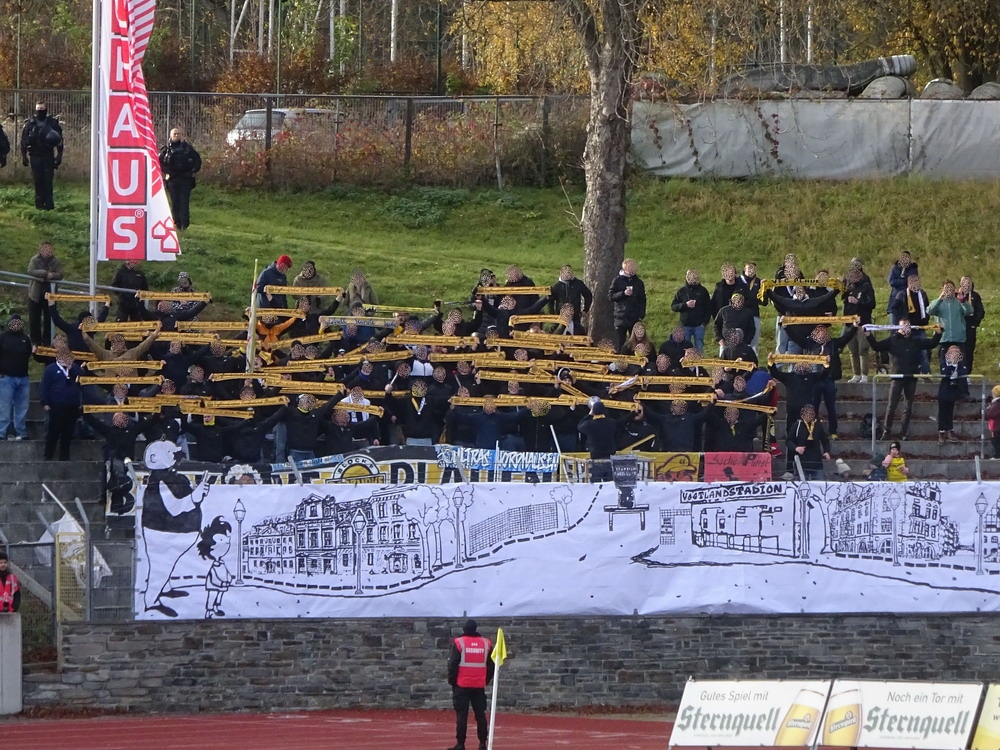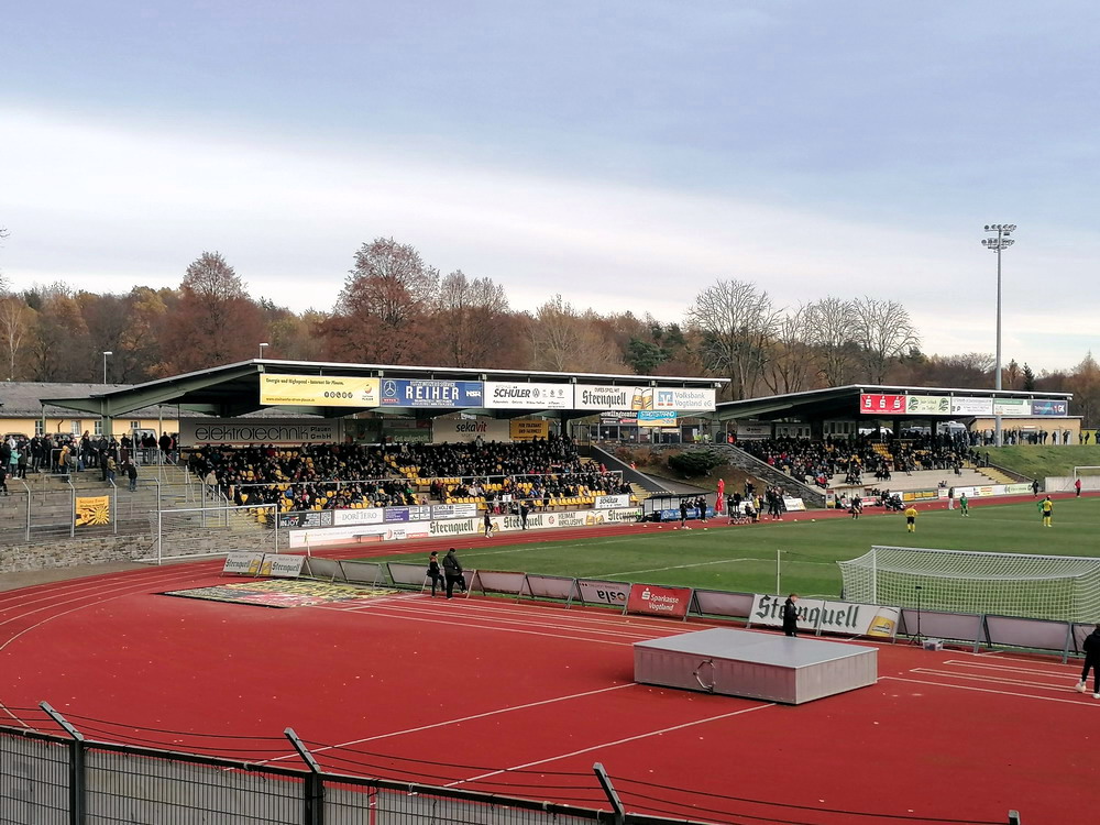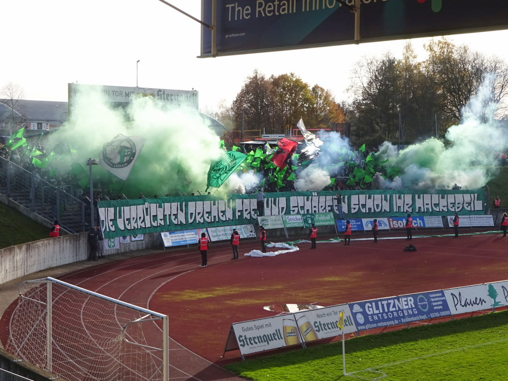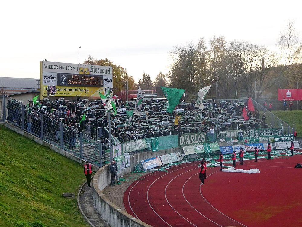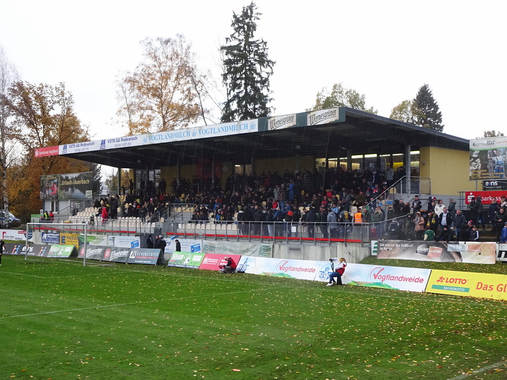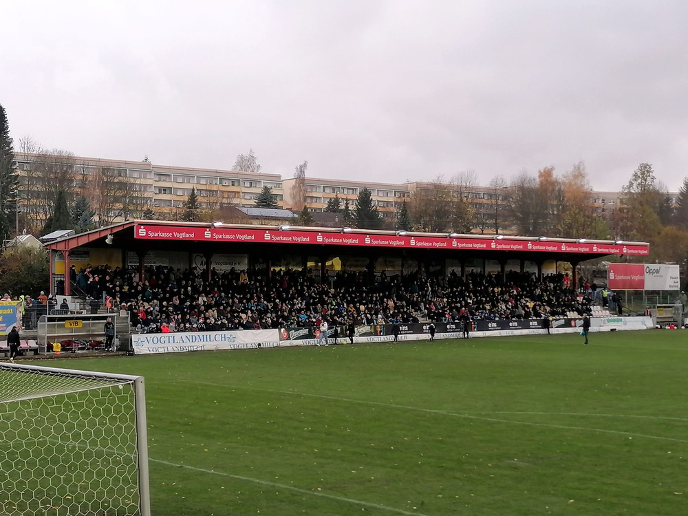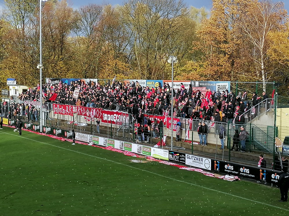 Die zweite Kraft im Vogtland hinter dem VFC Plauen ist der VfB Auerbach. Allerdings betrifft dieser Aussage eher die öffentliche Wahrnehmung, denn in den vergangenen Jahren war der VfB dem VFC durch die Teilnahme an der Regionalliga einen Schritt voraus, als die Plauener längst abgestiegen waren. Im vergangenen Jahr musste aber auch der VfB den bitteren Gang in die Oberliga antreten. Zum Pokalspiel reiste heute der FSV Zwickau an, ein Club der seit Monaten von Krisen geschüttelt wird. Gefühlter Beginn, vielleicht sogar tatsächlicher Auslöser der Misere, war die unsägliche Bierdusche des Referees beim Ligaspiel gegen den glorreichen Deutschen Meister von 1955, der Punktabzug und Geldstrafe zur Folge hatte. Danach gingen die eh schon stark abstiegsbedrohten Schwäne in den Sturzflug über, der schließlich im Abstieg in die Regionalliga sein Ende fand. Das wiederum hatte einen finanziellen Engpass zur Folge, der dank einer Crowdfunding-Aktion der Fanszene erst einmal überstanden wurde. Allerdings sitzt der Gürtel weiterhin verdammt eng und der FSV spielt eine desaströse Saison. Als aktueller Vorletzter droht der nächste Abstieg und sollte dieser Fall eintreten, dürfte es wohl verdammt dunkel über der Automobil-Stadt werden. Die Anhängerschaft ließ sich aber weder von der bedrohlichen Lage noch vom miesen Wetter beeindrucken und reiste zahlreich ins Vogtland.