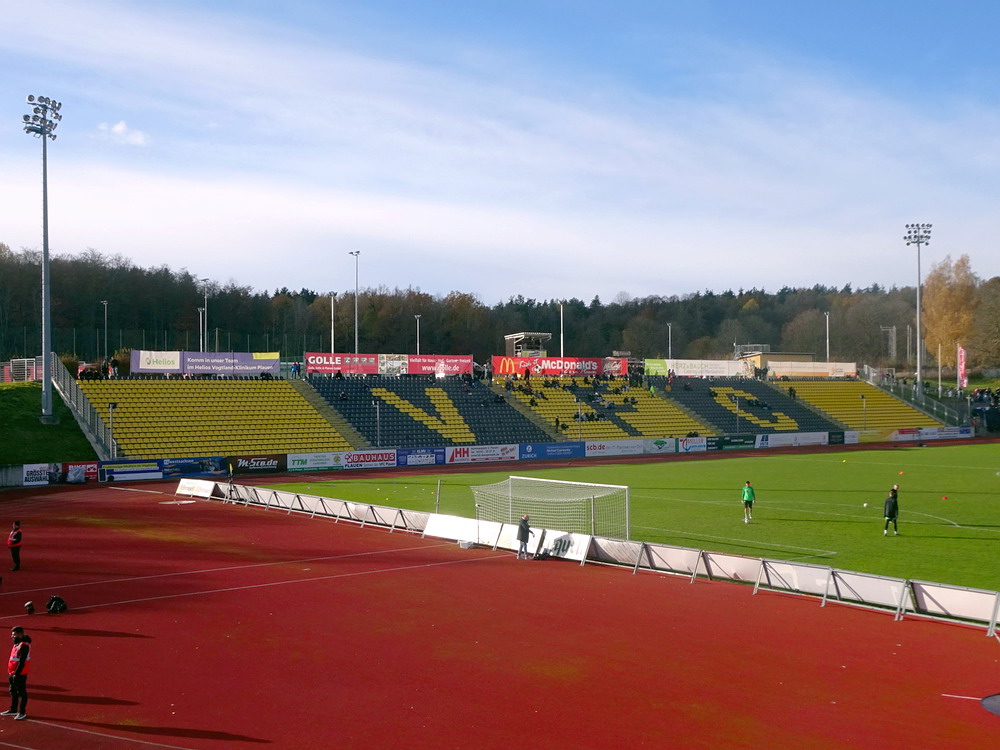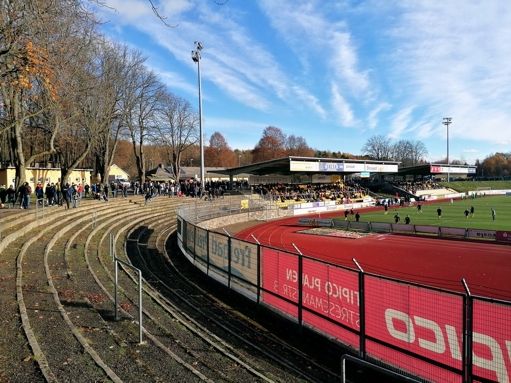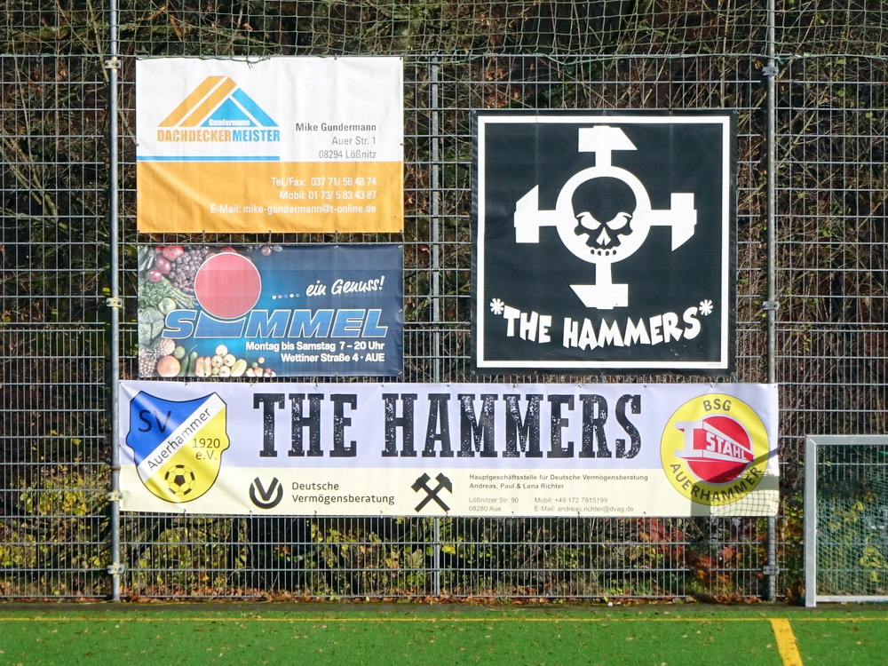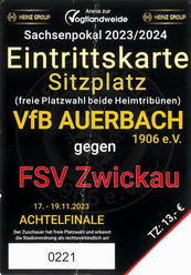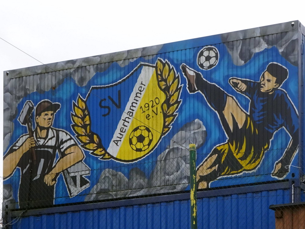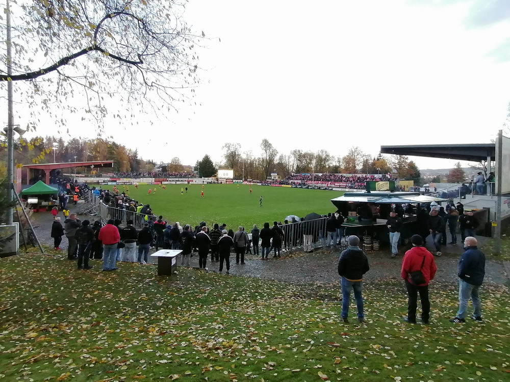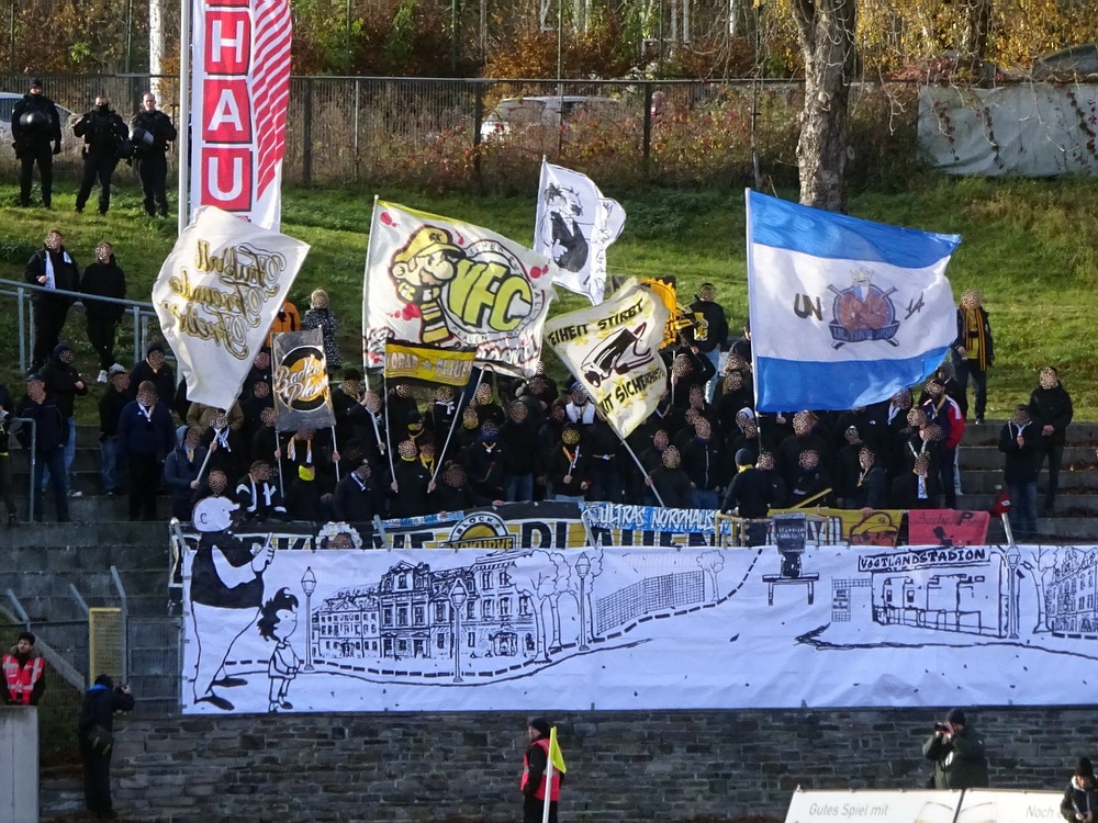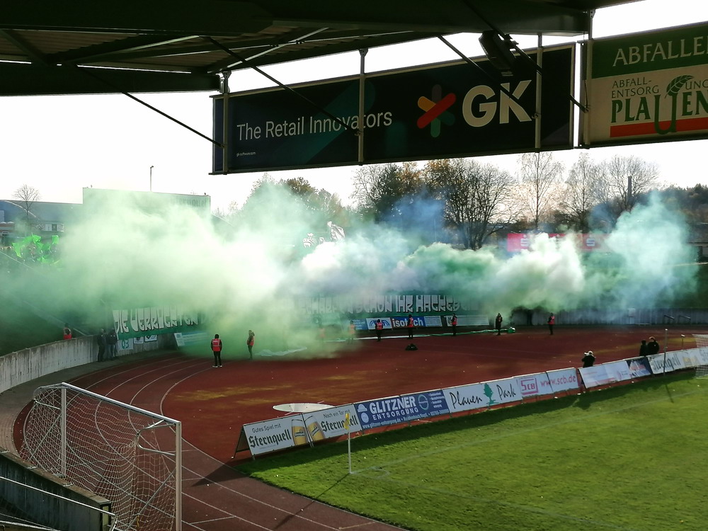 Die zweite Kraft im Vogtland hinter dem VFC Plauen ist der VfB Auerbach. Allerdings betrifft dieser Aussage eher die öffentliche Wahrnehmung, denn in den vergangenen Jahren war der VfB dem VFC durch die Teilnahme an der Regionalliga einen Schritt voraus, als die Plauener längst abgestiegen waren. Im vergangenen Jahr musste aber auch der VfB den bitteren Gang in die Oberliga antreten. Zum Pokalspiel reiste heute der FSV Zwickau an, ein Club der seit Monaten von Krisen geschüttelt wird. Gefühlter Beginn, vielleicht sogar tatsächlicher Auslöser der Misere, war die unsägliche Bierdusche des Referees beim Ligaspiel gegen den glorreichen Deutschen Meister von 1955, der Punktabzug und Geldstrafe zur Folge hatte. Danach gingen die eh schon stark abstiegsbedrohten Schwäne in den Sturzflug über, der schließlich im Abstieg in die Regionalliga sein Ende fand. Das wiederum hatte einen finanziellen Engpass zur Folge, der dank einer Crowdfunding-Aktion der Fanszene erst einmal überstanden wurde. Allerdings sitzt der Gürtel weiterhin verdammt eng und der FSV spielt eine desaströse Saison. Als aktueller Vorletzter droht der nächste Abstieg und sollte dieser Fall eintreten, dürfte es wohl verdammt dunkel über der Automobil-Stadt werden. Die Anhängerschaft ließ sich aber weder von der bedrohlichen Lage noch vom miesen Wetter beeindrucken und reiste zahlreich ins Vogtland.