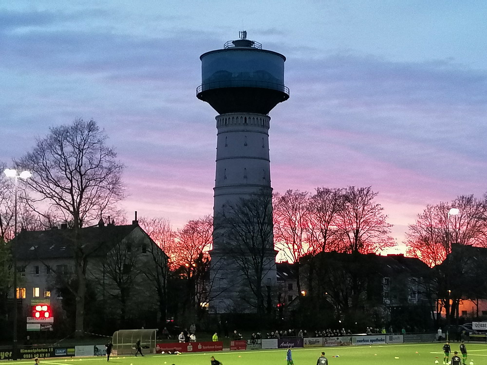 Zum Stadt-Derby zog es mich mal wieder zum Ort der eigenen aktiven Fußball-Karriere. Oberliga-Fußball unter dem schönsten Wasserturm der Welt, das liest sich immer noch wie ein kleines Märchen, wenn man bedenkt, dass vor zwei Jahren noch um Bezirksliga-Punkte gekämpft wurde. Adler gegen Schwalben – was in der Natur eine klare Sache für den Greifvogel bedeutet, zeigt sich auf dem Fußballplatz ganz anders. Während die Turm-Kicker erwartungsgemäß gegen den Abstieg ankämpfen, dabei aber eine deutlich bessere Figur machen, als vor der Saison befürchtet wurde, spielt die Spielvereinigung wie so oft in den letzten Jahren im oberen Tabellenviertel mit. Dem eventuell möglichen Aufstieg wurde aber vor wenigen Tagen eine Absage erteilt. Für den Stadtteil-Verein wären die teils unsinnigen Regionalliga-Auflagen nur unter äußersten Anstrengungen zu erfüllen. Die Schwalben verbiegen sich dafür nicht – das verdient meinen Respekt. Weniger Respekt, oder eher deutliches Unverständnis, bekommt der Club dagegen für die kürzlich auf Jugend-Ebene beschlossene Zusammenarbeit mit dem blau-weißen Un-Verein aus Arbeitslosenkirchen.