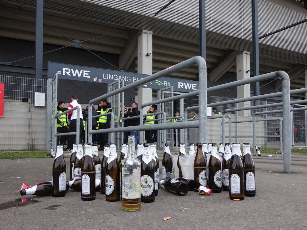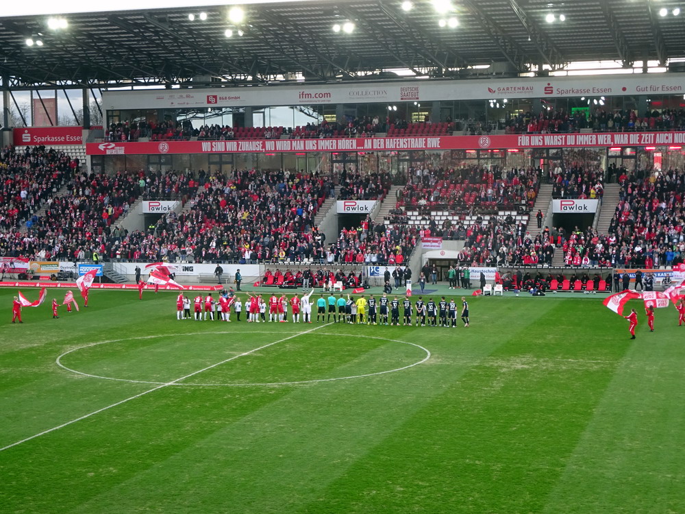 Etwas mehr als zwanzig Minuten waren gespielt, als eine lang gezogene Freistoß-Flanke in den rot-weissen Sechzehner segelte. Stürmer Ron Berlinksi war mit nach hinten geeilt und wollte den Ball mit durchgestrecktem Bein klären. Dumm nur, dass er mit diesem frontal in einen Gäste-Akteur reinrasselte, der sich auch zum Ball bewegt hatte. Der Zufall wollte es, dass ich Berlinski am folgenden Tag in der Essener Eishalle beim Playoff-Spiel der Moskitos traf. Auf die Aktion angesprochen, erklärte er, er habe den Gegenspieler nicht gesehen, was die Fernsehbilder zu bestätigen scheinen, denn Berlinski schaut nur auf den Ball. Es war schon ein harter Zusammenprall, der Platzverweis und Elfmeter zur Folge hatte. Eine schmerzhafte Doppelbestrafung, die final aber nachvollziehbar ist. So stark Torwart Jakob Golz auch performt – als Elfmeter-Killer hat er sich bisher nicht bewiesen, ich kann mich jedenfalls nicht erinnern, dass er im rot-weissen Trikot im laufenden Spiel überhaupt schon einen Elfer gehalten hat. Auch diesen nicht und so führten die Gäste mit 1:0. Wie es dann aber oft so ist, brachte der rote Karton das bis dato unaufgeregte Spiel, in dem es noch keinen nennenswerten Szenen gegeben hatte, komplett durcheinander und die Bayern konnten mit der Überzahl recht wenig anfangen. Stattdessen kam der RWE auf und konnte die Partie eine Viertelstunde später egalisieren. Hätte Müsel seine Riesen-Chance kurz darauf genutzt und nicht nur die Stabilität der Querlatte getestet, wäre es wohl noch einmal komplett anderes Spiel geworden. Der Fußballgott war an diesem Tage aber nicht auf Seiten der Roten, denn mit dem zweiten Torschuss gingen die Gäste mit dem Pausenpfiff recht schmeichelhaft erneut in Führung. Diese waren vermutlich schon die vorentscheidenden Minuten.