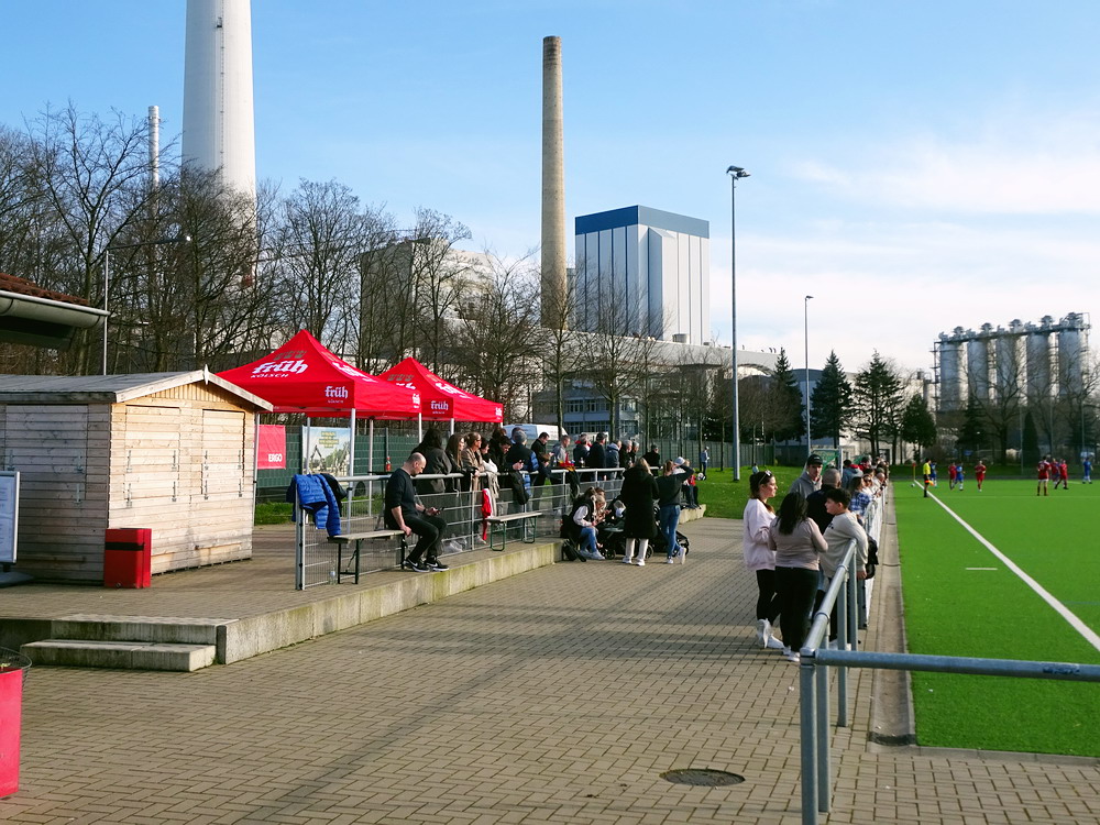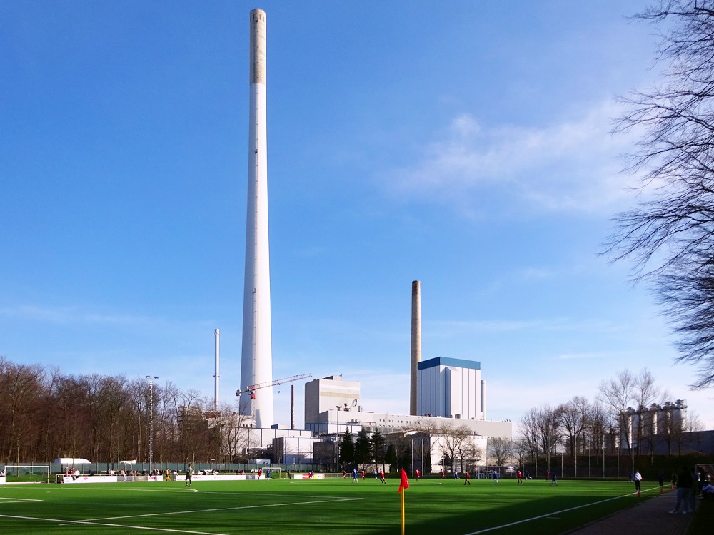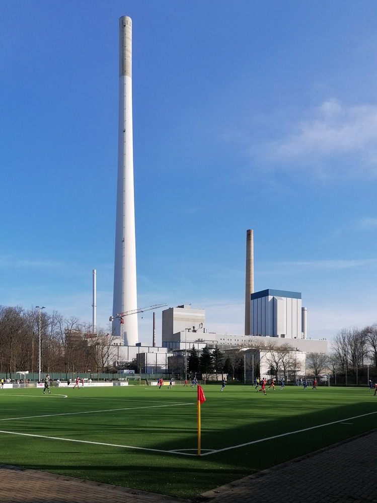 Im Kölner Norden wurde unmittelbar neben den Rheinauen und gegenüber des Bayer-Chemparks dieses Bezirksliga-Derby angestoßen. Auch hier hatte die Platzanlage selber wenig zu bieten. Die Kulisse machte es aus, denn neben dem Platz erhebt sich das Heizkraftwerk Merkenich mit seinem – allerdings mittlerweile stillgelegten – 250-Meter-Schlot, der nach dem ‚Colonius‘ das zweithöchste Bauwerk Kölns ist. Die beiden Kontrahenten schenkten sich nichts, es war ordentlich Feuer in der Partie und die favorisierten Gastgeber hatten mit den Autoherstellern ordentlich Mühe. Den Führungstreffer der Gäste konnten die ‚Dörfler‘ zwar mit viel Aufwand sehenswert ausgleichen, aber in den Schlussminuten gelang den Jüngern von Henry Ford noch der etwas glückliche Siegtreffer. Überhaupt nicht mit dem Spiel mithalten konnte das Catering. Kölsch ist ja ohnehin nur ein Abfallprodukt, aber an fester Nahrung hätte ich dann doch etwas mehr erwartet als nen wässrigen Bockwurstschlauch und eine Industrie-Frikko im Aufbackbrötchen.