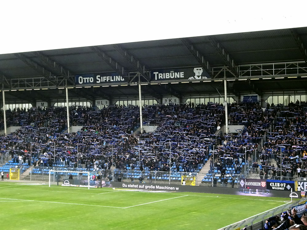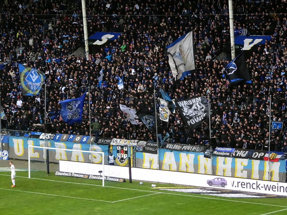 Auf ein Auswärtsspiel in Mannheim darf man sich durchaus freuen. Waldhof ist Oldschool, Waldhof ist dreckig, Waldhof ist asozial. Es erinnert durchaus an Essen, Mannheim ist der Ruhrpott Süddeutschlands und aus meiner Perspektive sind sich die Anhänger beider Clubs näher als sie zugeben würden. Früh morgens aus Bergamo an den erschreckend verwaisten Baden-Airport eingeschwebt, ging es mit dem Airport-Shuttlebus zum Bahnhof Rastatt und von dort mit dem deutschen Vorzeige-Schienenverkehrsdienstleister mit Umstieg in Karlsruhe nach Mannheim. Einmal den Magen beim türkischen Frühstücksbuffet vollgeschlagen und dann ab zu Kalle Benz seinem Stadion, wo ich auf die Gefährten traf. Und wenig später wieder verließ, denn ich hatte mich entschieden heute mal auf den Besuch des Away-Sektors zu verzichten, um mal eine andere Perspektive zu haben. Am Ende war es anstrengend und in zwei, drei Situation war ich kurz davor die Selbstkontrolle zu verlieren und ein schmerzhaftes Outing zu erfahren, denn es stellte sich schnell heraus, dass mein Umfeld für mein Experiment nur bedingt geeignet war. Dass mein Verein polarisiert und bei den meisten gegnerischen Fanszenen auf tiefe Abneigung stößt, ist ja kein Geheimnis, gerade bei den Baracklern sollte das aber mit Verweis auf oben skizzierte Verwandtschaft im Geiste eigentlich nicht so sein. Umgekehrt finde ich den Waldhof jedenfalls eher sympathisch. War aber eben aus Blickrichtung schwarz-blau mal so gar nicht der Fall. Was da an Sprüchen unter der Gürtellinie kam, war teils tiefer Straftatbestand, und die Verhaltensweisen des Pöbels, machten schnell klar, dass etwaige meine Gesinnung entlarvende Äußerungen oder gezeigte Emotionen problematisch werden könnten. „Ruhrpott-Juden“ war da noch am harmlosesten. Bei der mit entsprechendem Tonfall geäußerten Hoffnung, irgendwo in der Stadt mit 100 Waldhof-Leuten auf einen Rot-Weissen zu treffen, um diesen dann „ins Jenseits zu stiefeln“, erwischte ich mich bei dem Gedanken, dieser eine besser nicht sein zu wollen.