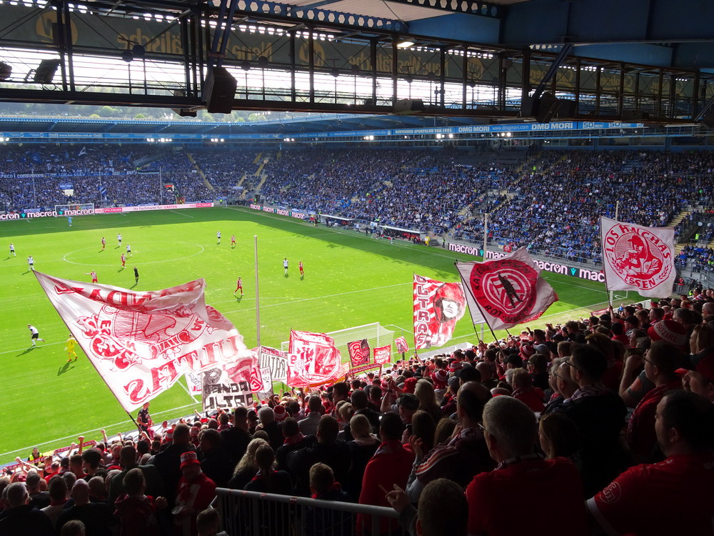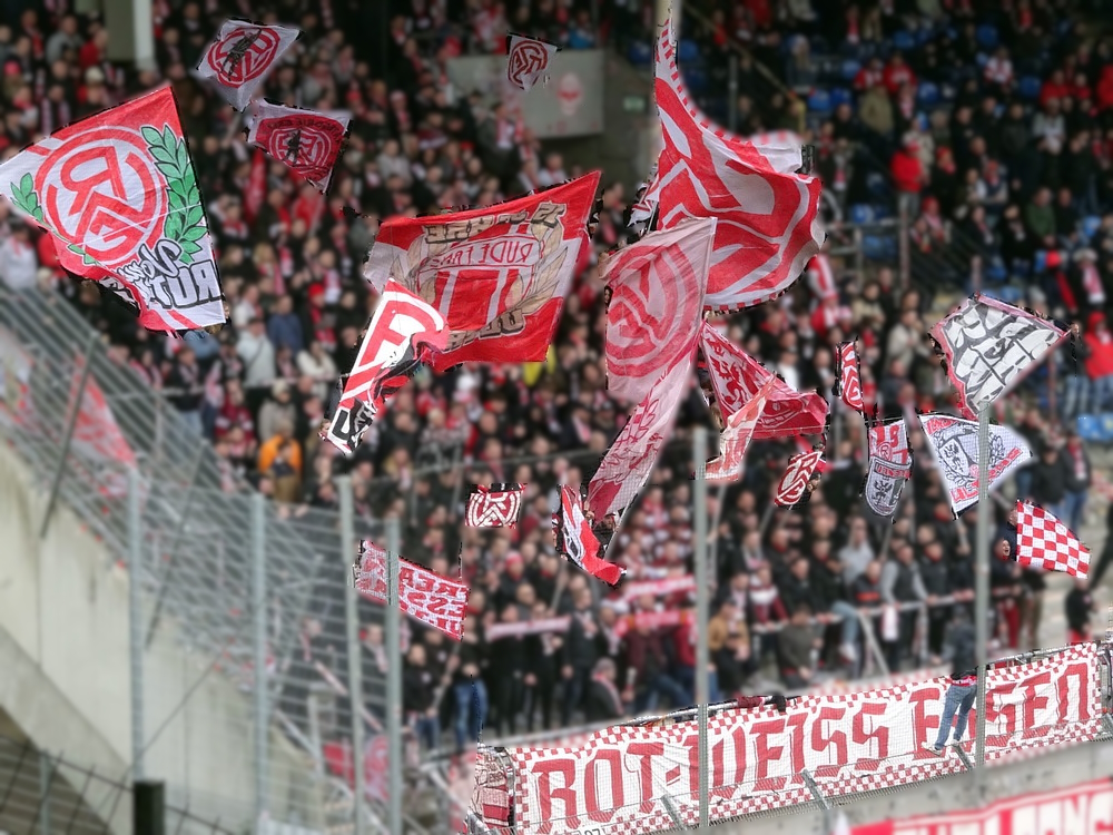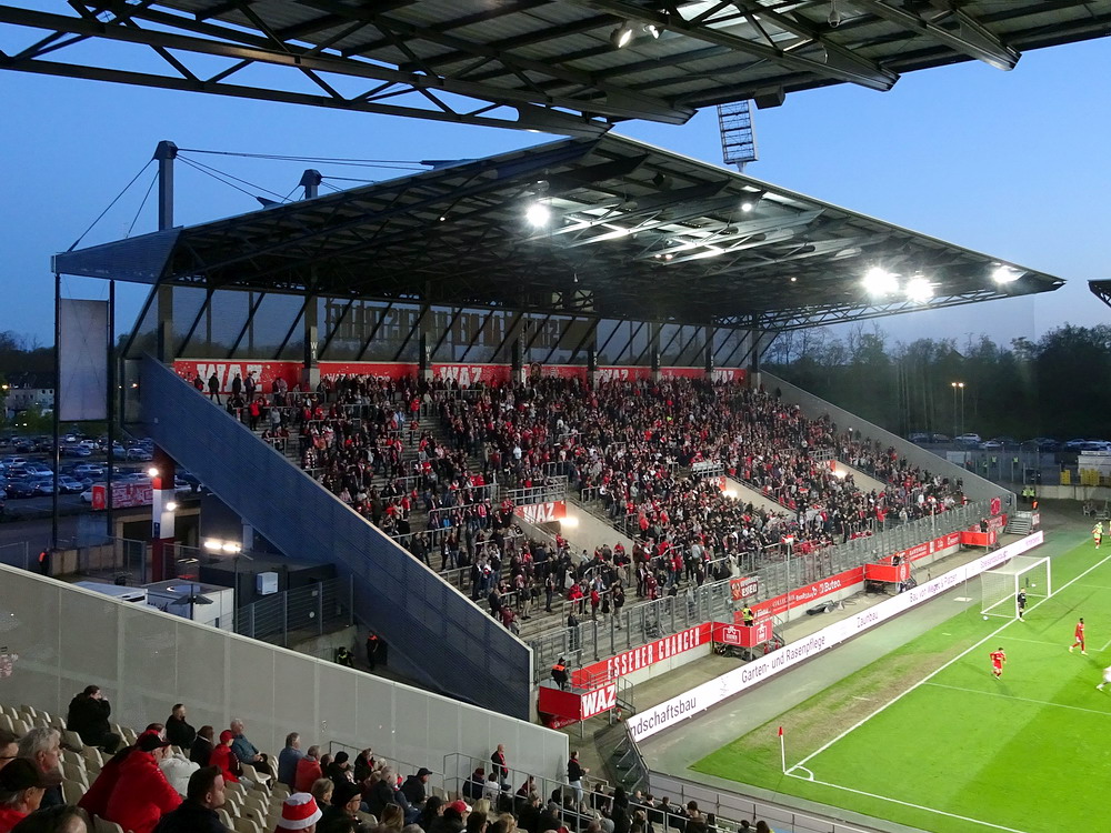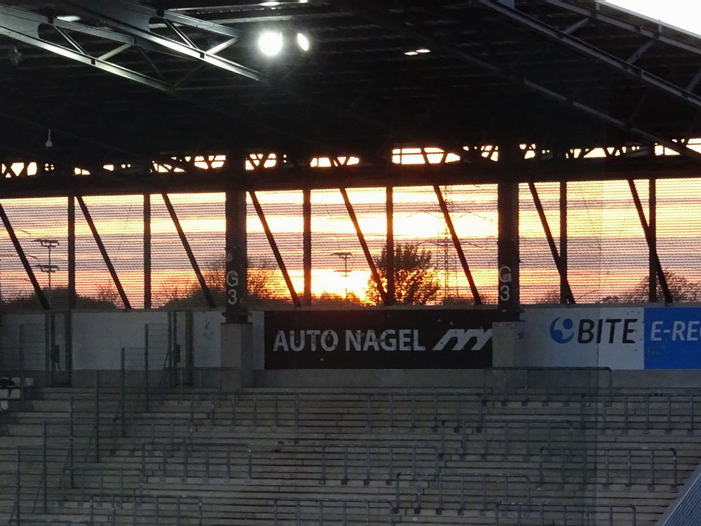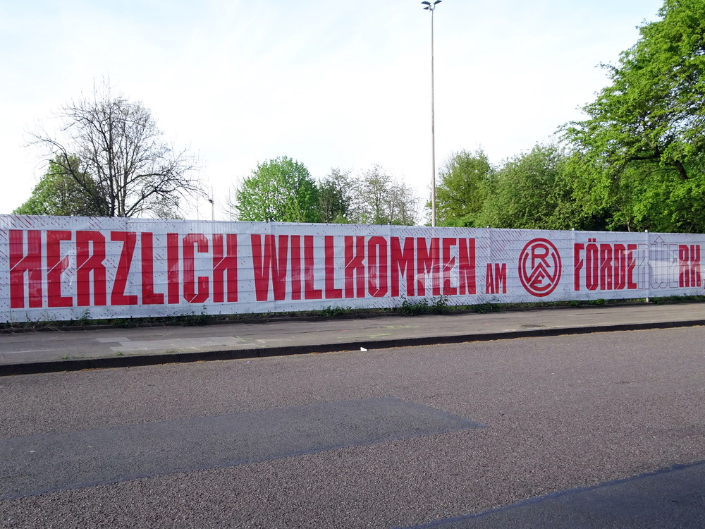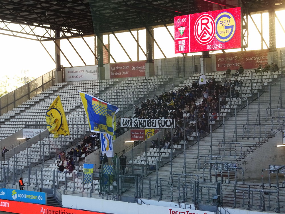 Doch der SVW hatte direkt die Gelegenheit zum Ausgleich, aber Wintereinkauf Terrence Boyd, der den für Golz schwer zu haltenden Ball im Nachschuss über die Linie brachte, stand bei der Schussabgabe seines Kollegen im Abseits, so dass der Treffer nicht zählte. Das ging aber im tosenden Jubel erst einmal unter, was natürlich die Stimmung bei den Umsitzenden anfeuerte. Mein Vordermann beharrte darauf, dass es niemals Abseits gewesen sein könne, weil der Ball ja „vom Tormann kam“…. nun ja, was will man da noch sagen?! Nach dem Seitenwechsel wurde es schnell ein Spiel mit offenem Visier und der Waldhof drückte. Zwar wurden die Roten nicht gerade eingeschnürt und kombinierten sich selber immer wieder clever in Richtung Angriffszone, aber die besseren Möglichkeiten hatten die Gastgeber. Aber irgendein Abwehrbein, der wieder bärenstarke Golz, und Unvermögen der Mannheimer konnten den Ausgleich mehrfach verhindern. In der Schlussminute wurde der Ball dann nach einem schlecht ausgeführten Waldhof-Freistoß am Barackler-Sechzehner gewonnen werden und der nur 17 Sekunden vorher eingewechselte Leo Vonic traf zur Entscheidung. Nahe der Waldhof-Kurve eine Jubeltraube zu bilden, erwies sich als schlechte Idee, denn Voelcke bekam irgendeinen Gegenstand vor die Runkel und ging zu Boden, konnte aber nach kurzer Behandlung weiter machen. Mit dem Auswärtssieg besteht weiter die Option nochmal in den Kampf um Platz drei einzugreifen. Man fühlt, dass der RWE-Anhang mit der Saison zufrieden ist, Mannschaft und Fans bilden eine echte Symbiose. Alles was jetzt noch kommt ist Bonusmaterial, vielleicht ist die Unbefangenheit ein Trumpf, mit dieser kann aber auch mindestens der Mitbewerber aus Münster aufwarten. Coach Dabro bleibt für mich ein Rätsel. Irgendwie scheint der aktuell alles richtig zu machen, dabei gibt es in Sachen personeller Aufstellung und Auswechselungen immer noch Luft nach oben. Taktik und im Laufe eines Spiels erforderliche Systemumstellungen scheinen aber aktuell perfekt gewählt, in diesem Bereich hat er massiv an Erfahrung gewonnen. Ich bleibe weiterhin entspannt gespannt.