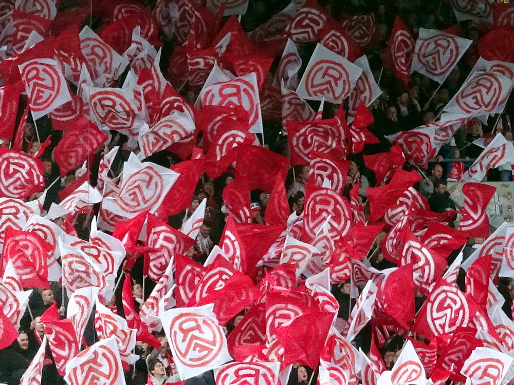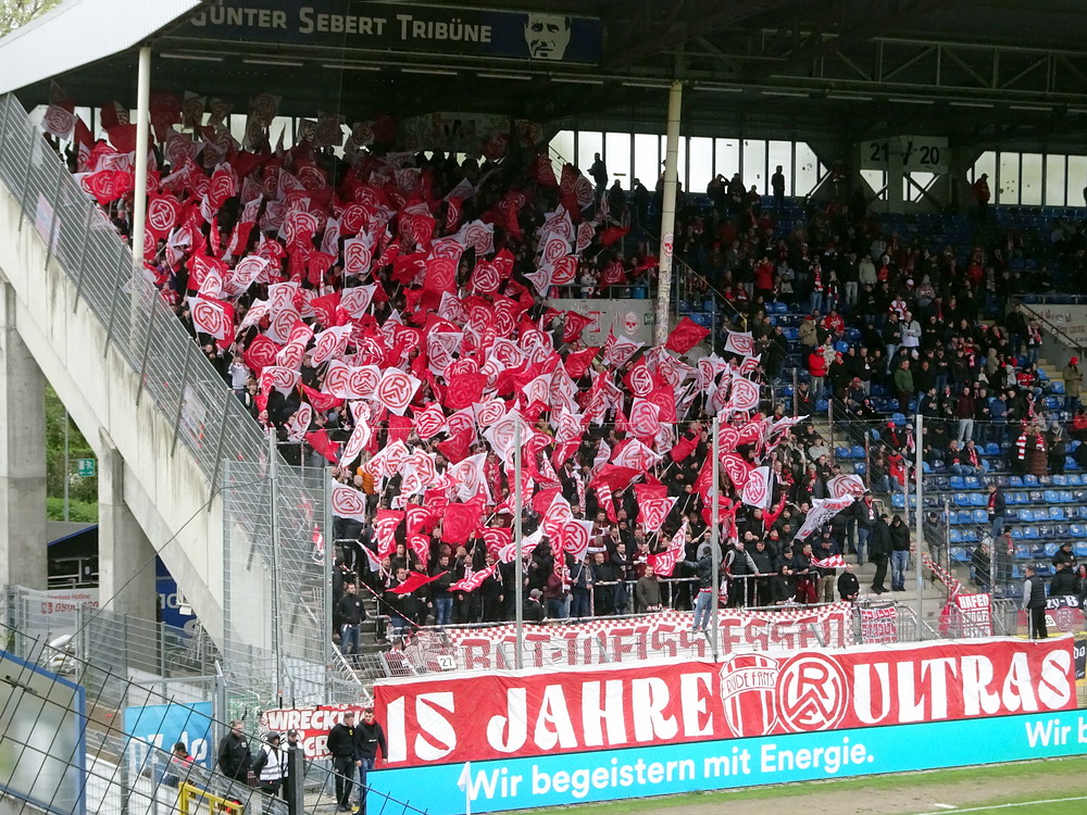 Es soll keine Moralpredigt sein und die derben Sprüche schockten mich ja letztlich auch nicht wirklich. Ich war ja auch vorher schon mal beim Fußball, aber teilweise war das echt zum Fremdschämen. Bei der Überlegung, ob ich mich an der Hafenstraße in emotionalen Situationen wohl auch so verhielte, konnte ich das klar verneinen – für meine Person besteht also offensichtlich noch Hoffnung. Fußball ist kein Bällchenbad und ich lege am Eingang auch die guten Sitten ab, aber das war einfach unterste Schublade. Beim vermeintlichen Ausgleichstreffer rastete mein Nebenmann derart aus, dass er sich gar nicht lange mit der Freude über den Treffer aufhielt, sondern sich einfach mit gestrecktem Mittelfinger und irrem Blick am rot-weissen Anhang im Stakkato wild „Ihr Wichser!!“ schreiend abarbeitete. Und zwar so hingebungsvoll, dass mein wohlwollend gemeinter Hinweis auf die Abseitsposition des Waldhof-Stürmers auch erst nach der fünften Wiederholung realisiert wurde und er sich dann wortlos ernüchtert abwandte. Der RWE-Anhang startete mit einer zweigeteilten Geburtstags-Choreo zum 15jährigen Bestehen der „Rude Fans“. Zuerst wurde ein Meer von kleinen Fähnchen mit RWE-Logo geschwenkt und dann noch eine Blockfahne hochgezogen. Die ‚Ultras Mannheim‘ stürmten nach Problemen beim Einlass – im Eingangsbereich hatte sich zunächst eine Polizeieinheit in Kampfausrüstung positioniert, was die Waldhof-Ultras zum vorrübergehenden Boykott animierte – erst mit Spielbeginn in den Block. Der glorreiche RWE spielte eine starke Anfangsviertelstunde mit der Chance zur Führung, aber dann kam der Waldhof in die Partie und erarbeitete sich ebenfalls Möglichkeiten. Kurz vor dem Seitenwechsel gingen die Roten aber nach einem Durcheinander im Barackler-Strafraum in Folge eines Freistoßes in Führung.