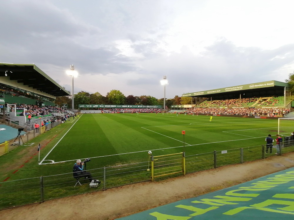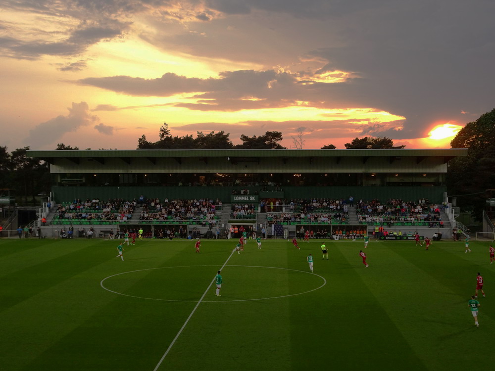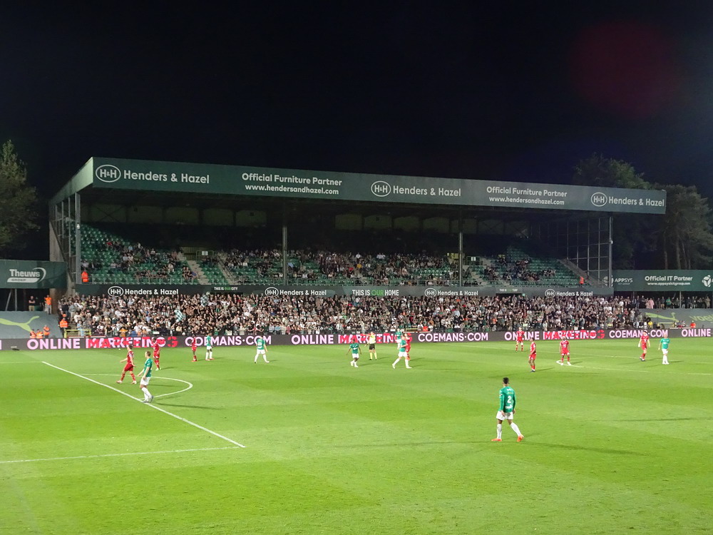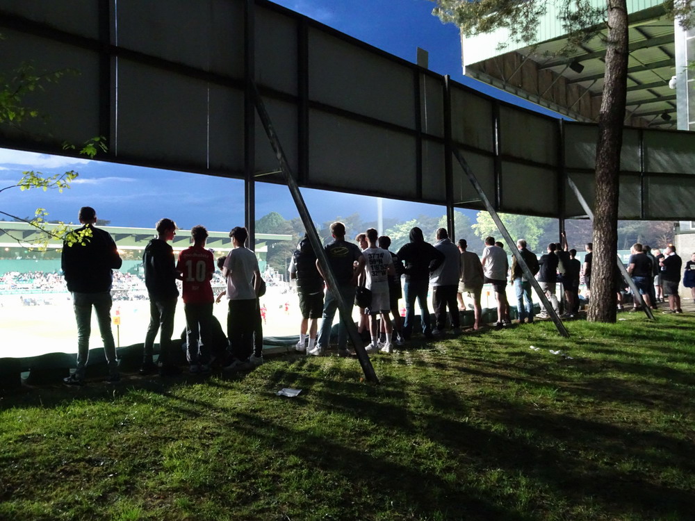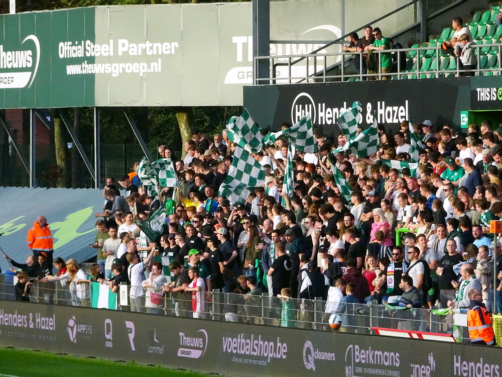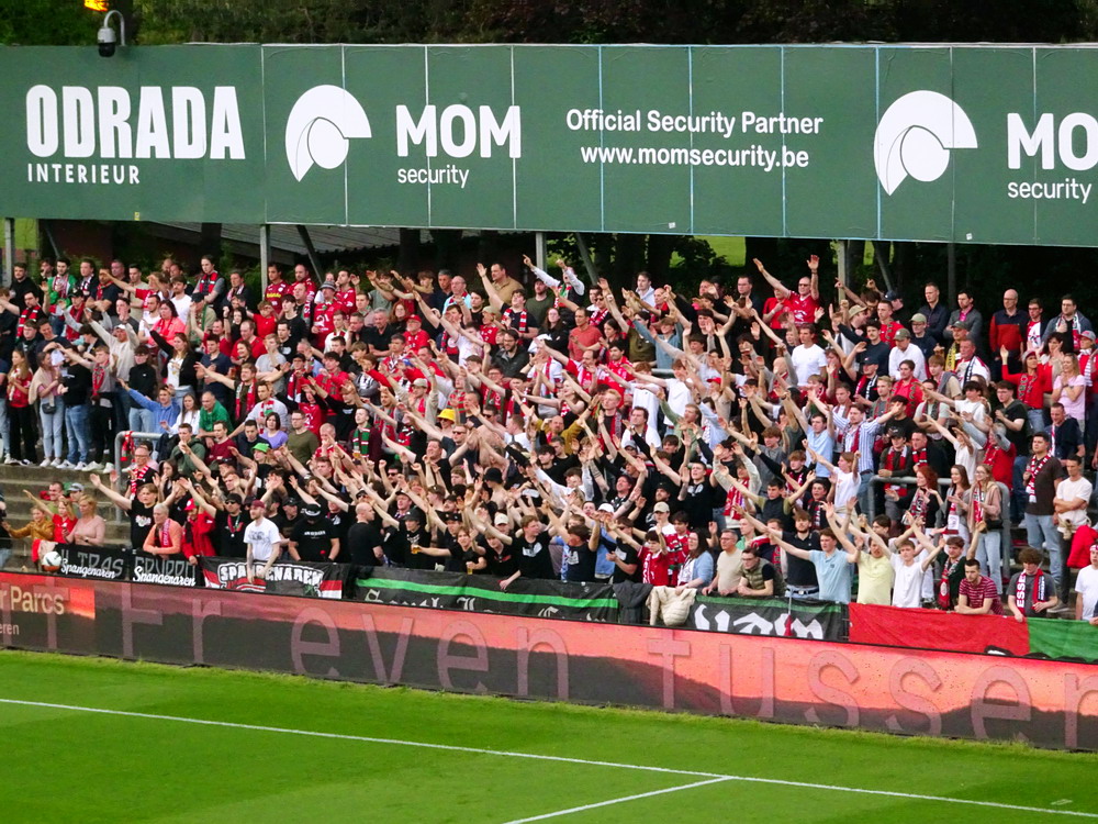 Der Lommel SK, so eine Art ewiger belgischer Zweitligist, schnuppert in dieser Saison am Aufstieg in die Eliteklasse. Zwar hat der Verein die direkte Qualifikation über die ersten beiden Tabellenplätze verpasst, bekommt jedoch über die Relegation eine zweite Chance. Grund genug mal wieder im Soevereinstadion vorstellig zu werden. Zum Zeitpunkt meines ersten Besuchs vor über 15 Jahren trug der Club noch den sperrigen Namen KVSK United Overpelt-Lommel. Nach einer Fusion mit Racing Mol-Wezel heiß der Verein dann Lommel United, bevor er vor einigen Jahren seinen heutigen Namen erhielt. Um nun den Aufstieg zu realisieren, musste zunächst im Halbfinal-Rückspiel der SV Zulte aus Waregem bezwungen werden, der im Vorjahr aus der ersten Liga abgestiegen war. Nach einem Remis im Hinspiel war ein Sieg zwingend erforderlich. Dieser gelang auch mühsam, aber nicht unverdient, mit dem knappsten aller möglichen Resultate durch einen Treffer eine Viertelstunde vor dem Ende. Der mitgereiste Anhang, etwa 400 Leute, reagierte wenig erfreut und machte den eigenen Spielern das auch deutlich. Die Fans der Gastgeber feierten den Einzug in die Endspiele dagegen überschwänglich. Der Sieger dieser Ausscheidung spielt dann eine finale Runde gegen den Drittletzten der ersten Liga um einen Platz in eben jener. Über viertausend Zuschauer wurden heute im Soevereinstadion begrüßt und damit gut viermal so viele wie in den gewöhnlichen Ligaspielen.