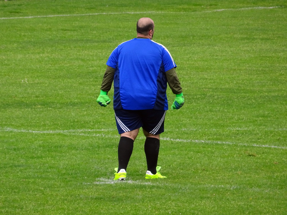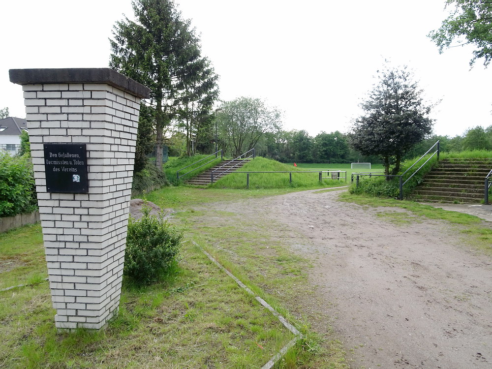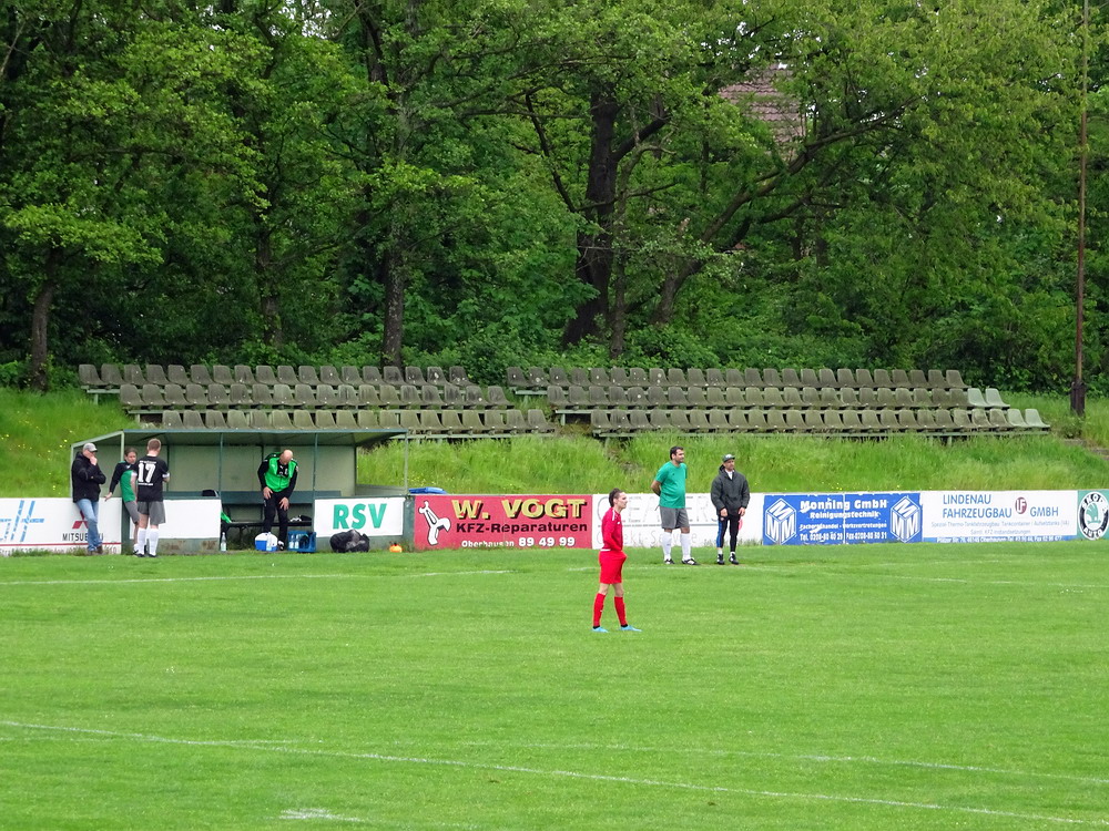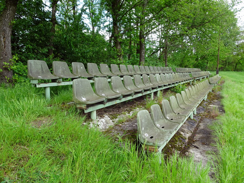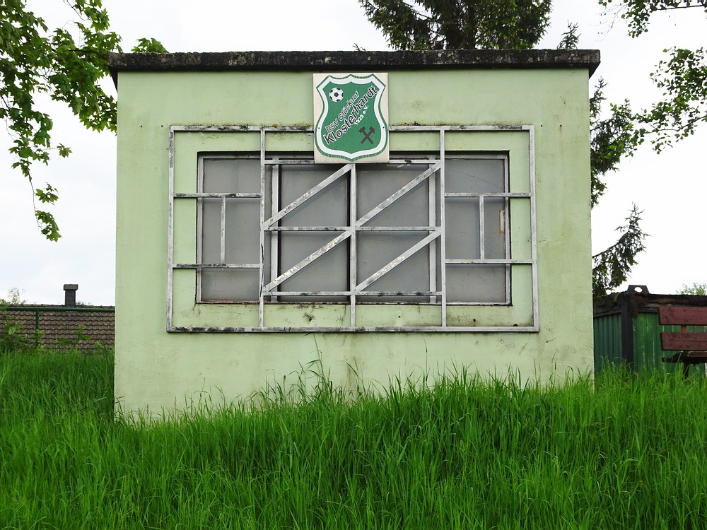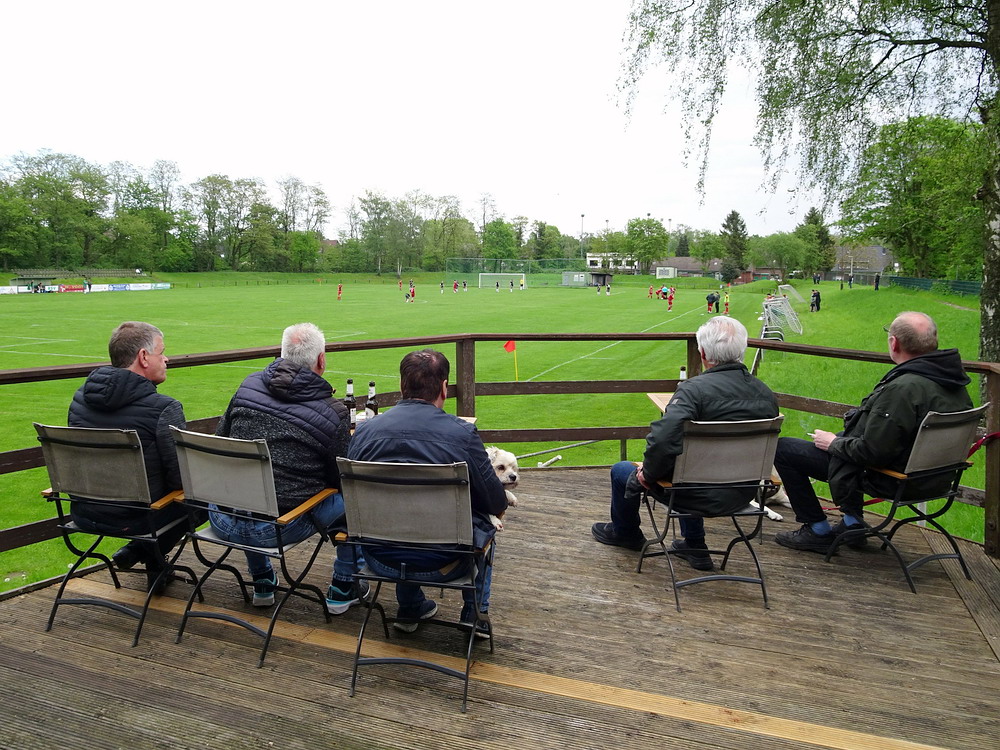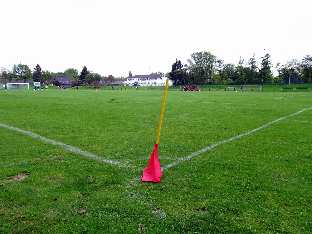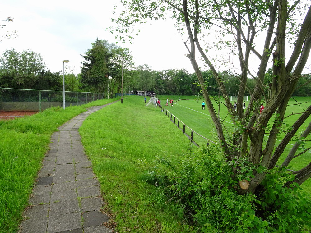 Es wurde mal wieder die blutige Basis des Amateur-Fußballs aufgesucht. Um dem Hanielstadion in Oberhausen Klosterhardt die Aufwartung zu machen, war das unvermeidlich, denn der dort ansässige Club RSV Glückauf hat lediglich eine Seniorenmannschaft und diese geht dem Versuch, den Fußballsport auszuüben, in der Kreisliga C nach. Ein wenig Eile war ja nun auch geboten, denn da mit der Altherren-Garde überhaupt nur noch eine weitere Mannschaft am Spielbetrieb teilnimmt, besteht allergrößte Gefahr, dass der Verein bald überhaupt nicht mehr auf der Ligen-Landkarte auftaucht. Bei genauerer Betrachtung der Aktiven lag auch der Verdacht nicht fern, dass der heutige Spieltags-Kader mit einigen Akteuren aus der Altherren-Truppe aufgefüllt wurde. Spielerisch war es natürlich hartes Brot – einige Teilnehmer hatten nicht nur Probleme mit mangelndem Talent, sondern auch mit dem eigenen Körperumfang. Aber das Spiel war ja eigentlich auch Nebensache und der Grund für die Anreise stattdessen diese schöne, kultige Spielstätte. Der Rasenplatz wird komplett von einem weitläufigen, begrünten Wall umgeben. Auf einer Seite gibt es drei Reihen mit Sitzschalen, die von einer wunderbaren Patina überzogen sind. Unterhalb der Sitze und auch auf der anderen Seite des Spielfeldes gibt es ein paar flache, breite Stufen, die aber aufgrund des etwas zu hohen Grases kaum zu erahnen waren. In einer Ecke befindet sich auf dem Wall ein kleiner Ausschank mit vorgelagerter Terrasse.