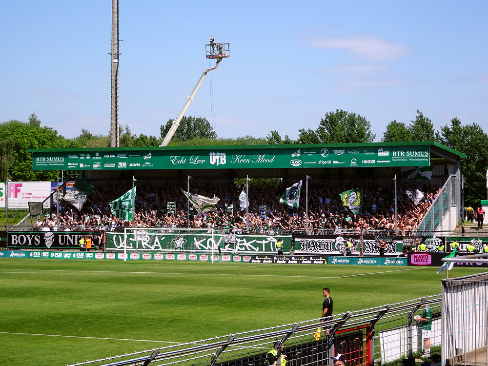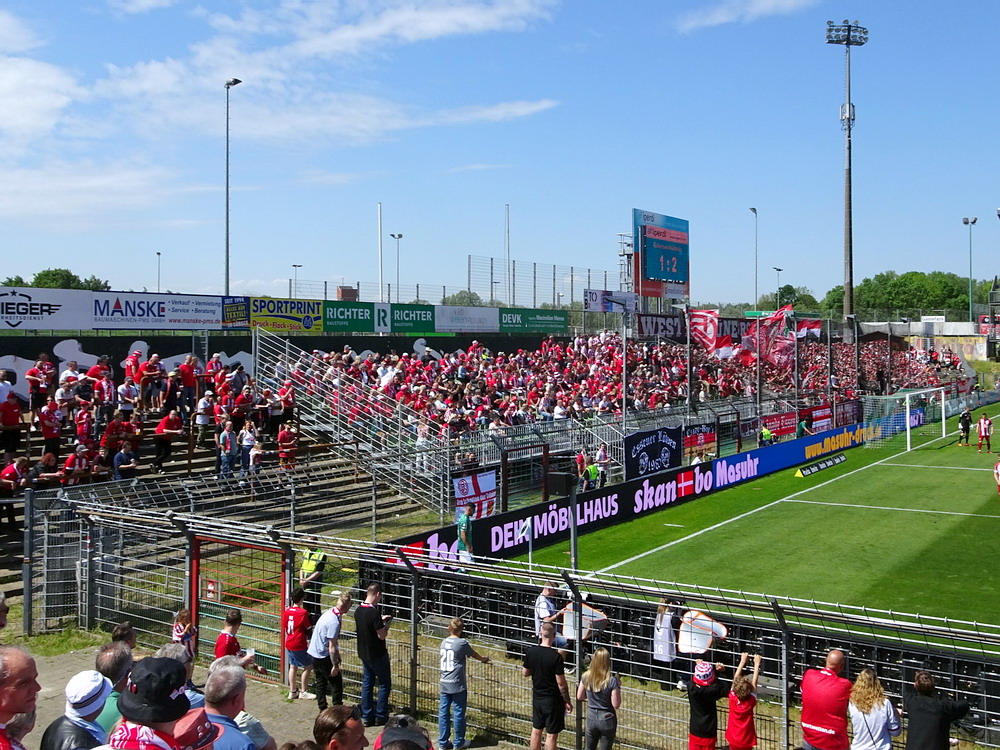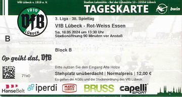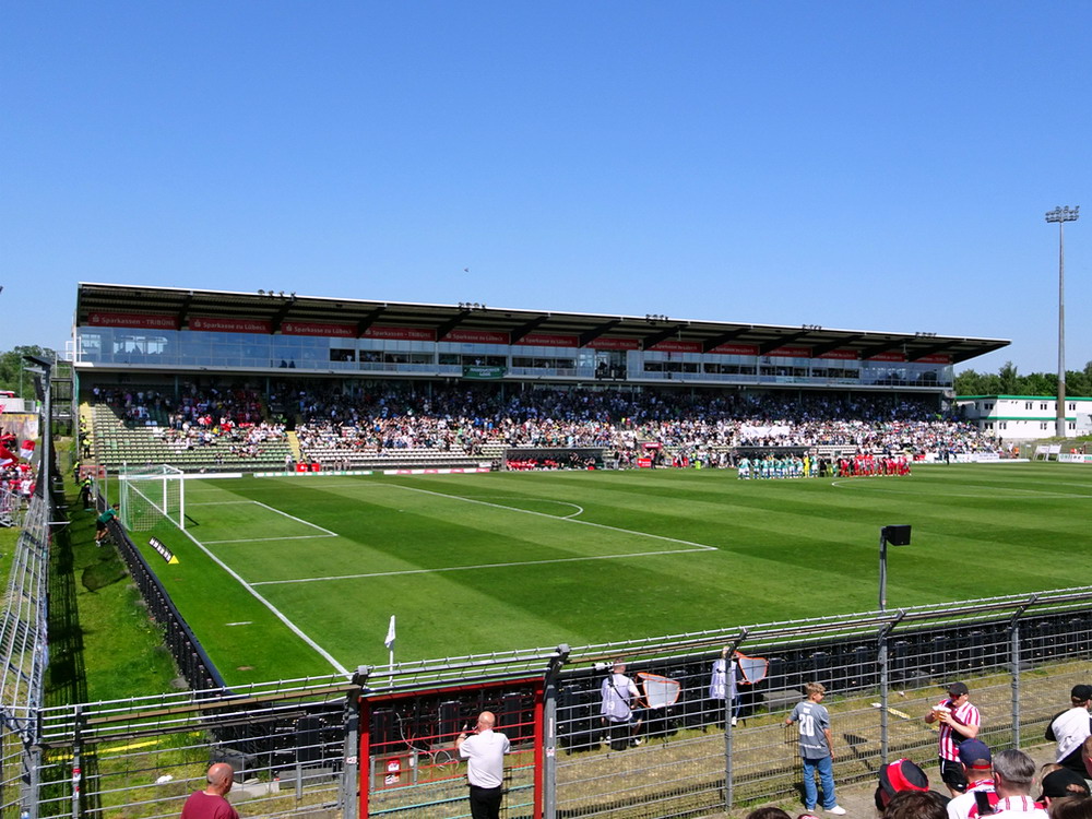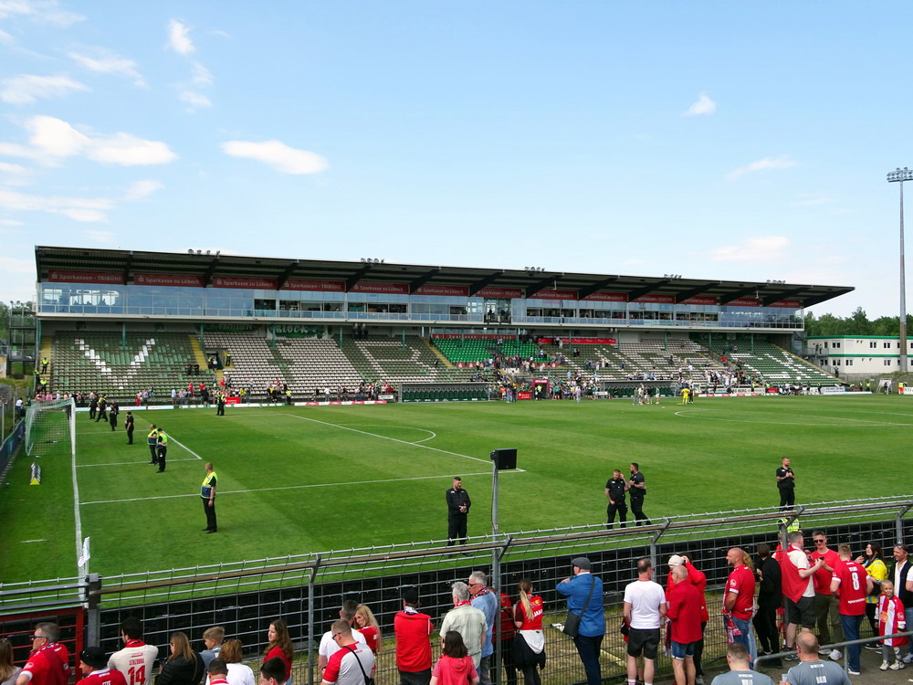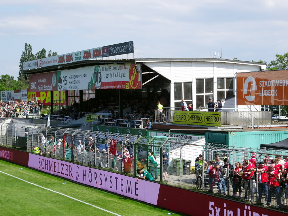 Das letzte Saisonspiel führte den glorreichen RWE in die Marzipanstadt, genauer gesagt in das schöne Stadion an der Lohmühle, dessen Prunkstück natürlich die alte Holztribüne ist. Ungeachtet der Tatsache, dass die Chance auf das Erreichen des vierten Tabellenplatzes eher noch theoretischer Natur war, nahmen knapp 3.000 Rot-Weisse den Weg an die Ostsee auf sich. Im Spiel offenbarte sich mal wieder die größte Baustelle und die ist und bleibt das Defensiv-Verhalten. Mit 53 Gegentreffern beendet der RWE die Saison mit den zweitmeisten Gegentreffern unter den ersten zehn Teams der Tabelle. Viele Gegentore fielen nach unnötigen Ballverlusten im Spielfeld-Drittel vor dem eigenen Tor. Auch der bis zum Erbrechen exerzierte technik-basierte Spielaufbau aus absolut jeder Lage, sorgte nicht nur für ausreichend gefährliche Situationen, sondern auch für Gegentore. Der Grund dieser Spielweise ist nachvollziehbar, denn jeder lange Hub birgt die hohe Gefahr des Ballverlustes, aber unter Druck die Kirsche auch einfach mal per Langholz hinten rauszufeuern, hätte einige Notlagen erspart. Der VfB ging nach früh in Führung – wie konnte es anders sein, natürlich nach einem zwanglosen Ballverlust vor dem Sechzehner. Es dauerte aber nur zwei Zeigerumdrehungen bis Vonic den Ausgleich erzielte. Die Roten spielten aber weiter viel zu sorglos und Mitte der ersten Spielhälfte gingen die Gastgeber erneut in Führung. Nach einem Eckstoß wurde der Ball nicht sauber geklärt und von einem VfB-Spieler vom Sechzehner mit Gewalt zentral ins Tor gewuchtet. Schnapper Golz, der in der ersten halben Stunde irgendwie ungewohnt indisponiert wirkte, sah dabei nicht gut aus, es war ihm aber wohl auch die Sicht verdeckt. Noch vor dem Seitenwechsel stellte aber erneut Vonic wieder auf Remis, nachdem Eisfeld mit einem brillanten Pass Plechaty auf dem rechten Flügel einsetzte, der punktgenau auf Vonic in Mittelstürmerposition ablegte.