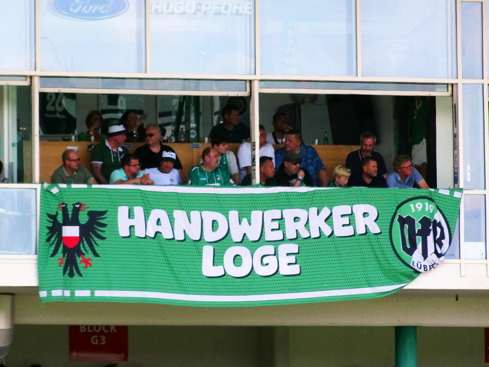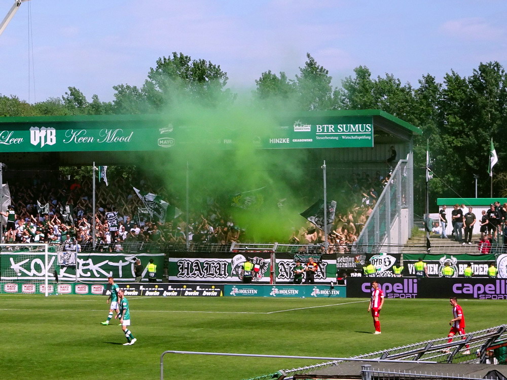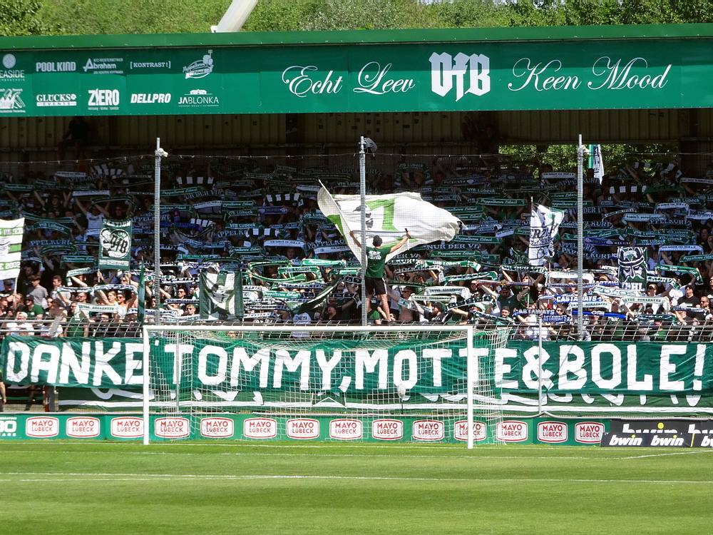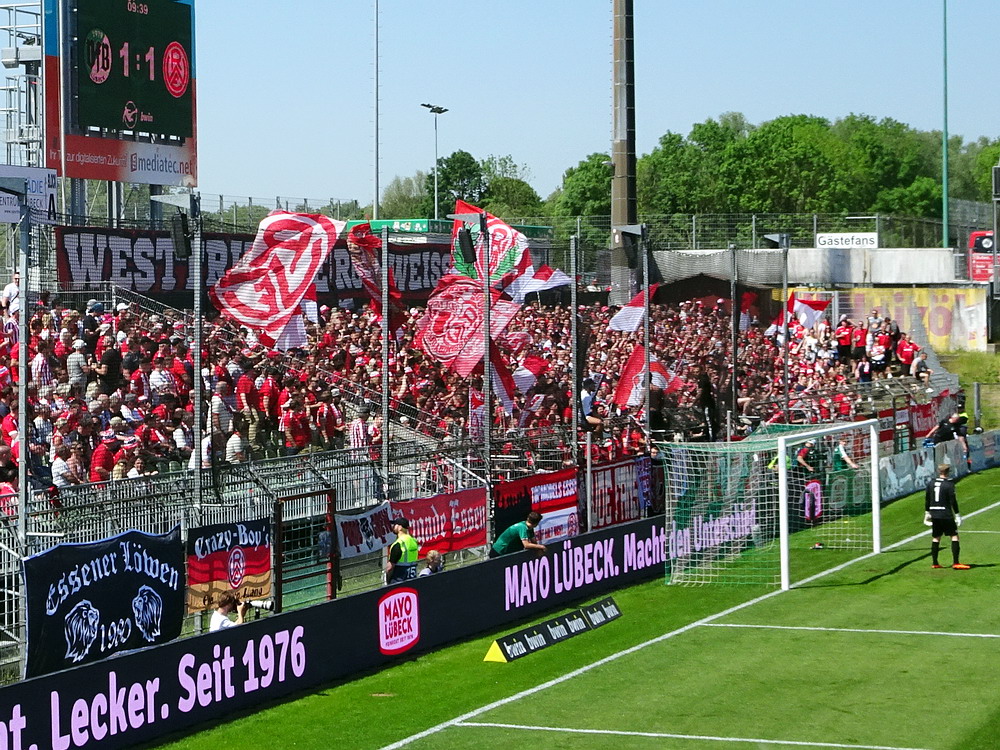 Aber auch nach dem Seitenwechsel blieb der RWE seiner Defensiv-Linie treu und ermöglichte den Gastgebern früh die erneute Führung. Danach plätscherte der Kick ziemlich dahin, ehe Vonic eine Viertelstunde vor dem Ende etwas glücklich mit abgefälschtem Schuss aus gut 18 Metern sein drittes Tor und den Endstand erzielte. Das hauchte der Partie noch einmal Leben ein. Zunächst mühte sich der schon lange als Absteiger feststehende VfB um einen versöhnlichen Saisonabschluss, aber die letzten Minuten gehörten dann nur noch den Roten, denen der Siegtreffer aber auch verwehrt blieb. Verdient wäre es gegen engagierte Gastgeber auch nicht gewesen. Während eine rund um das ‚Ultra Kollektiv Lübeck‘ bärenstark aufgelegte Heim-Kurve – sicherlich durch ein Dach über dem Kopf begünstigt – neunzig Minuten eine Top-Stimmung auf das Grün schepperte, war die Sachlage im rot-weissen Block (wieder einmal) eher mau. Für das an Zahlen gemessen Potential kommt da oft zu wenig. Rund um die aktiven Ultra-Gruppen ist die Mitmachquote einfach gering. Ich kann mir kaum vorstellen, dass es an Unlust der Supportwilligen liegt, kann aber auf der anderen Seite auch beobachten, dass die nicht immer glücklich agierenden Capos der Ultras durchaus versuchen, den ‚gemeinen Pöbel‘ mitzunehmen. Das geling halt zu selten, die gewählten Mittel scheinen nicht das nötige Potential zu bergen und es scheint einen kleinen Graben zwischen der Ultra-Szene und dem übrigen sangeswilligen Volk zu geben. Wie dieser zugekippt werden kann, finden die Parteien hoffentlich schnellstmöglich heraus.